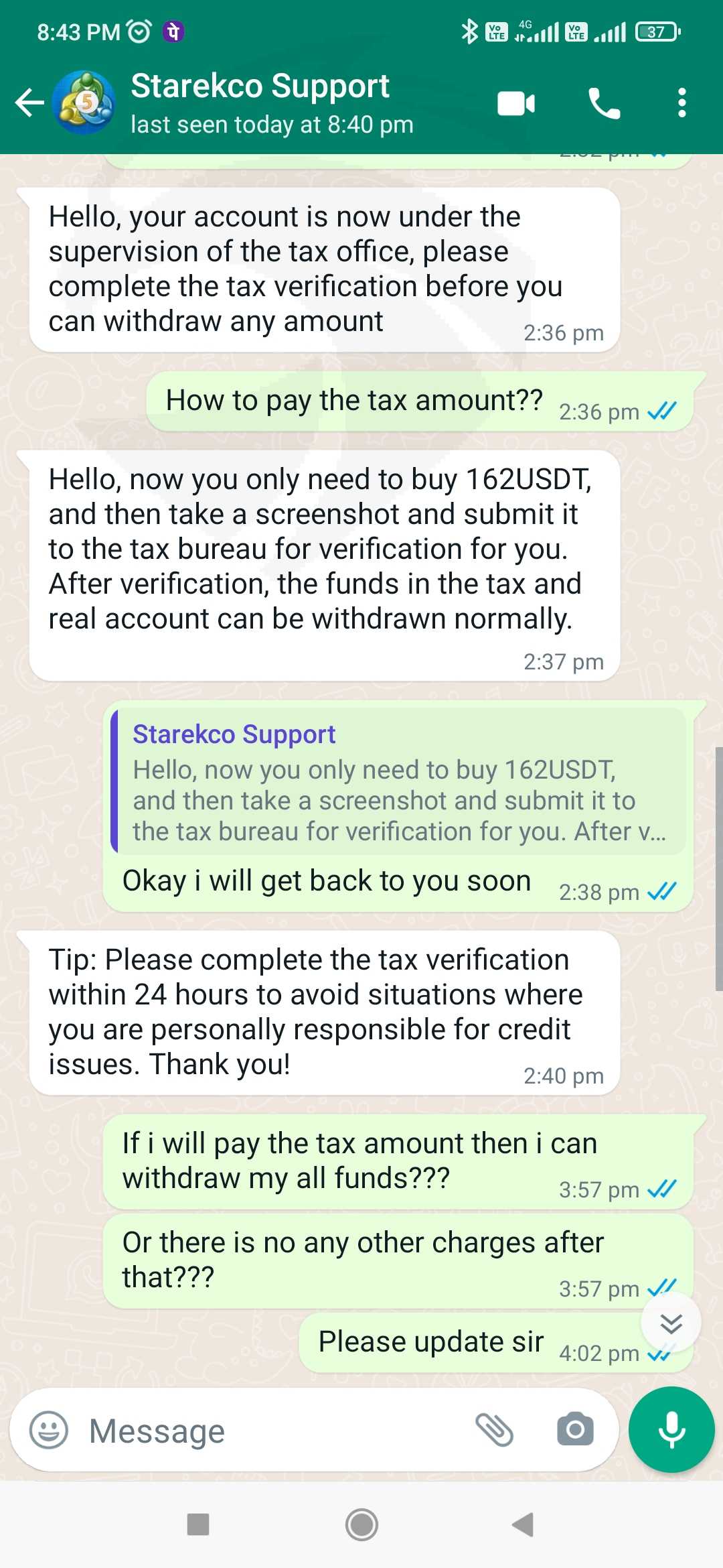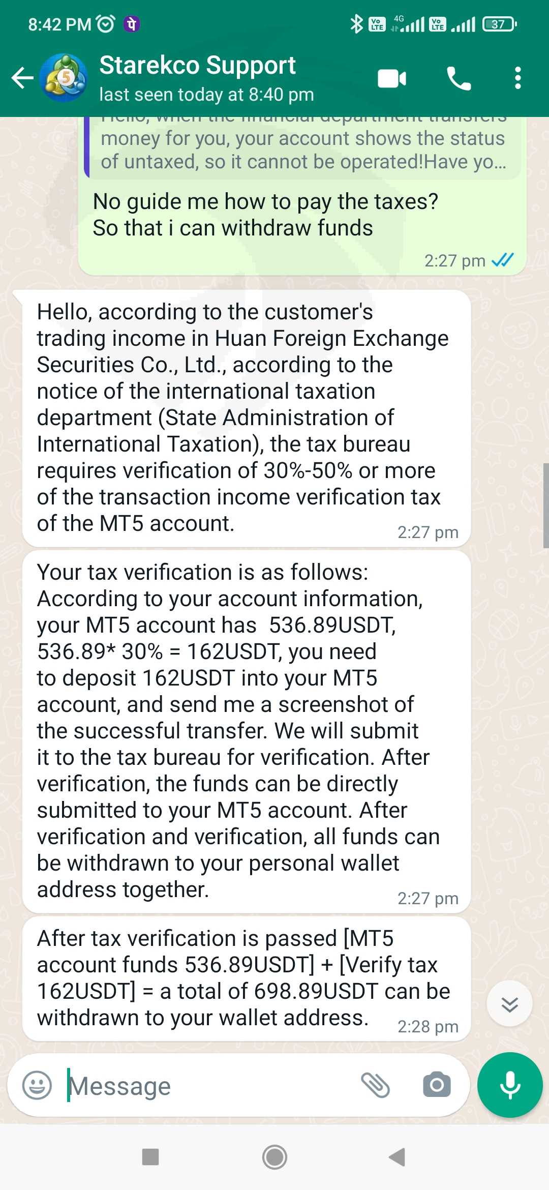 当我试图提取我的资金时,这完全是骗局,他们告诉我要支付总资本30% - 50%的税款,然后你才能提取你的资金,没有人会收取这个金额,这完全是骗局