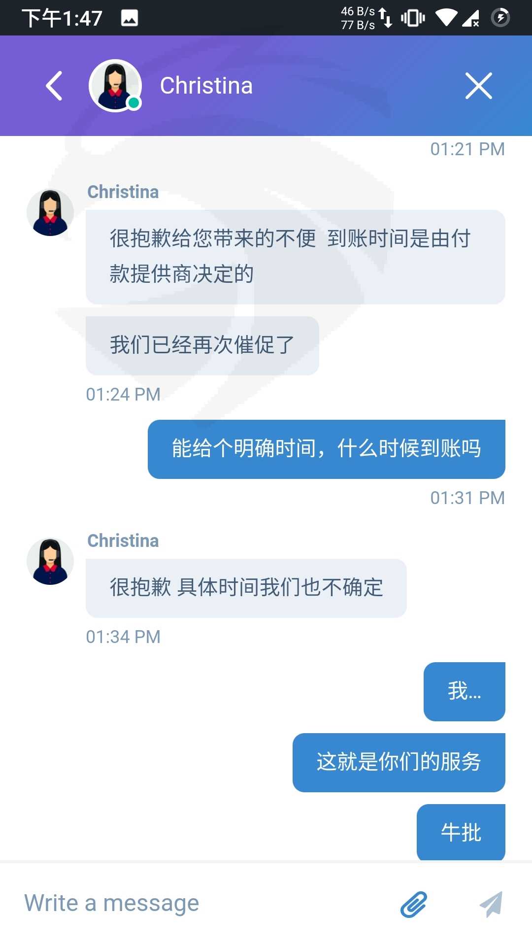 6月22日凌晨4点提起出金申请,严格来说还处在21日的盘,整个白天硬是没有审核处理,到23号下午三点才审核处理,又说要从审核处理算起,1-3天,29号了,过了自己规定的时间,又说支付商速度不同,问什么时候解决,客服竟然说不知道。已经八天了