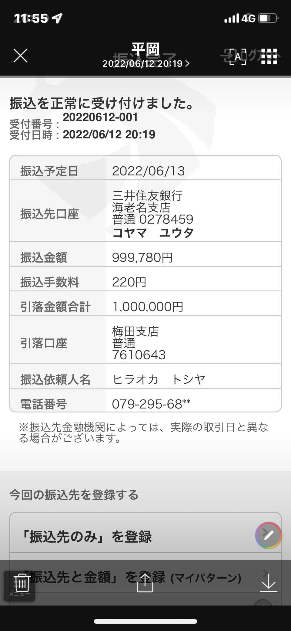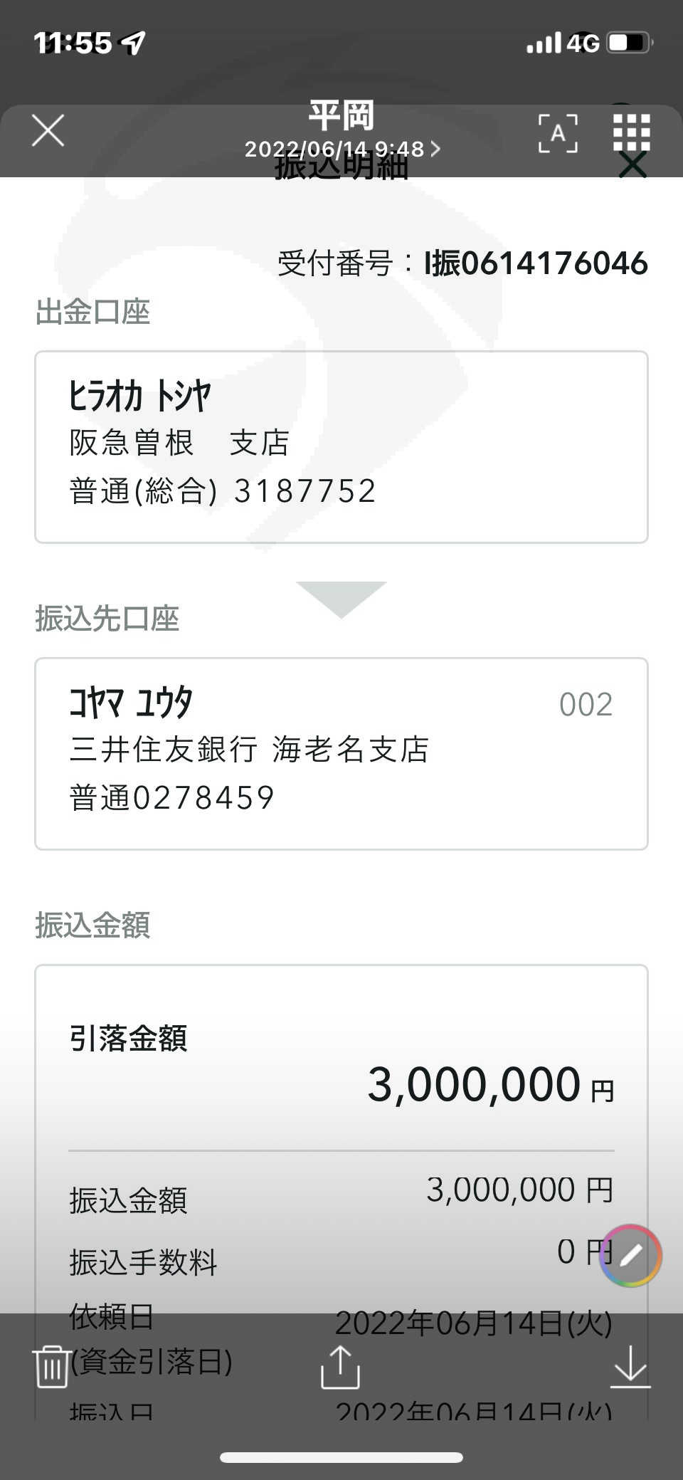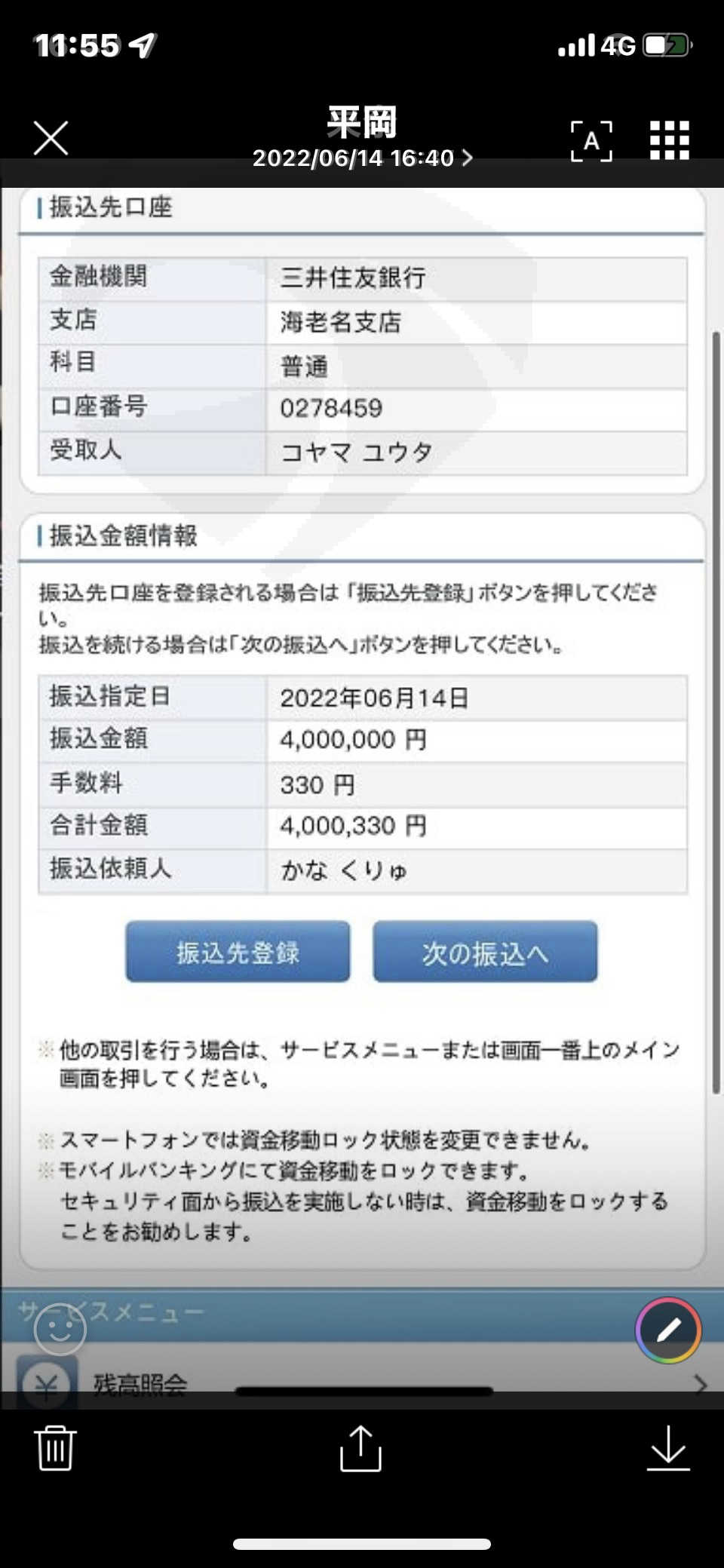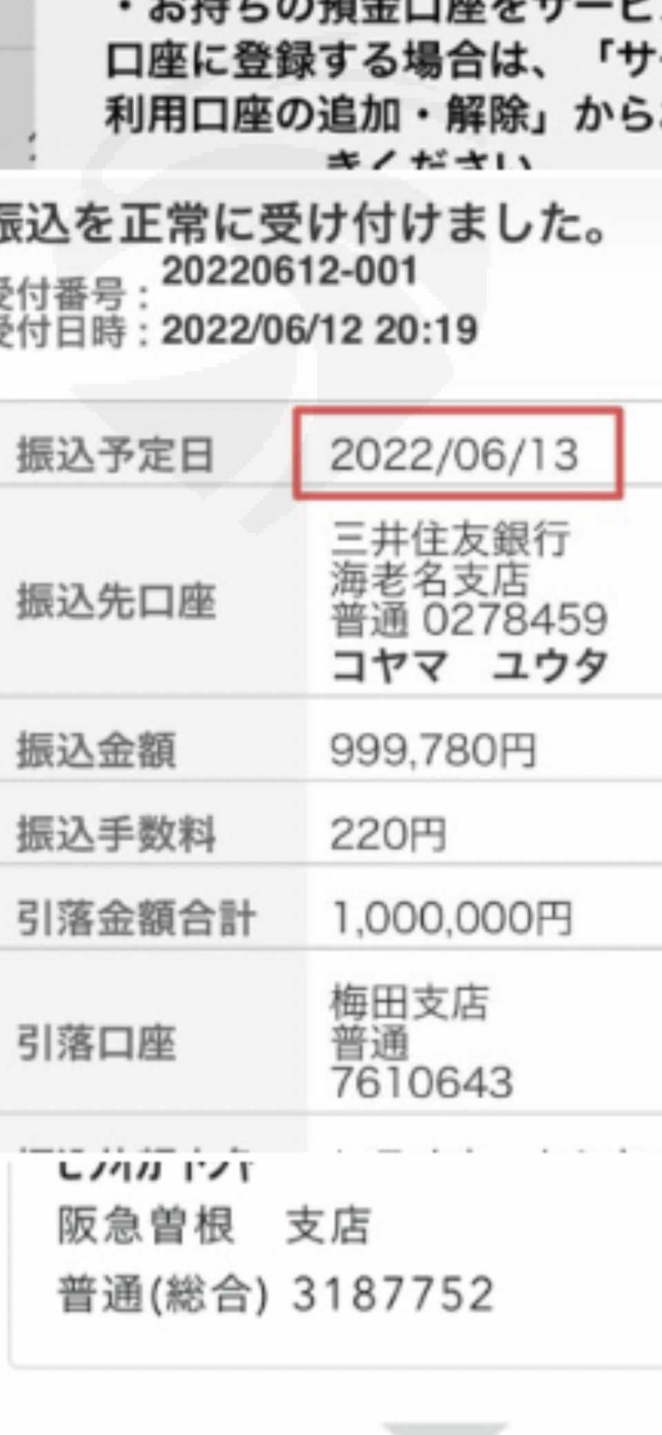最初に10万円 2回目以降は100万円を計5回個人名の口座に振り込み