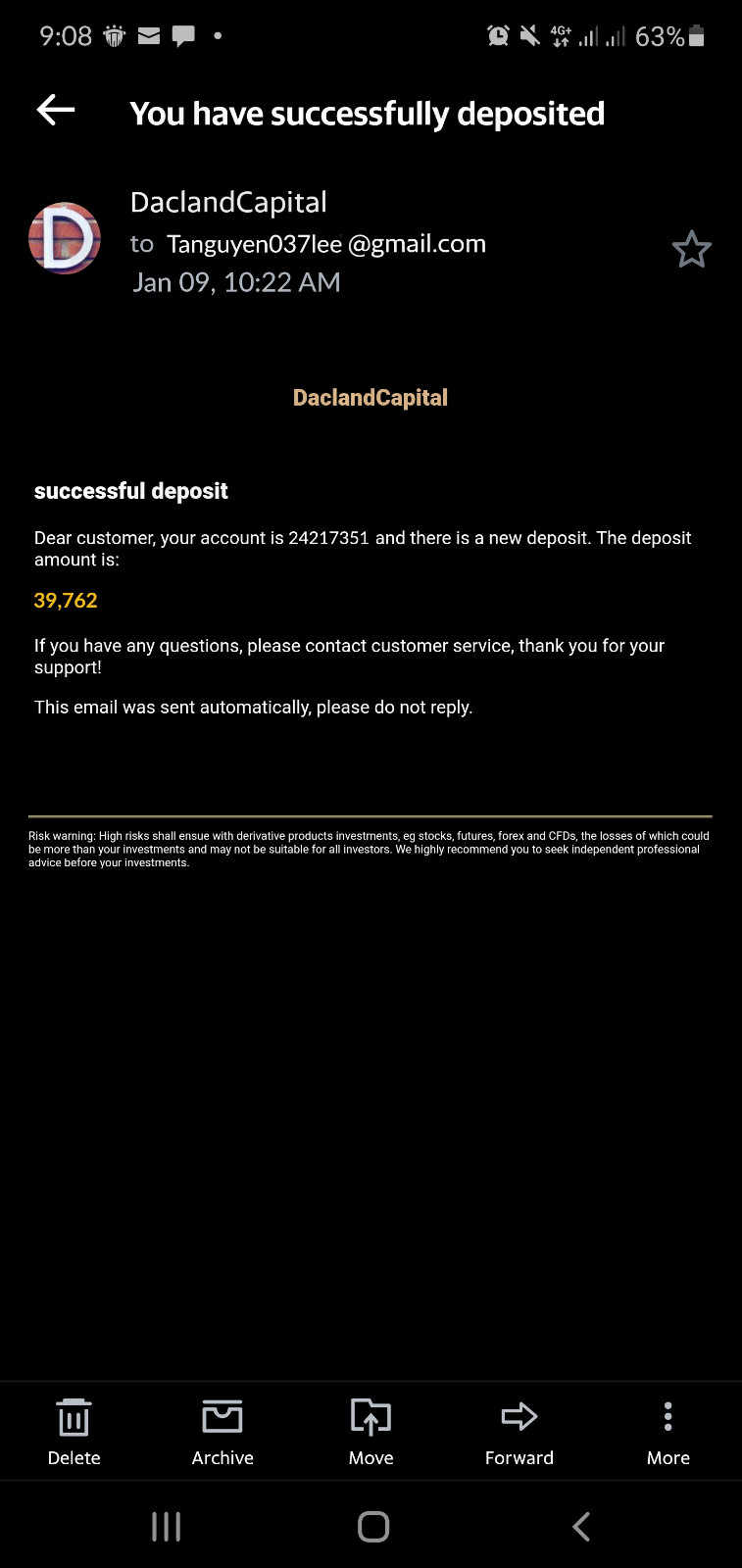 我不信任DACLAND并会建议任何潜在投资者非常认真地考虑给他们任何资金。尽管我要求关闭我的帐户并退还我的钱,但他们继续试图打电话给我进行更多投资,我将其归类为骚扰。我向fca和fintrack/org提出了这个问题。DACLAND作为一个骗局,将我的投资组合余额被退还给了我,但他们仍然试图通过电话与我联系以进行进一步的投资。