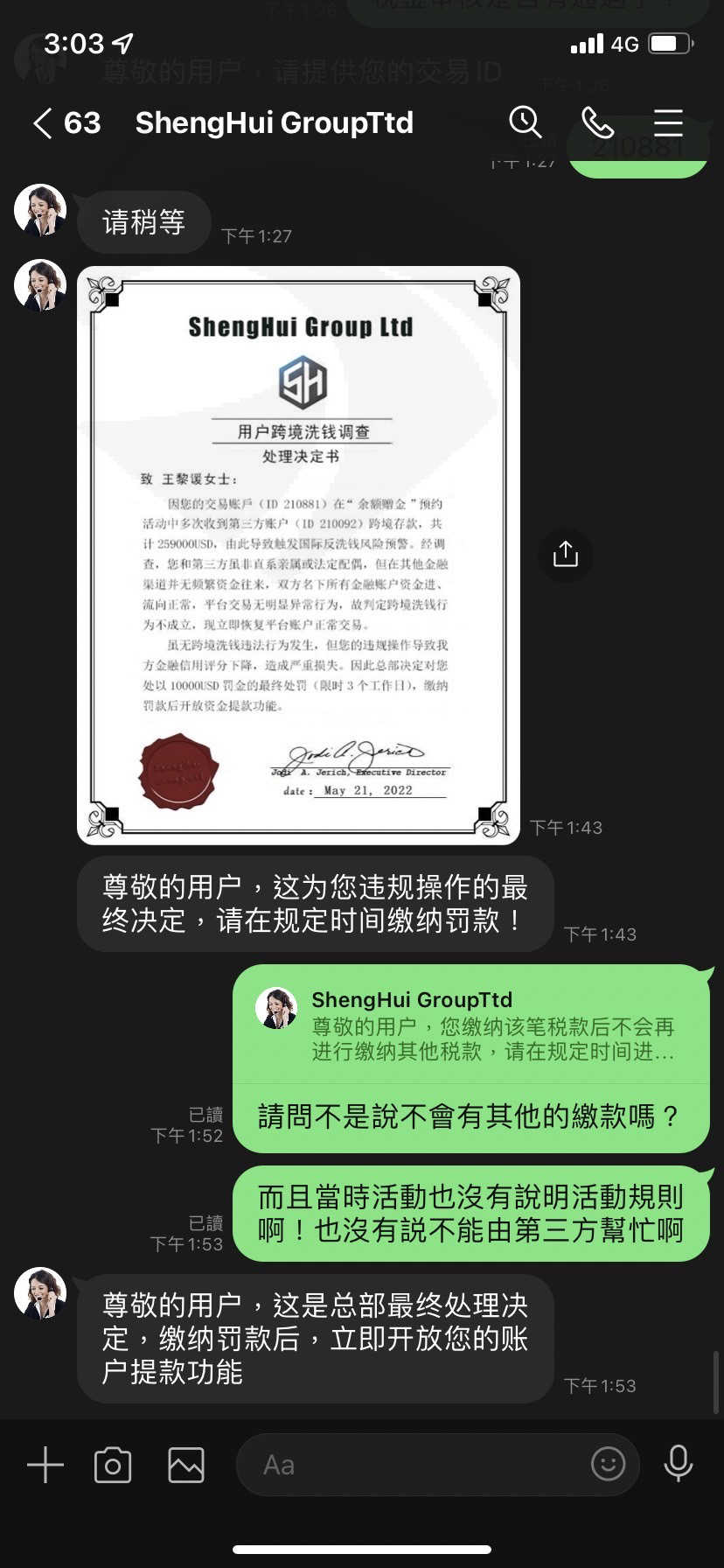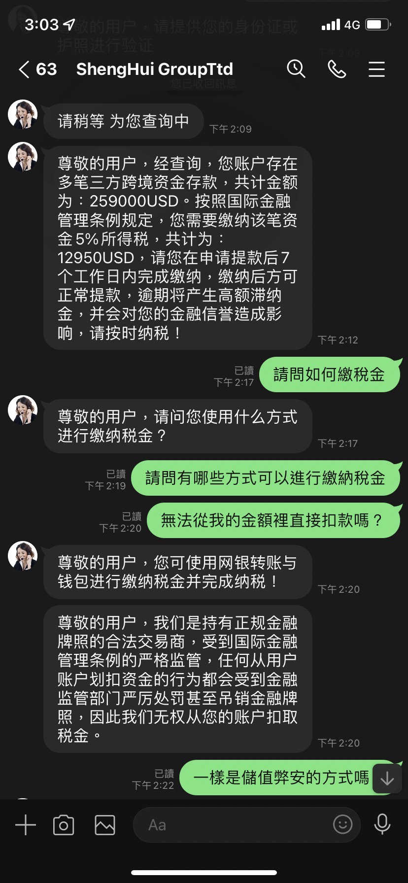 無奈之下我只能繳稅金,也詢問過客服是否只有這一筆繳款,客服也說是,繳完稅金後客服人員卻說總部覺得我有洗錢的嫌疑,但經過調查我沒有洗錢,卻損害他們的名譽,要罰款一萬美金,問題是一開始也沒有告知遊戲規則,然後又說我損害名譽,也拿不出損害名譽的證明,也不知道罰款金額是怎麼算的,我不知道如果繳完罰款後又會拿什麼理由一直要我繳款不給我提款,然後那位網友一直不斷要我投錢進去,還帶有一點威脅,但我真的沒錢也不願意再投錢時,他人也跟著消失了,希望大家不要再跟我一樣受騙