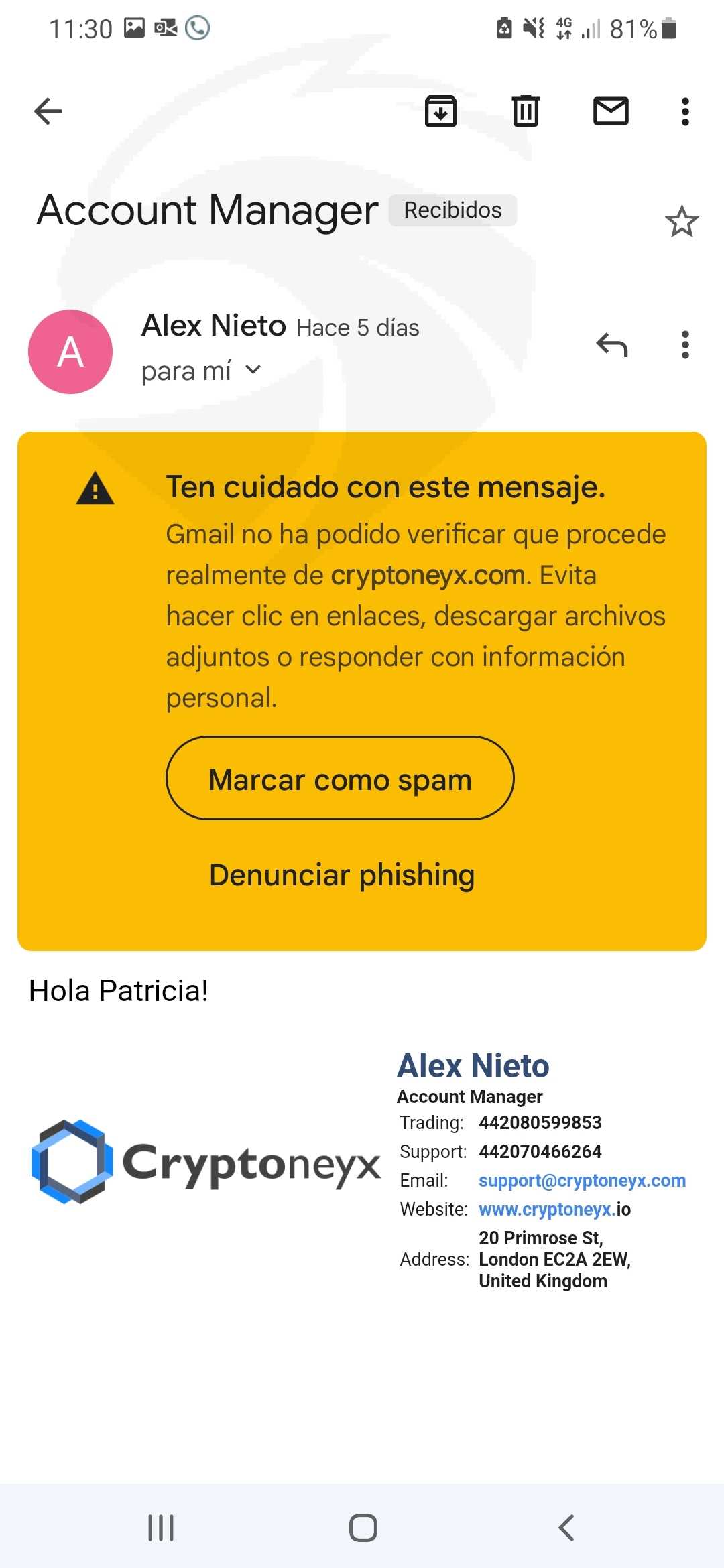 Hice una inversión mínima y ahora quiero retirar mi depósito y ganancias y es imposible. Se pasan la pelota de unos a otros. Te llaman casi todos los días de números internacionales diferentes y diferentes números de móvil.