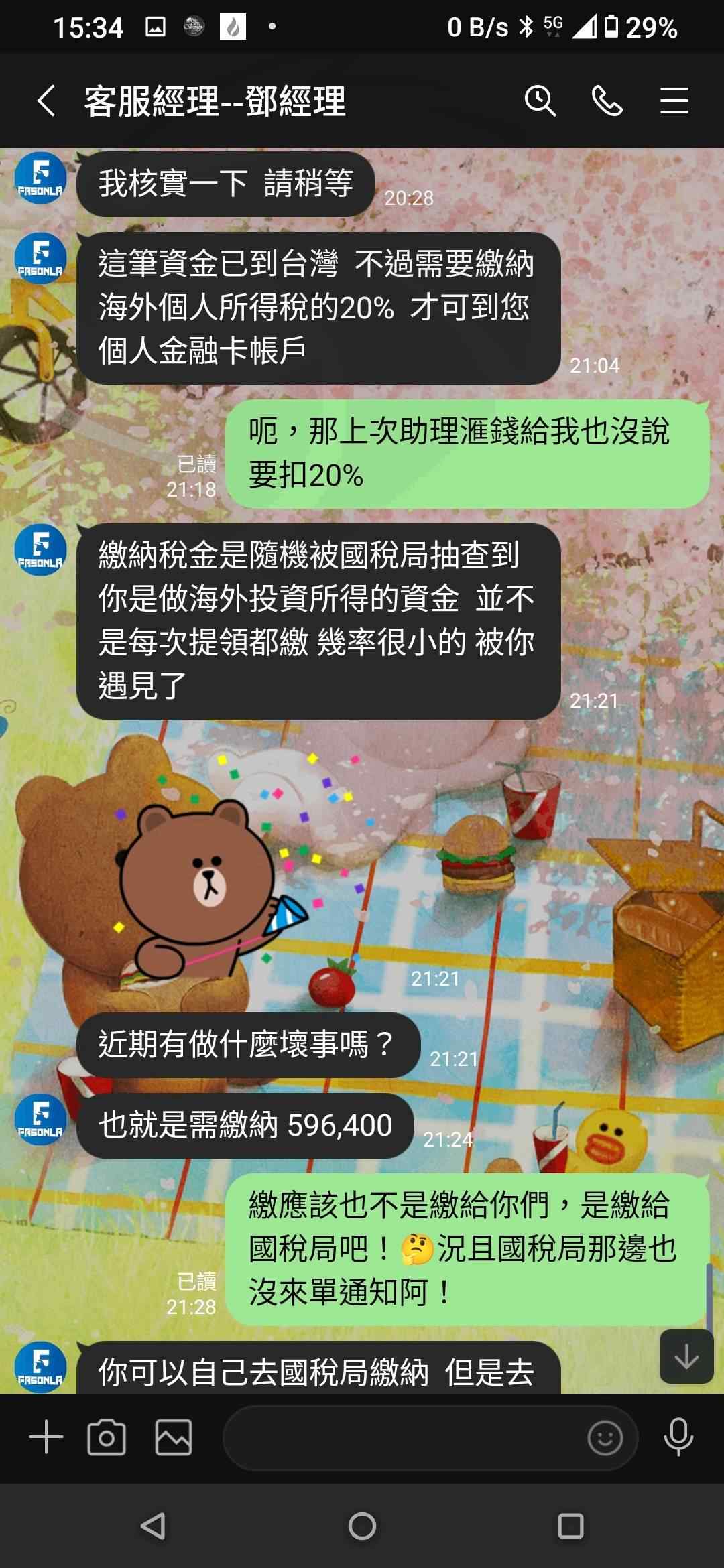 7/21申請出金10萬美金,已滙19萬5千的所謂報酬金給他們(帶你操盤的群組),之後又稱需要付20%的海外所得稅(已查過總所得要超過670萬才需要)才能拿到錢