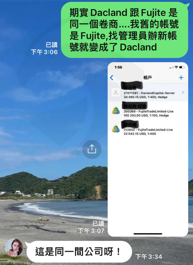 如題….Dacland 與Fujite trade 是同一間公司、同一個網路客服人員,同樣也是一個黑心詐騙平台。出金會找各種理由跟繳一堆費用(稅金、平台管理費、風控風險金)讓交易者領不出錢。最後把帳號凍結….或是直接讓交易者爆倉。