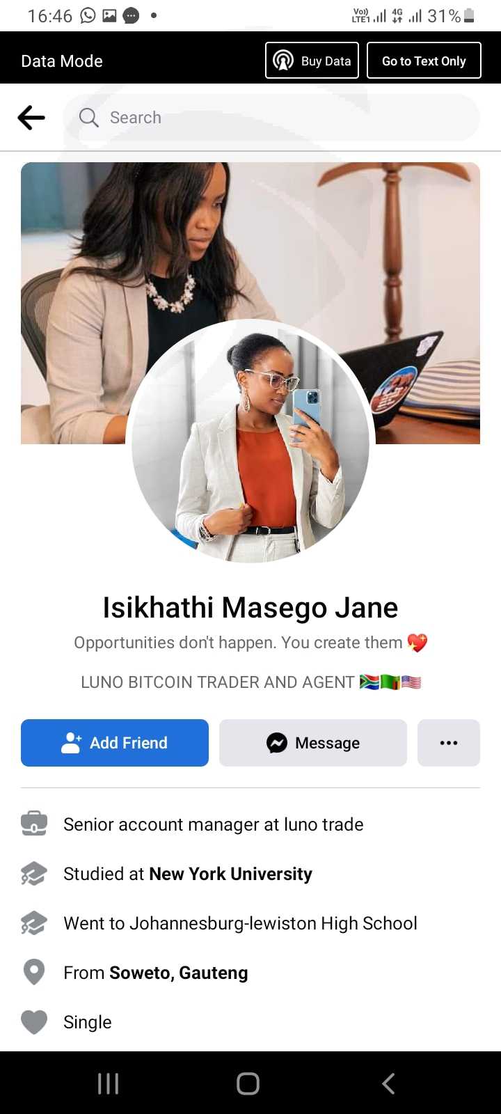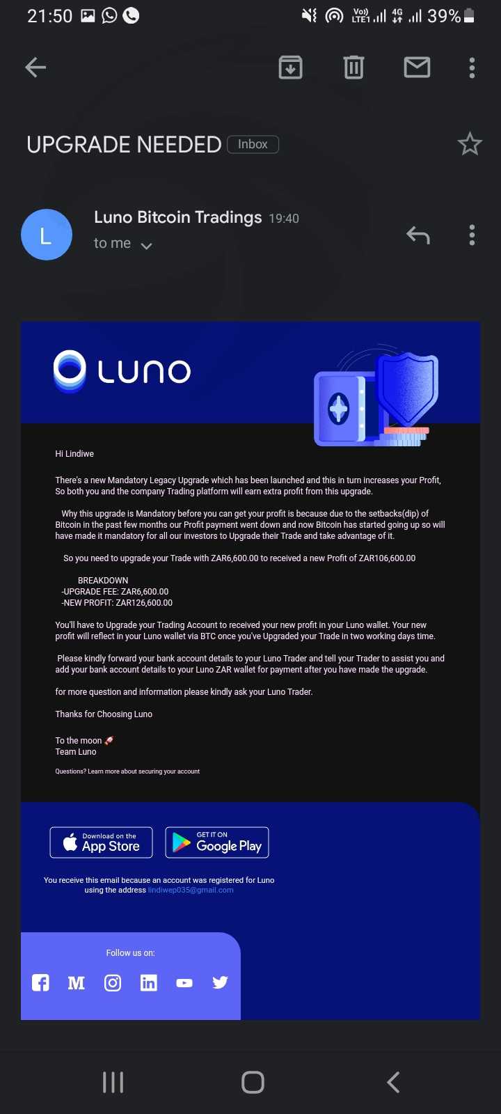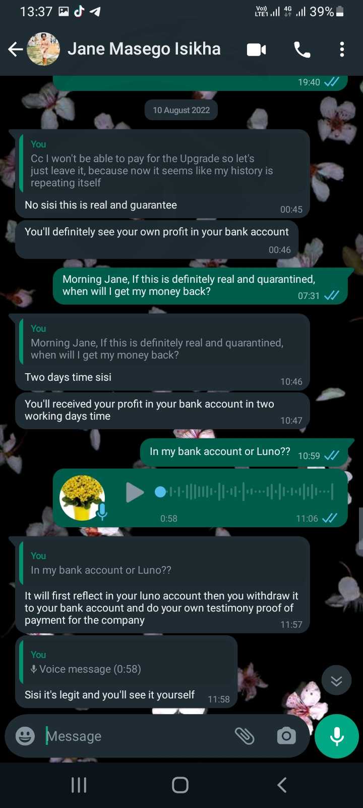 我被一位名叫Jane Masego Isikhathi的女士骗了,当我不得不提款时,我收到一封电子邮件,说我必须用R6600升级我的交易并获得利润,她一直说我将在两个工作日内拿到利润。
