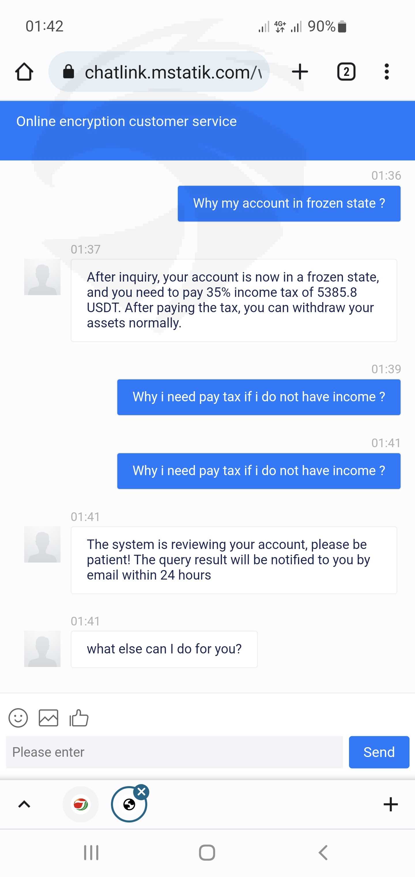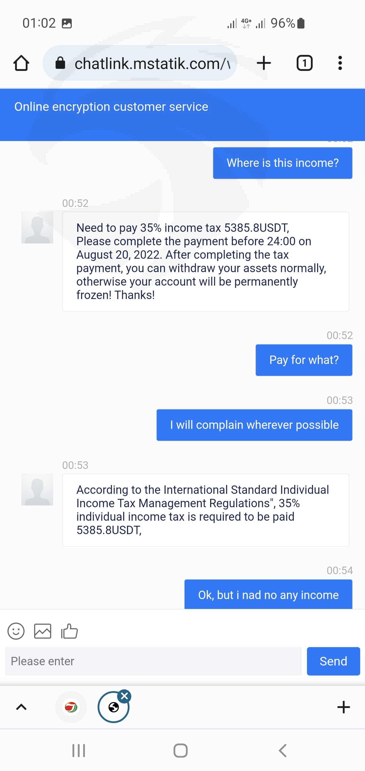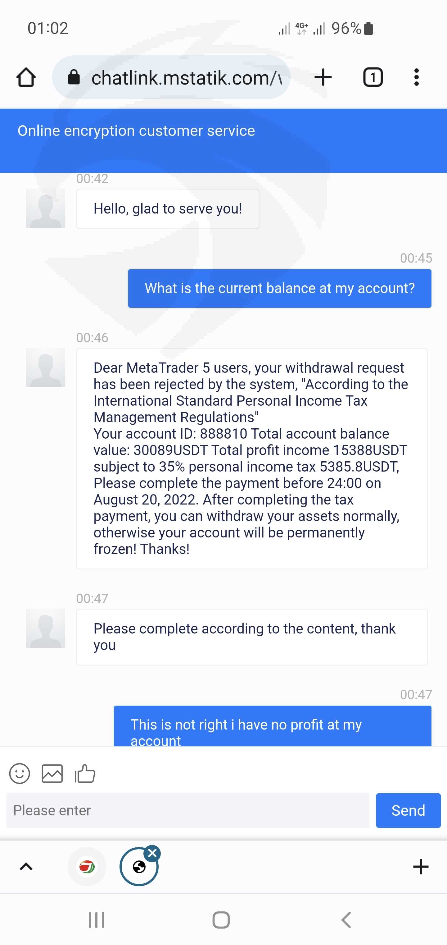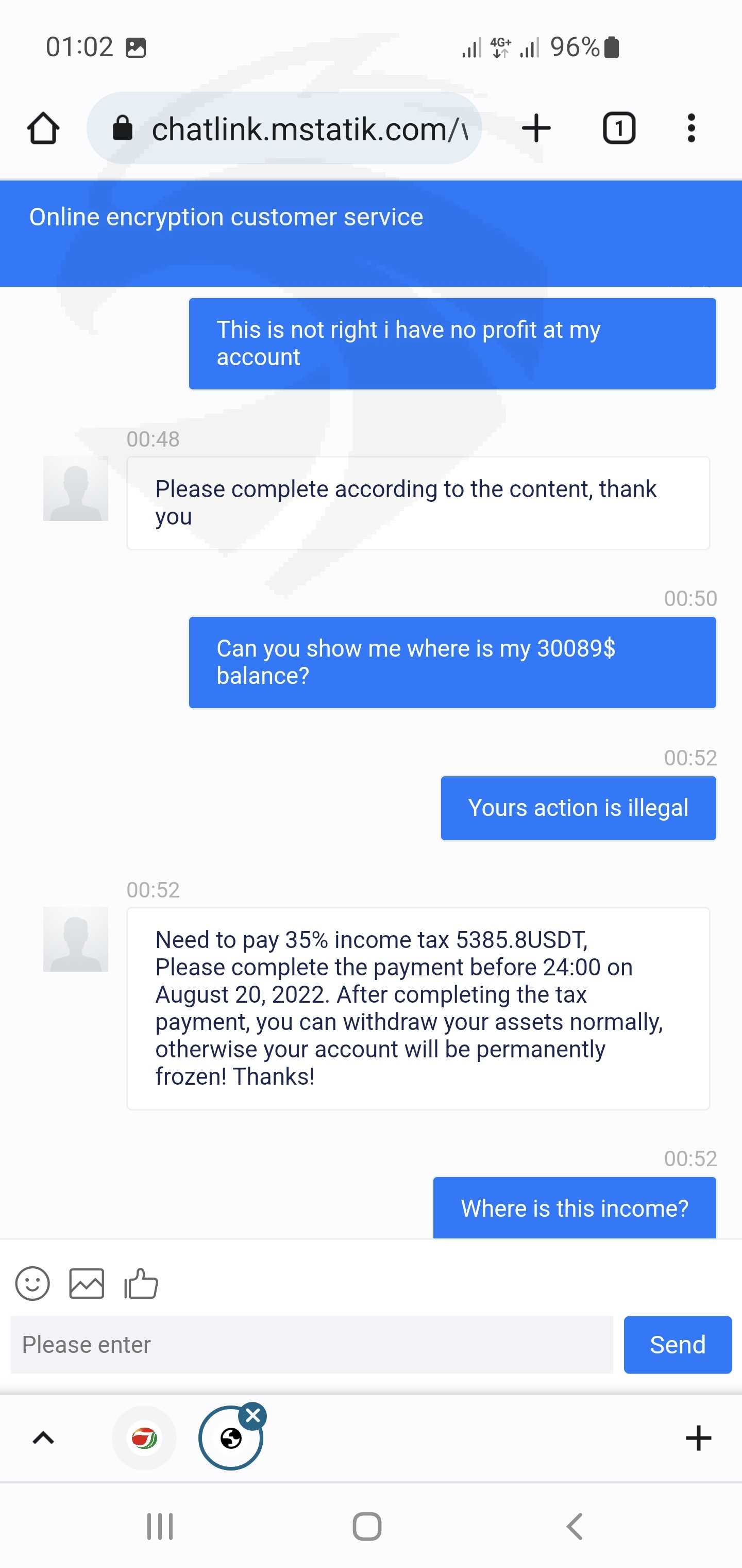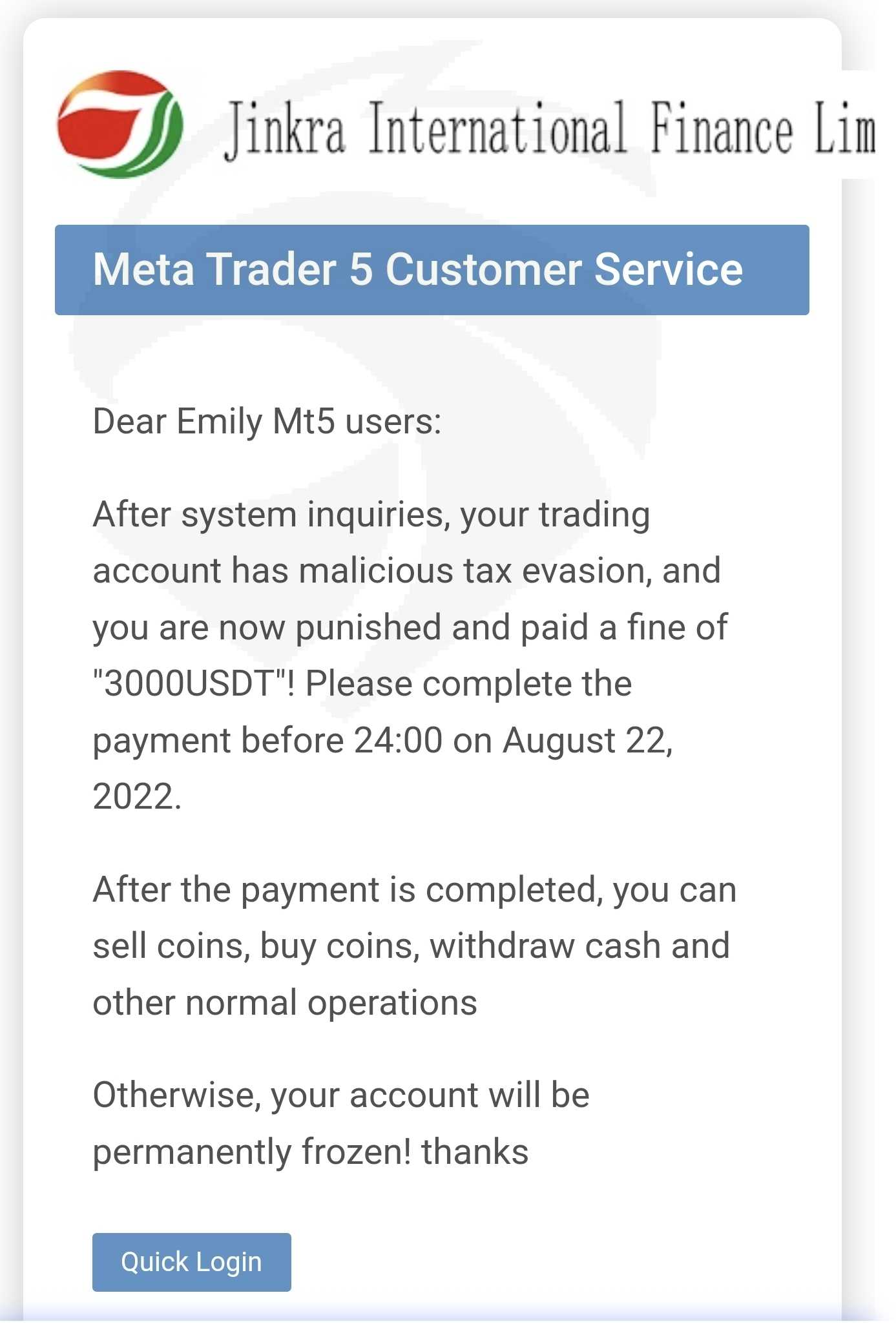 Hello everyone. I want to tell you about the unscrupulous broker Jinkraltd.com. This is a scam platform that does not withdraw funds. After you deposit funds into the platform and try to withdraw a small amount, they withdraw to show that they are working well. But then when you have a small profit, they begin to demand a tax of 35% on profits and do not withdraw funds. I started trading further and my profit became negative -1706$, after that I received a letter from the platform that I was fined 3000usdt and threatened to block my account. Technical support is currently not responding to emails or live chat on the site. Help me get my money back.