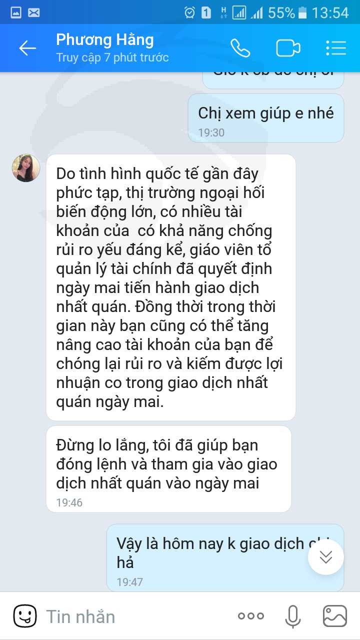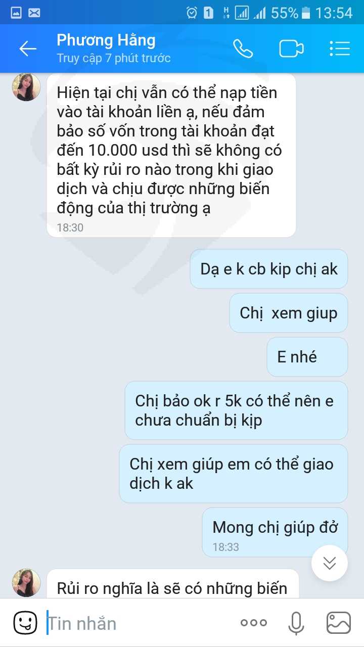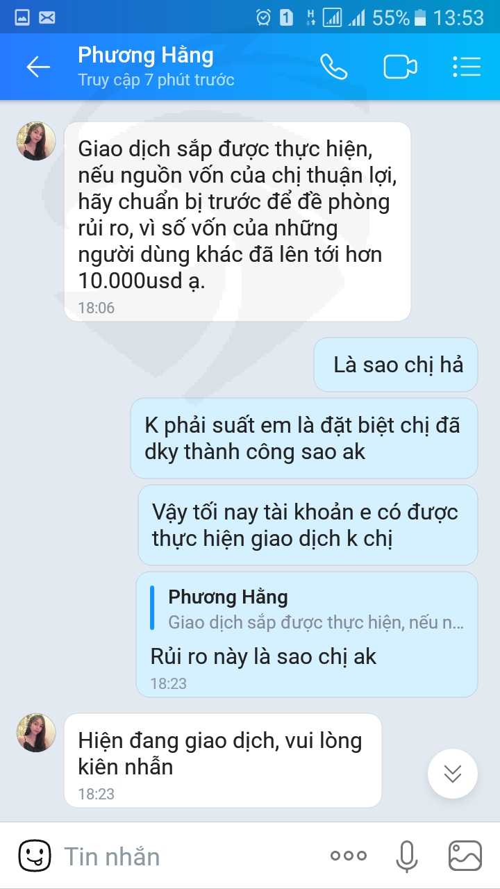 Nguyễn Văn Dư Id: 2026713, nhân viên hướng dẫn Phương Hằng, mời chào các NĐT vào thị trường mở tài khoản giao dịch, ban đầu được tặng voucher 1000$ để giao dịch trải nhiệm, sau thời gian trải nghiệm nhân viên Phương Hằng liên tục gọi điện yêu cầu vào vốn và đảm bảo lợi nhuận giao dịch hàng tháng từ 20%-50%, và được add vào các nhóm học quản lý tài chính có người đứng ra giải thích thắc mắc và giới thiệu về sàn cũng như cách thức giao dịch và cách nạp rút, các khuyến mãi lợi ít sàn mang lại. Sau thời gian được giao dịch trải nghiệm, tôi nạp 1000$ vào ngày 25/2 và 1000$ vào ngày 28/2 và thời gian đầu giao dịch có lãi tôi vẫn rút về được tài khoản ngân hàng bình thường và làm cho tôi có niềm tin ở sàn. Sau đó nhân viên Phương Hằng thông báo sẽ có giao dịch nhất quán ngày 11/03 lợi nhuận 1 lần giao dịch sẽ đạt được từ 20%-30% tùy vào số tiền trong tài khoản và tối thiểu tài khoản phải có 5000 usd, vào ngày 8/3 tôi nạp 2000$, ngày 9/3 tôi nạp 1000$ để được tham gia giao dịch nhất quán. sau khi vào vốn các đối tượng Phương Hằng lại dùng những lý do vốn ít nên tài khoản bị cháy và liên tục hối thúc tôi vào vốn phải nạp thêm tiền để cứu tài khoản, ngày 16/03 tôi nạp thêm 1000$ vào tài khoản mong kết thúc giao dịch sẽ rút tiền về được như lời đối tượng Hằng hướng dẫn nhưng đến nay vẫn chưa rút được tiền.