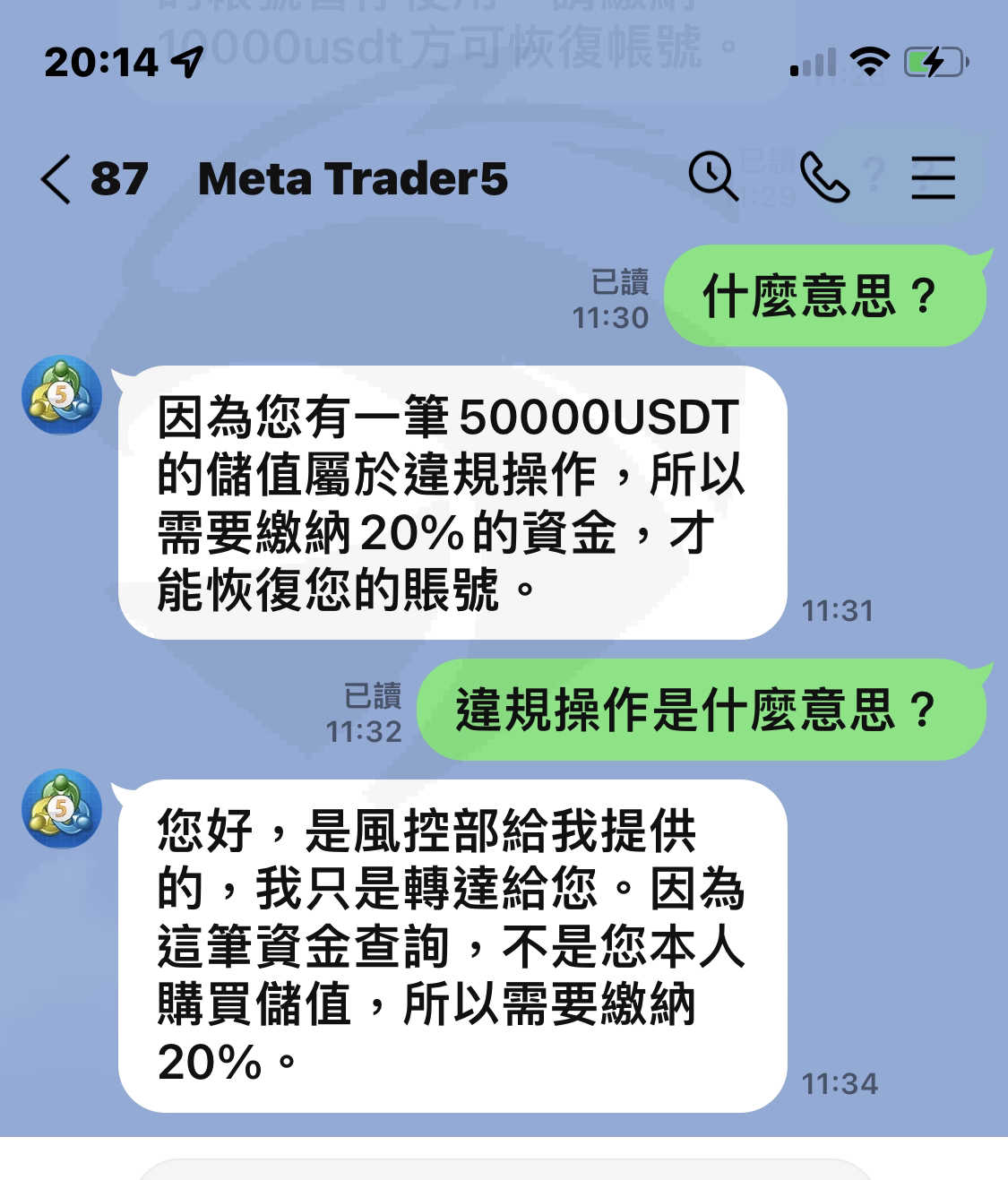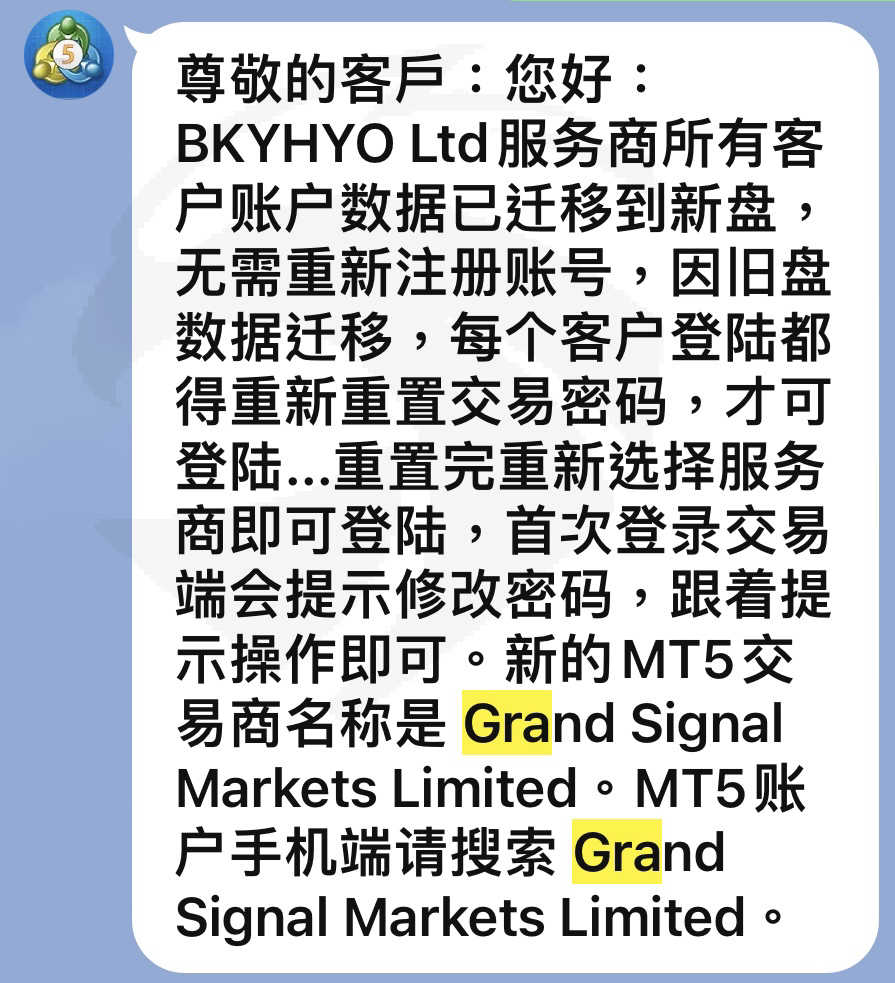網友指導於BKYHYO註冊,此平台無預警遷移平台至GSM( Grand Signal Markets Limited),是個不受監管的平台,確認客服GSM將升級主標,再度入金, 後續驚覺不妥想要出金,客服卻告知有他人入金,屬違規操作,需要支付20%費用才能恢復帳號出金. 目前MT5帳號已經被停用, 遷移的新平台GSM無EMC管道,因此尋求幫助.
