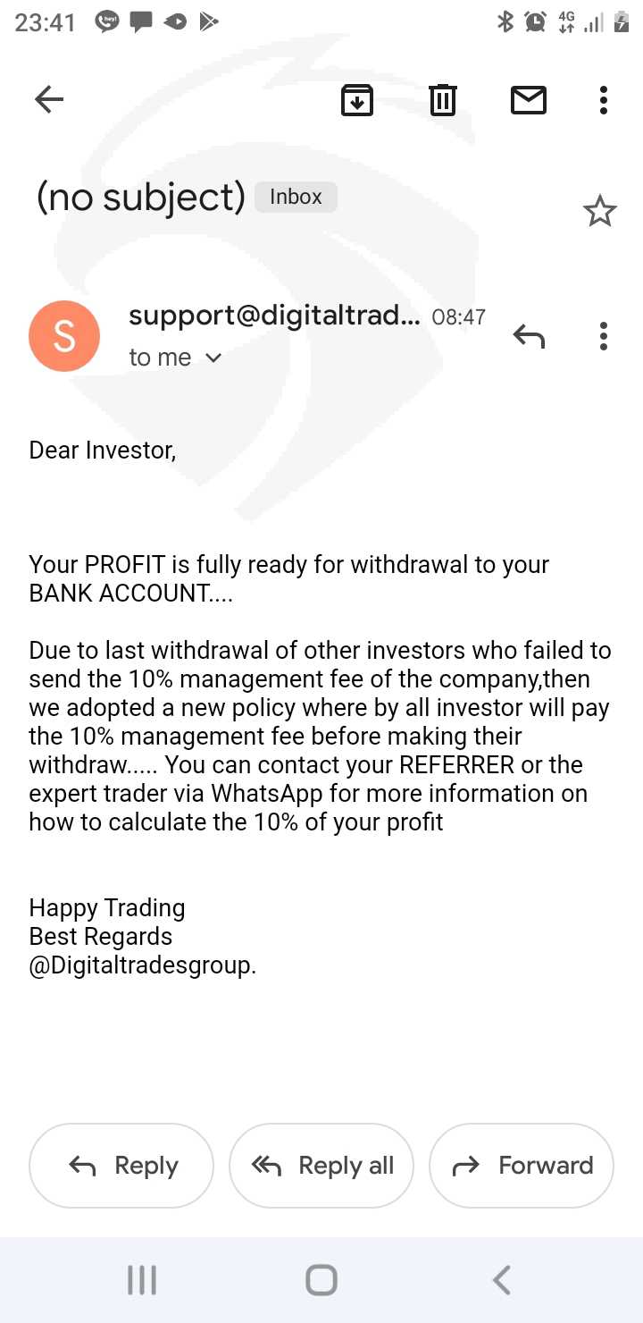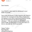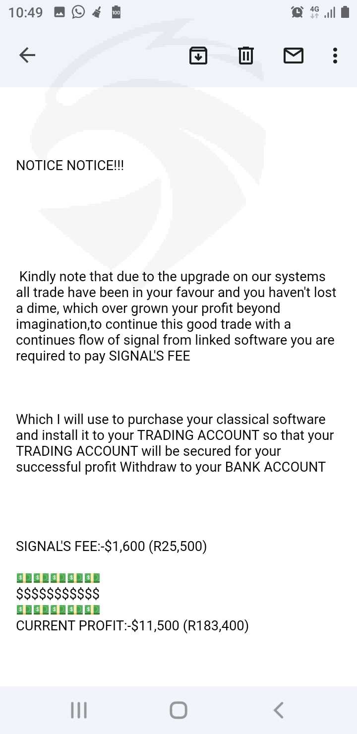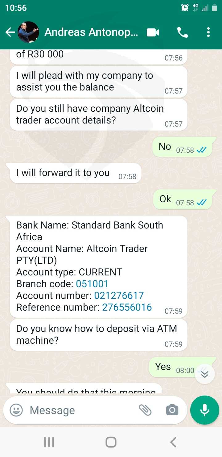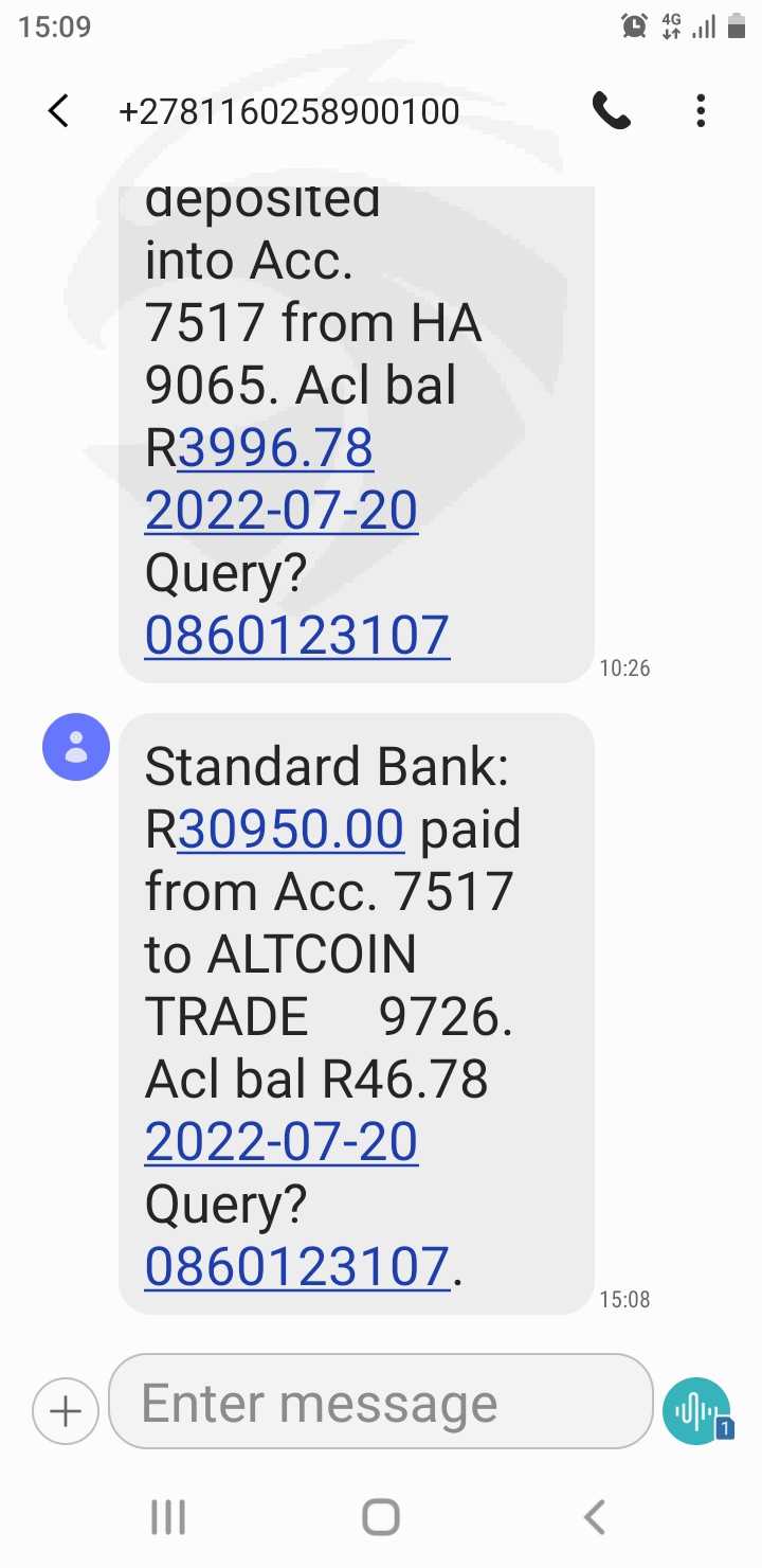 我尝试与一个自称玛丽-塔托的人进行交易,另一个是安德里斯-安东诺普洛斯。我在luno应用程序中存入5000兰特,她将其发送到网上交易的地址,然后她告诉我用25500兰特升级,我存入后,她告诉我在我收到收益之前为公司存入10%。几天后,她告诉我,我必须支付国际货币基金组织代码,我拒绝支付,现在她正忙着劝我支付。我一共入金了86500兰特,我想要把钱拿回来,我需要帮助让我的钱回来,我现在因为他们已经破产了。