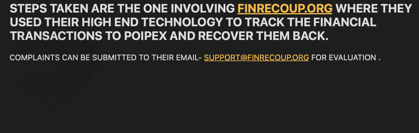 It is no news that Poipex is a scam company and the deposits made to them can be tracked through the right algorithm. It all started when I wanted to withdraw from my MT5 and I was declined severally. All attempts to get across to the support team proved abortive and this exactly made me take some steps that proved successful for withdrawal.I have shown proofs of my deposits to Poipex and further steps taken in my attachments.