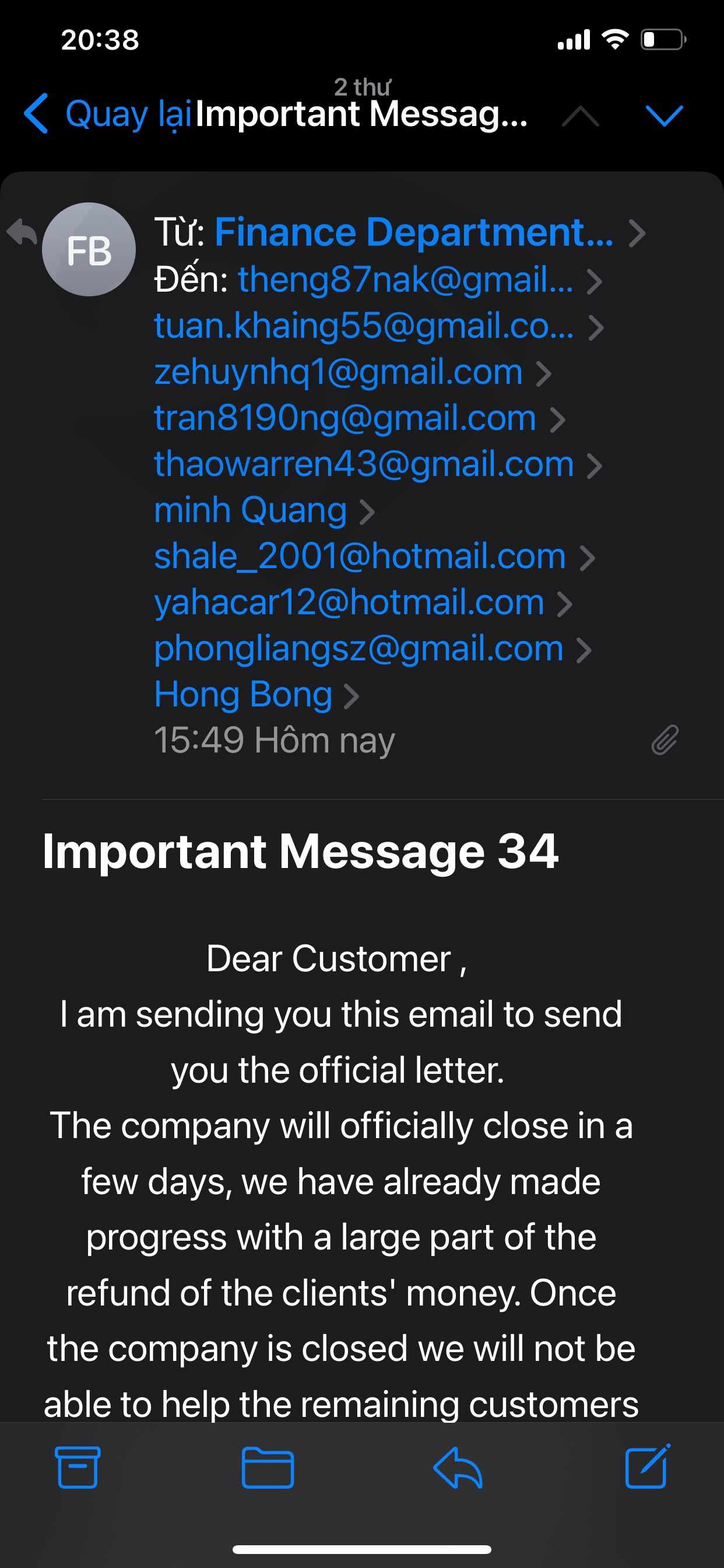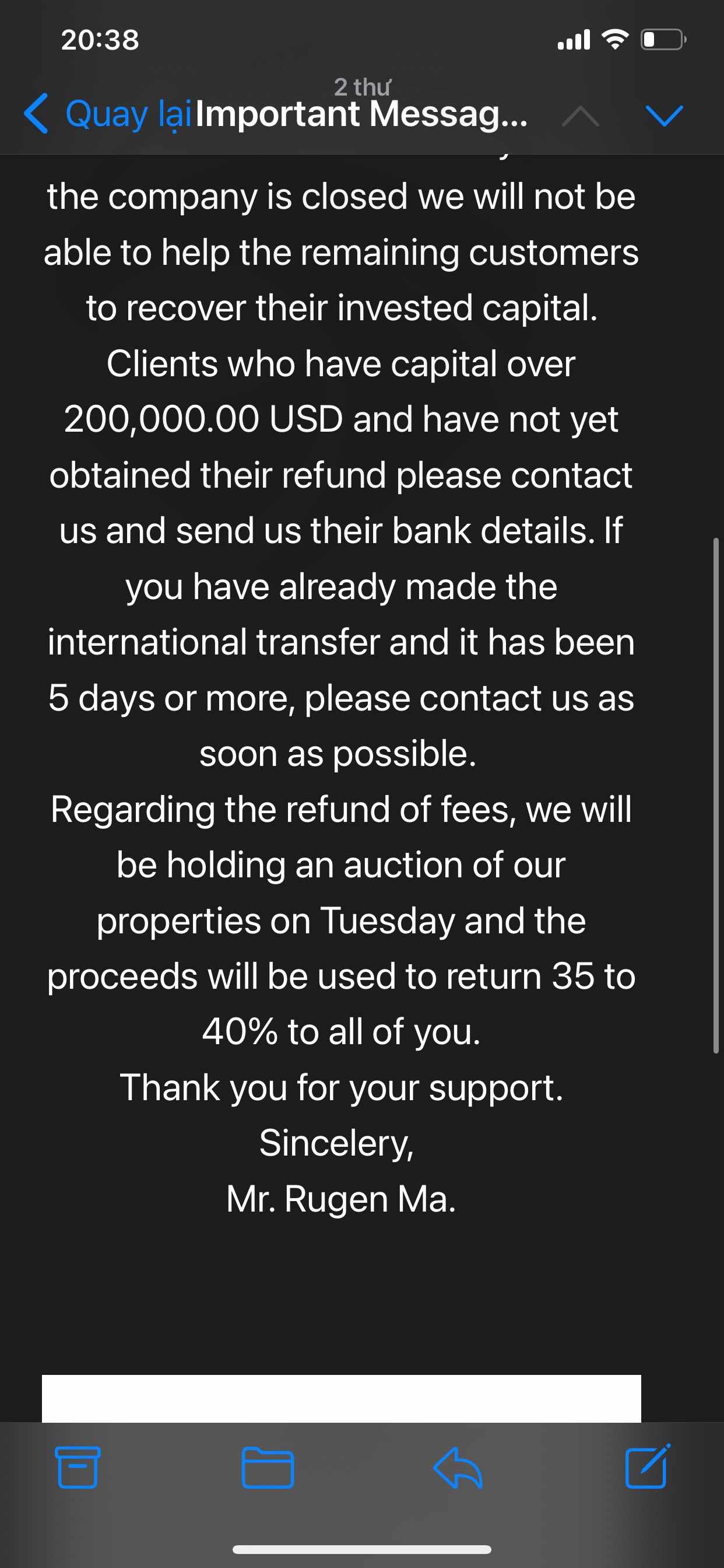 Sàn Biguncle đã giữ tiền, yêu càu nộp thuế. bây giờ họ gửi Email thông báo phá sản, yêu cầu nộp tiền phí để hoàn lại tiền. Hãy giúp tôi