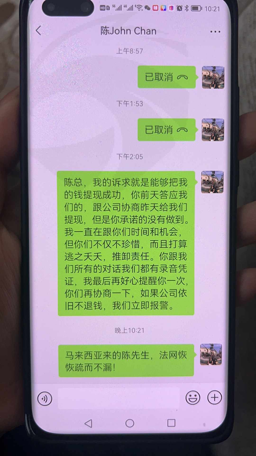 马磊、潘、陈承诺资金安全,可以随时提现。后本人申请提现,资金均不能提现到账,且马磊、潘、陈均以各种理由搪塞欺骗。马垒、潘、陈系同一公司合谋诈骗行为,经多次协商催要投入资金无果(有通话录音全程记录过程),马,潘,陈(系马来西亚籍华人,护A55543807),陈一直说自己是新加坡人,均以各种借口拒不返还。此三人的诈骗行为已经触犯法律,构成诈骗罪。