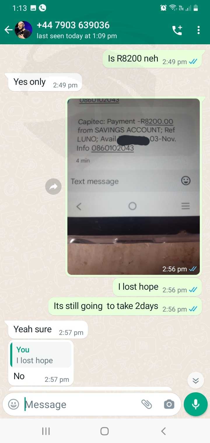 即使在今天,我仍将超过 R150000 的金额存在Joseph Lubin哪里,我从未收到我的提款,另一家valr公司拿走了R25000,说他们会补偿我,但我一无所获