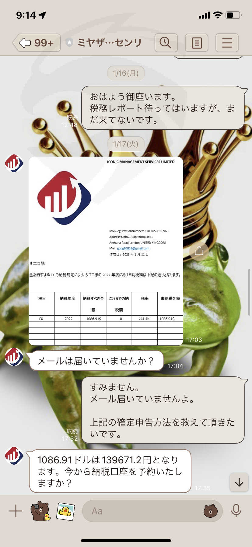 1月頃に投資シェア会F4にてグループ内で全員一度出金するようにとお願いされていましたが、その時にいつもLINEで問い合わせてる宮崎千里と名乗るiconic management取引所の日本担当のマネージャーに出金のお願いをしました。