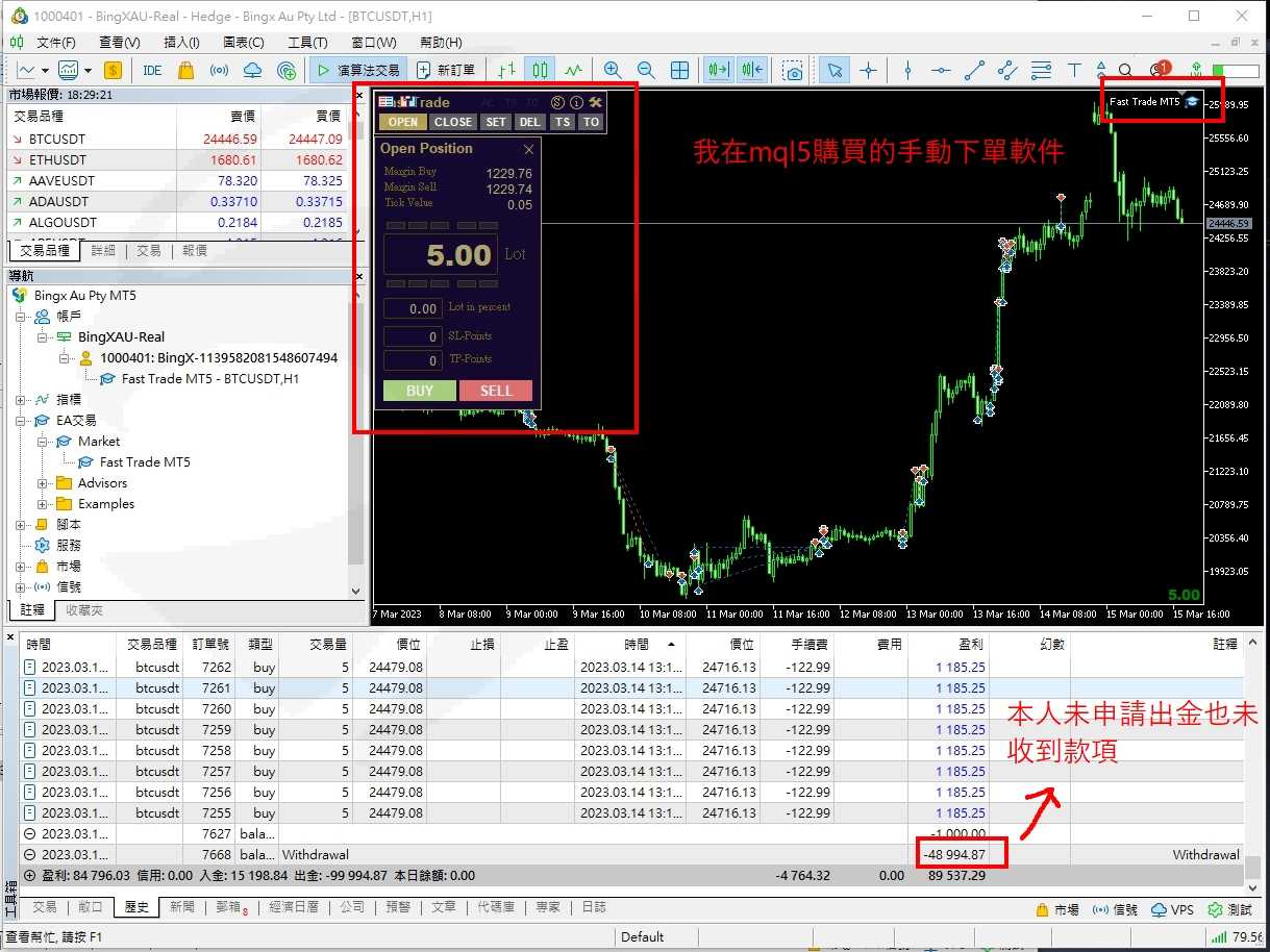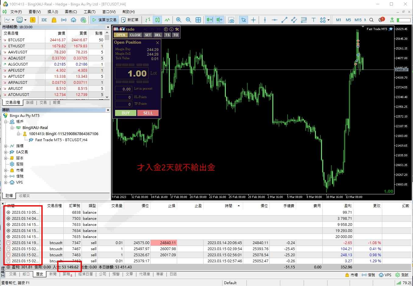 號稱全球最大加密貨幣bingx盜領我的獲利資金48994.87美金,及另一戶53451.43美金不給出金。有可能要倒閉了連幾萬美金都要到。請個位善心人士幫幫我轉發,告訴全世界交易投資人小心,不要辛苦錢被這樣騙走。bingx公司網址https://bingx.com/zh-tw/我接下來將將窮盡一切力量,透過法律及監管單位,及社群媒體。也請各位看到本文大哥大姊幫忙轉發,小弟先向你們感謝。我也有完整證據可提供。我已將我交易數據上傳到mql5以下是2戶交易數據。帳戶1000401被盜領48994.87美金。https://www.mql5.com/zh/signals/1853443?source=Site+Signals+My帳戶1000401不給出金53451.43美金。https://www.mql5.com/zh/signals/1894227?source=Site+Signals+Page服務器位置/帳號/密碼BingXAU-Real10004011qaz1234BingXAU-Real1001413m258789在此非常感謝外匯天眼能提供這樣的管道讓我們申訴,避免其更多受害者.........謝謝謝謝