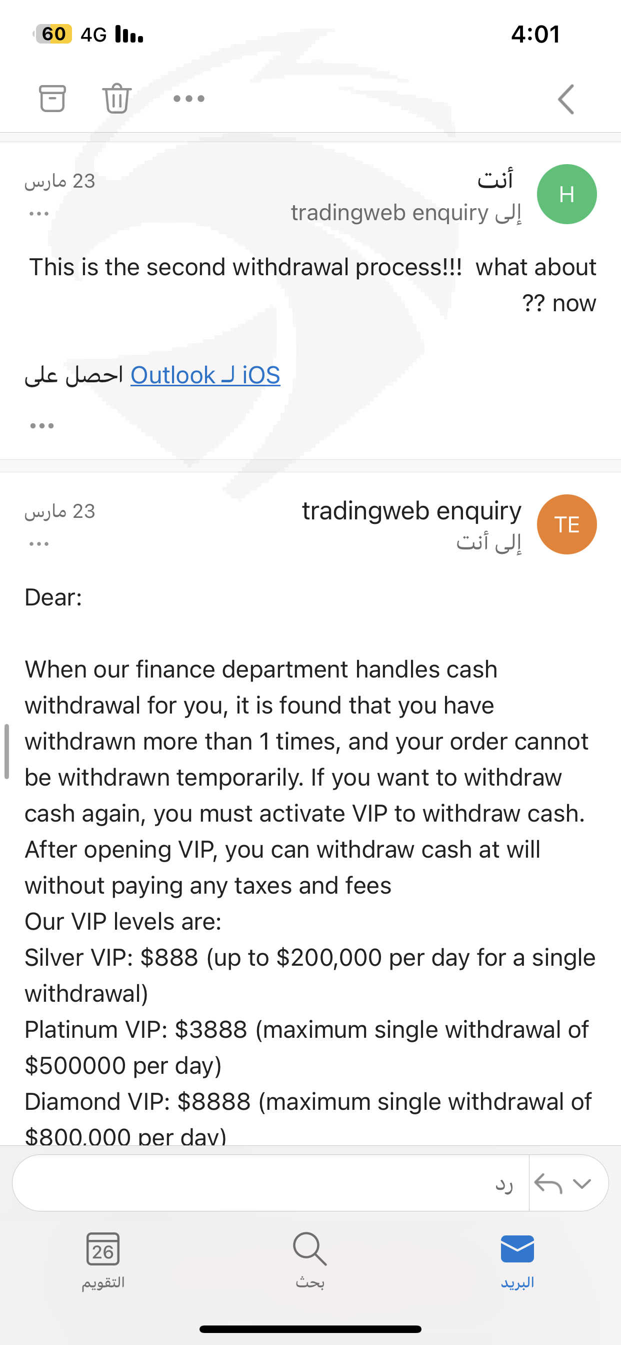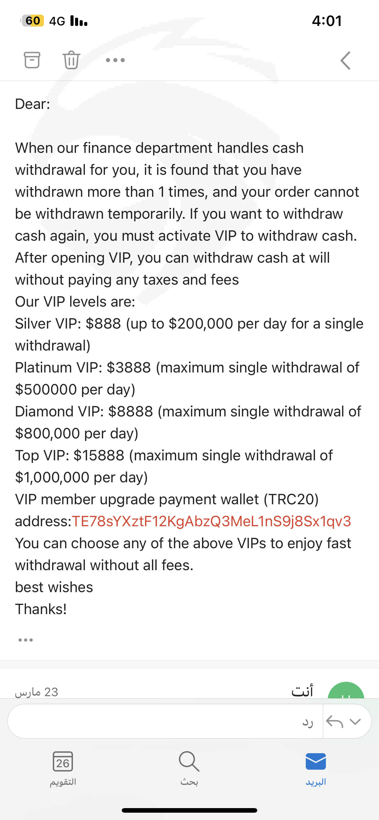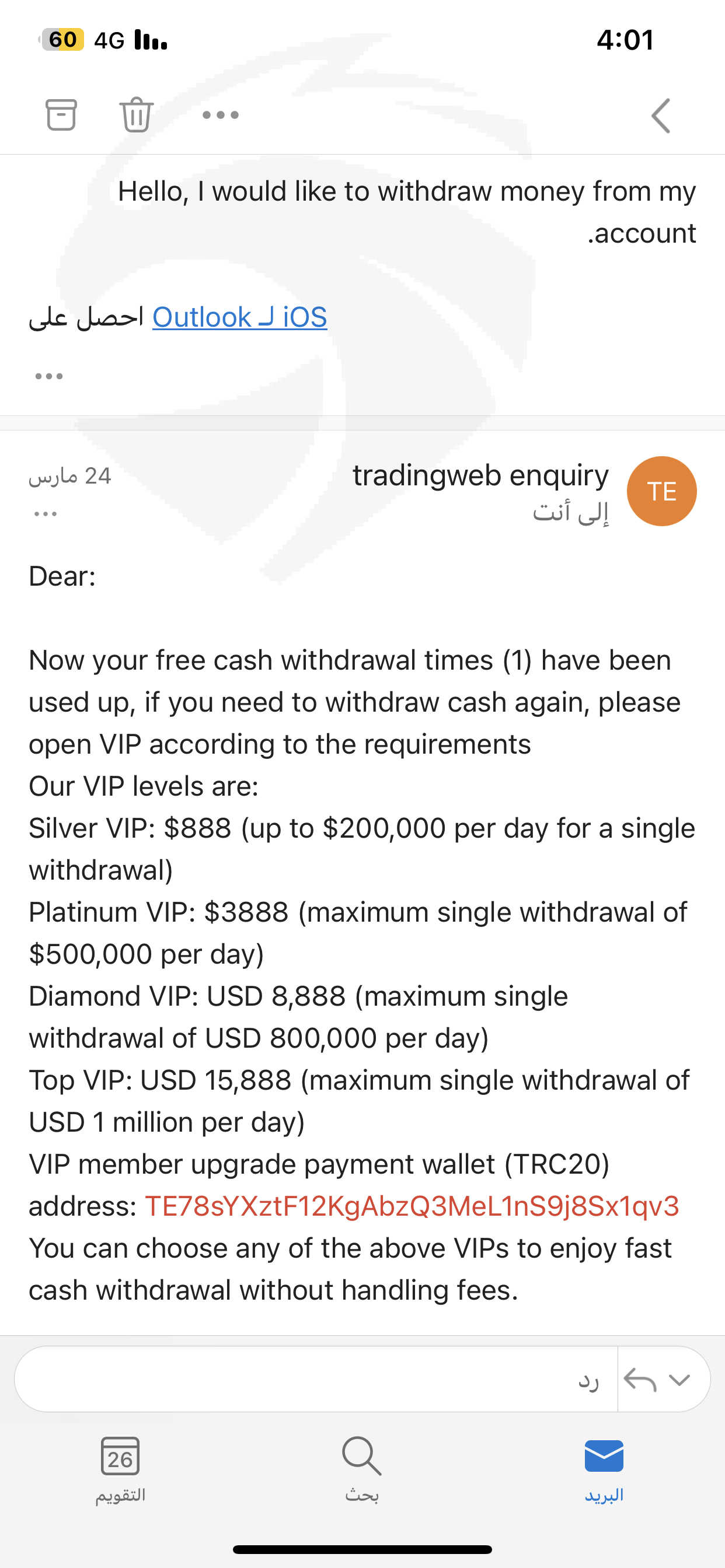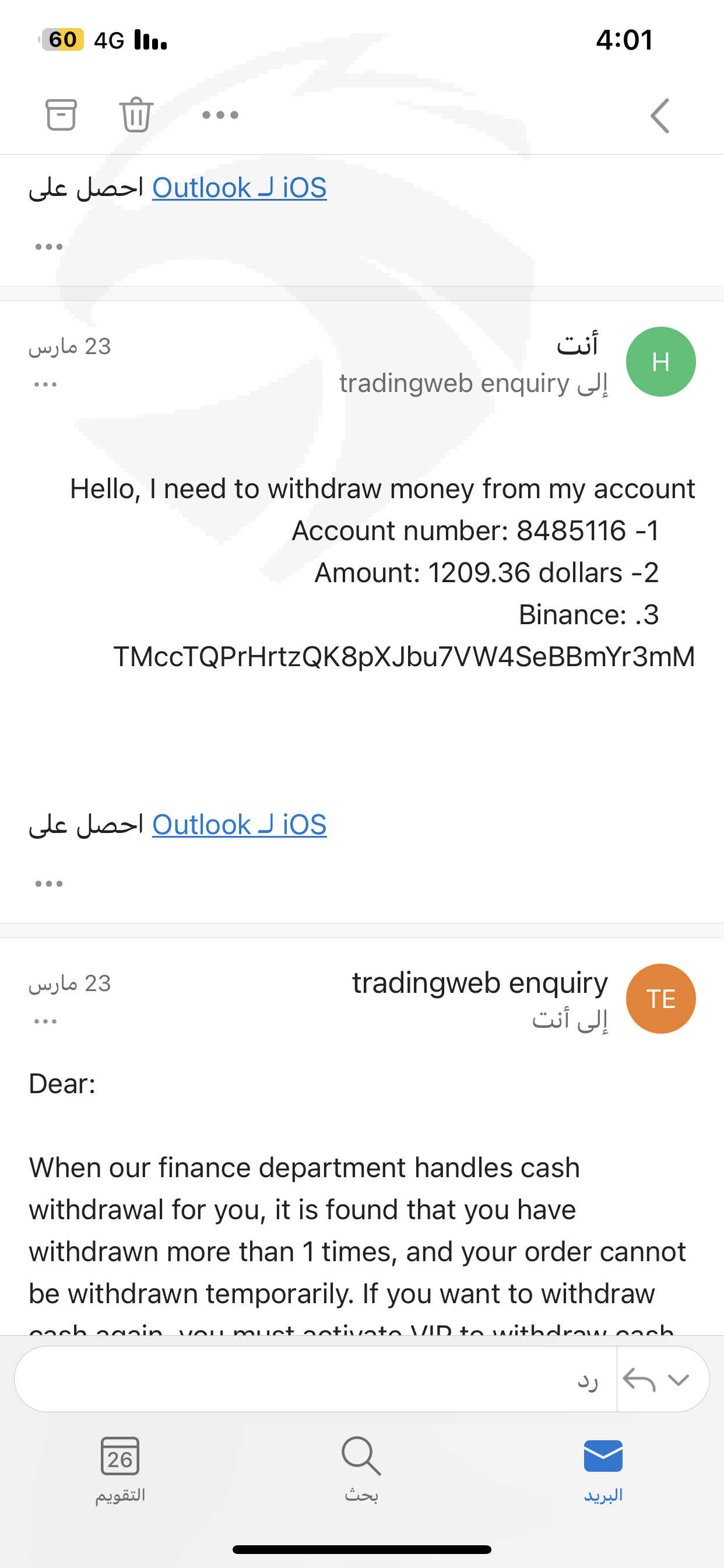 تواصلت معي فتاة وتدعي ان عمها يعمل في تجارة الذهب وان لديه محللين خاصين وانهم يكسبون الكثير من المال ,, وانها فتاة مديرة شركة اجهزة طبية ,, من هونج كونج,, عندما وضعة اموالي في هذه المنصة ,, انني غير قادر على سحب الاموال .. اتمنى من الجميع الحذر