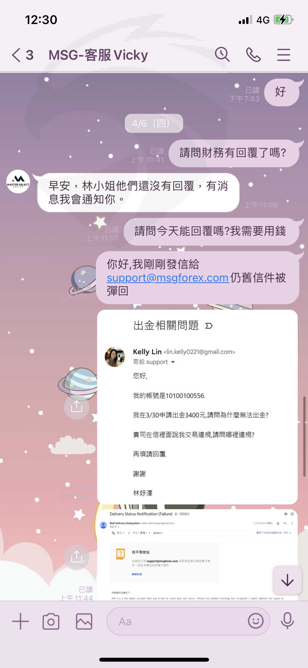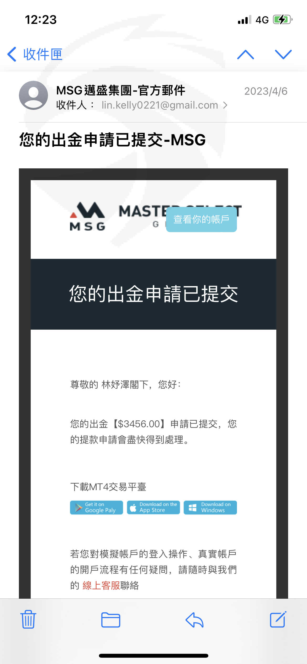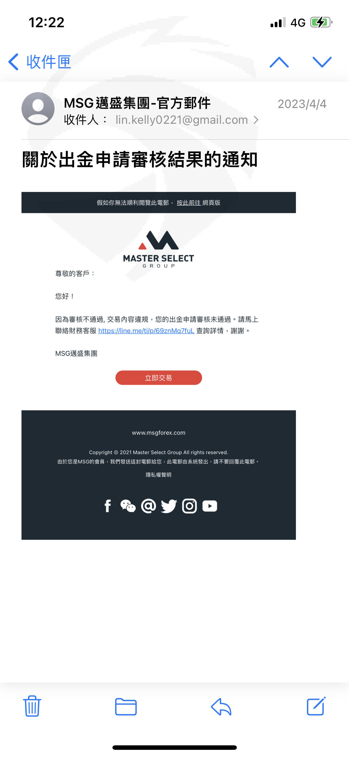 我在2023/3/29將所有頭寸平倉並申請出金美金3400元,MSG在2023年4月4日收到有郵件說不讓出金因為交易違規。但我沒有任何違規事項,所以發Line詢問客服。客服諮詢財務很多天都沒有告知原因。我發了郵件到support@magforex.com詢問出金相關問題時,郵件被彈回來。再度打官網客服電話一樣是空號。