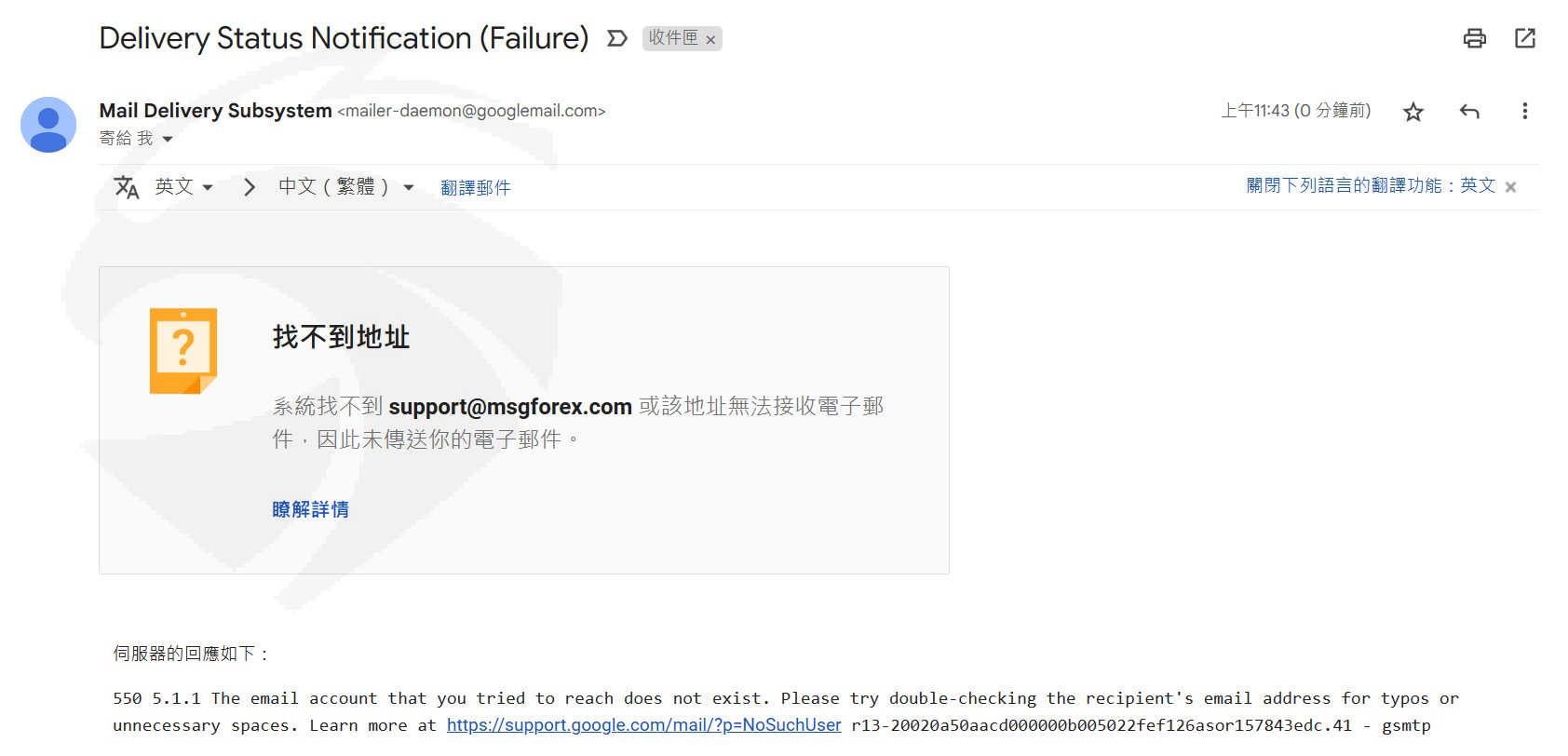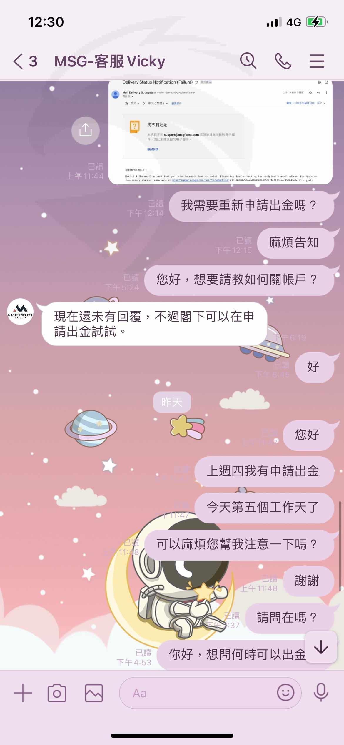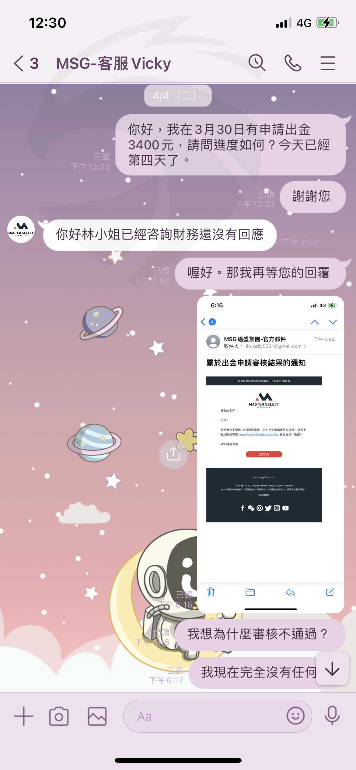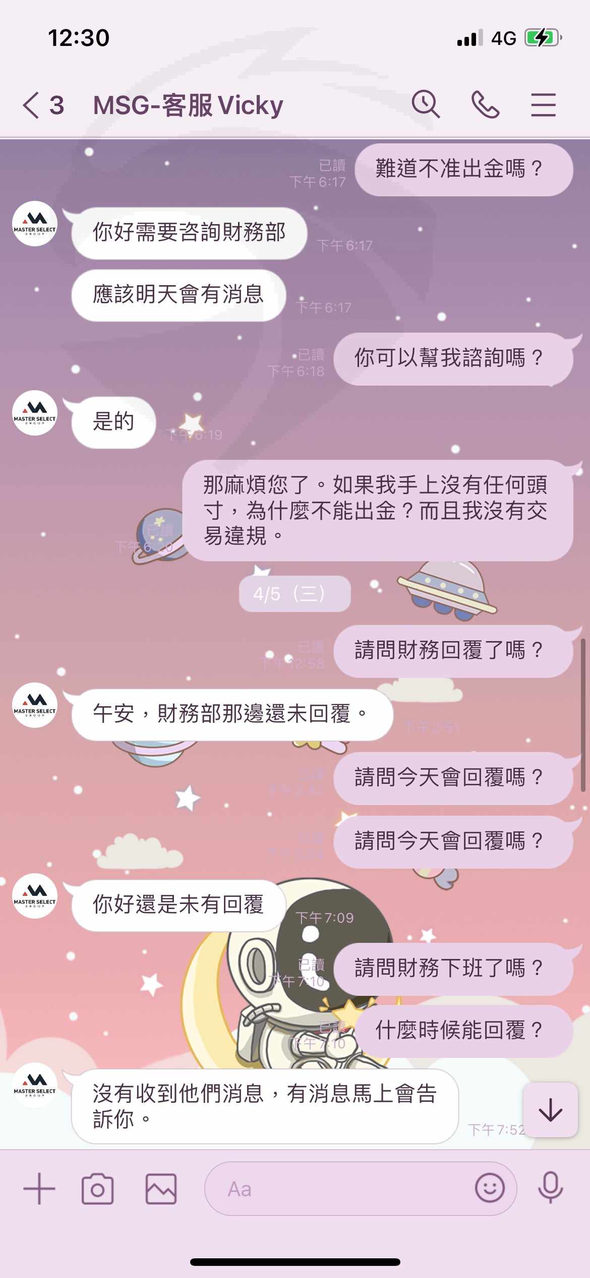 我在2023/3/29將所有頭寸平倉並申請出金美金3400元,MSG在2023年4月4日收到有郵件說不讓出金因為交易違規。但我沒有任何違規事項,所以發Line詢問客服。客服諮詢財務很多天都沒有告知原因。我發了郵件到support@magforex.com詢問出金相關問題時,郵件被彈回來。再度打官網客服電話一樣是空號。