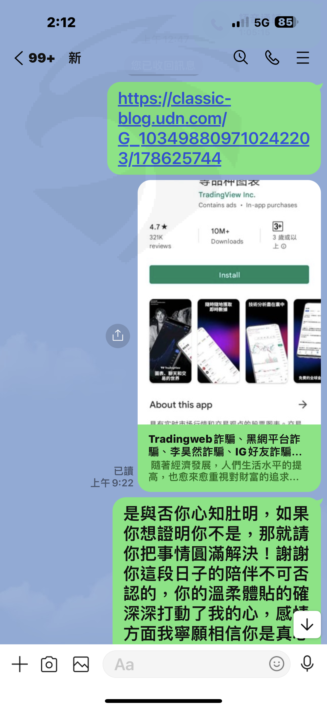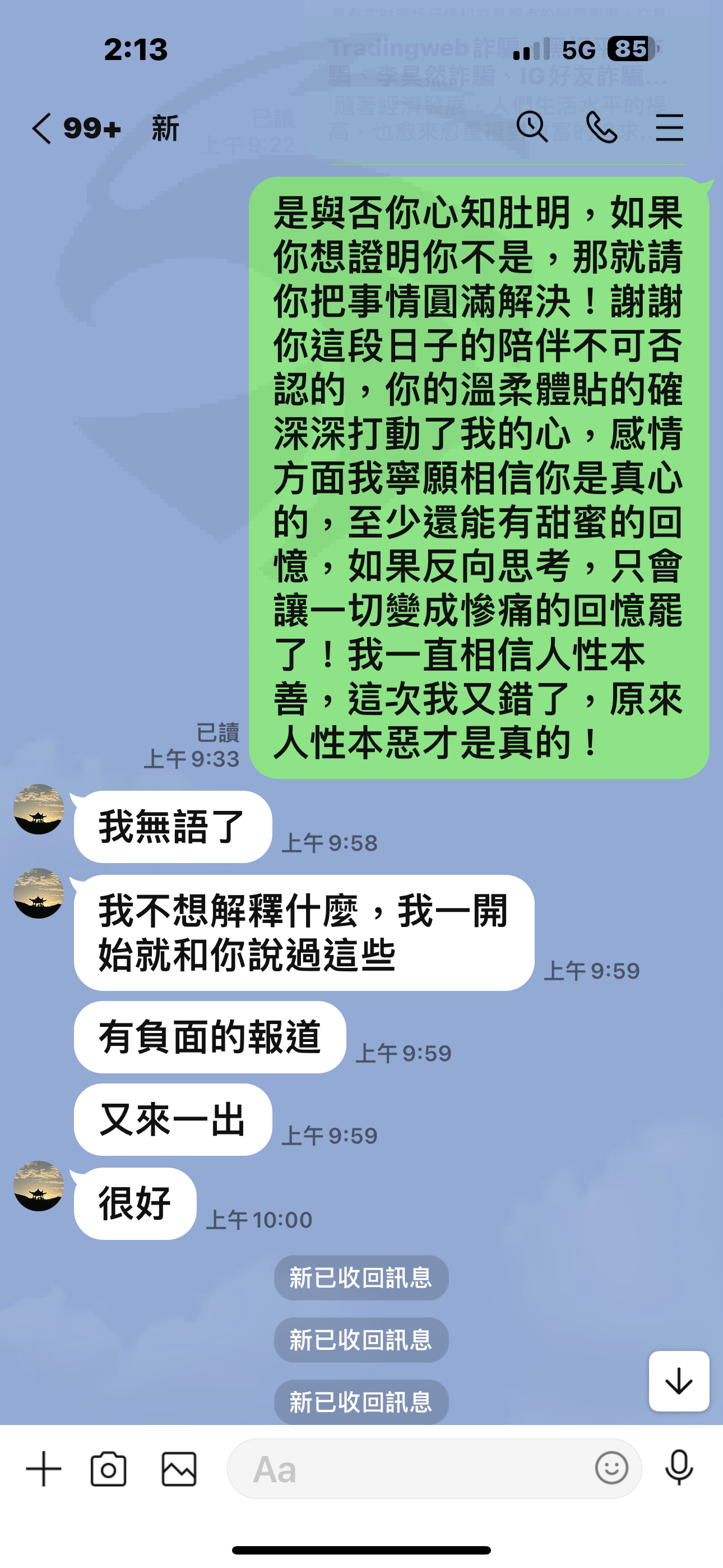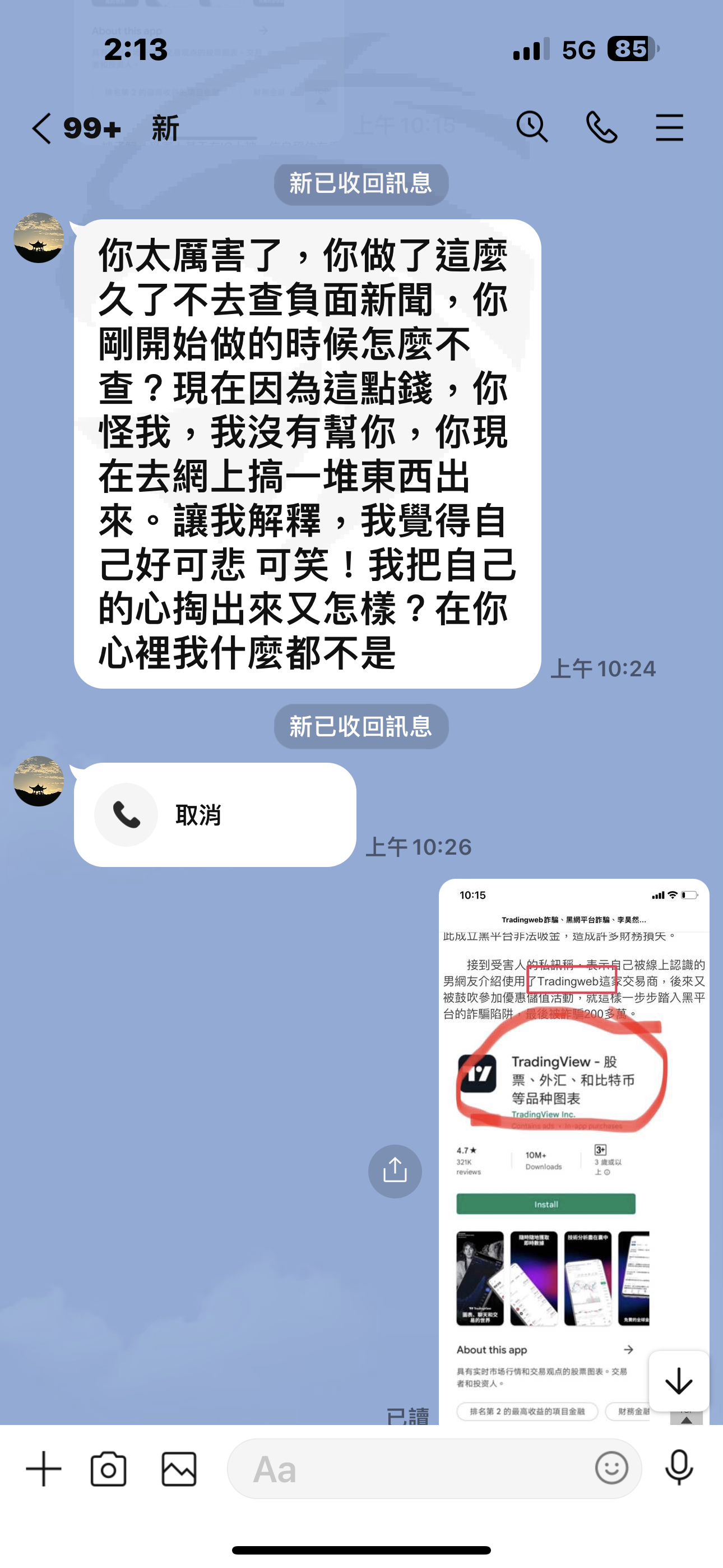 跟之前的案例一樣,來自香港名叫顧嘉新,噓寒問暖還直接稱呼寶貝,開始先用對帳單誘導你,說希望能帶著我賺錢,還規劃美好的未來,一步步教著開戶幣安、MAX 、Tradingweb 交易平台,先小額入金,然後帶著下單,有獲利之後,還說自己規劃行情很準,指數波動行情不是天天都有,可是做足了功課算好數據才能有此獲利,開始鼓催入金就這樣我入金了1.3萬美元加上獲利帳戶共有1.7萬美元,對方說幫我規劃了3萬美元的操作,我告訴他我只有這麼多了,他居然主動幫我入金到3萬美元,隔天又有獲利資金總額來到3.8萬美元,我想出金他告訴我先別出金,問我是否收到mail有贈金的活動,並要我去跟客服預約入金贈金活動2,我不疑有他跟客服預約了,5分鐘後贈金馬上進了戶頭,同時告知在4/28號活動任務完成之前不能出金也不能交易,他每天催著我入金,延遲一天就會被扣5%的費用,就這樣我掉進這陷阱中,我告訴他我根本無能為力,他居然要我去借款去貸款,不足的部分他會幫我補上,就這樣前前後後我總共入金了2.3萬美元,更可惡的是客服居然說盈利不能當成入金的一部分,這時他又好心的說可以幫我5.6萬美元,我趕緊搜尋詐騙才發現之前已經有發生同樣的案例了,還把連結給他看,他為了取信於我還主動入金了4.8萬美元,最後告訴我還不足8000美元要我自己想辦法?我知道自己是被騙了,於是我要他自己想辦法,各種咒罵隨之而來,說我搞他坑他