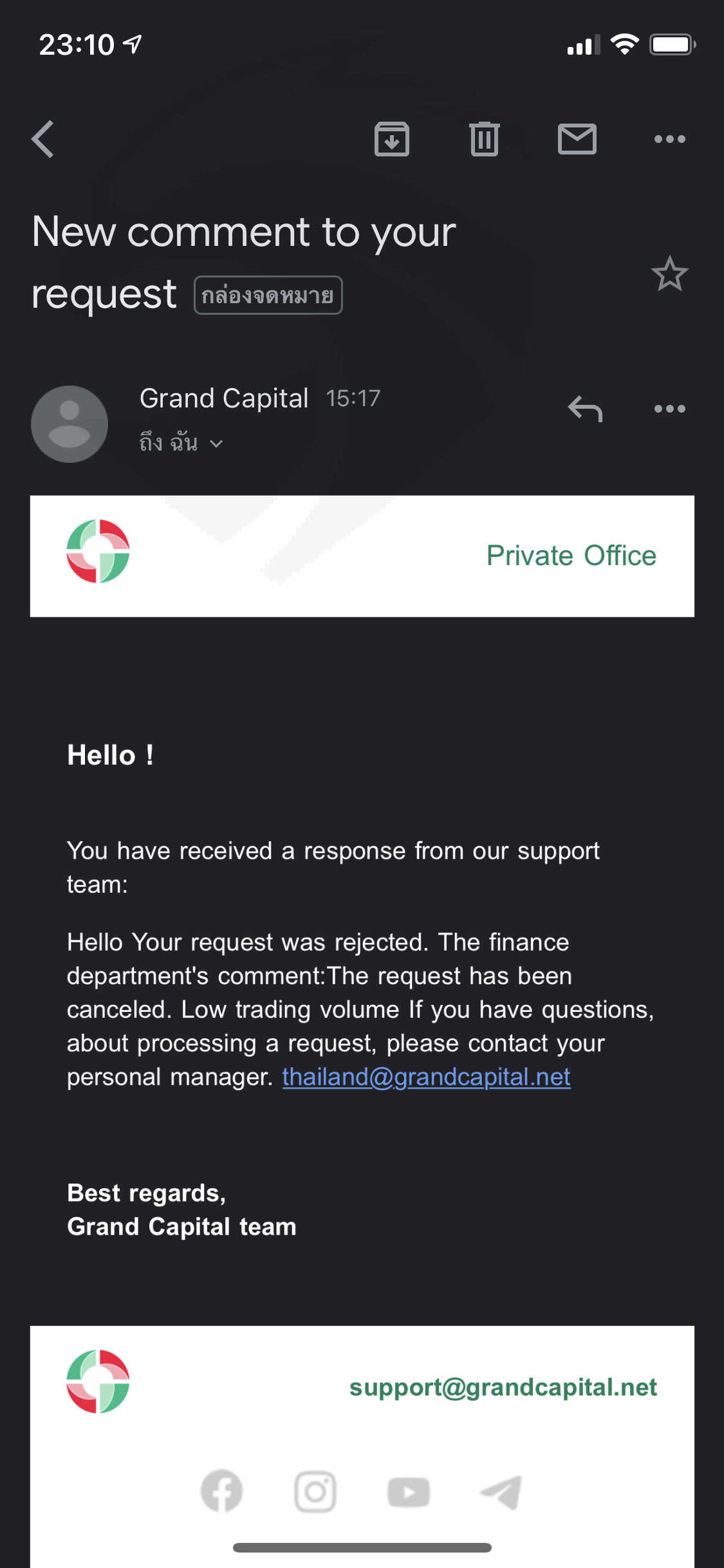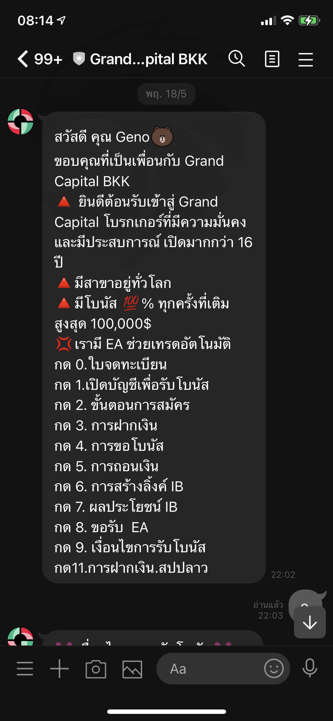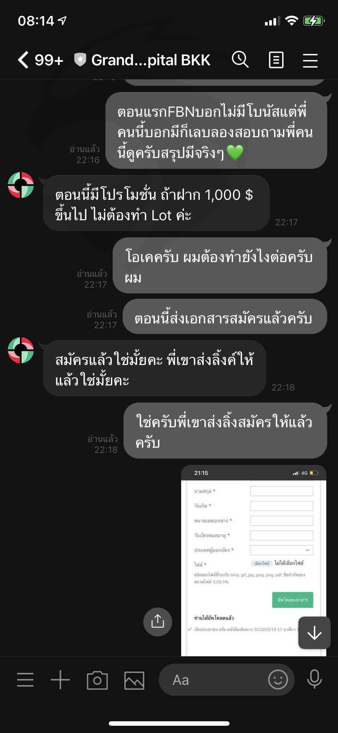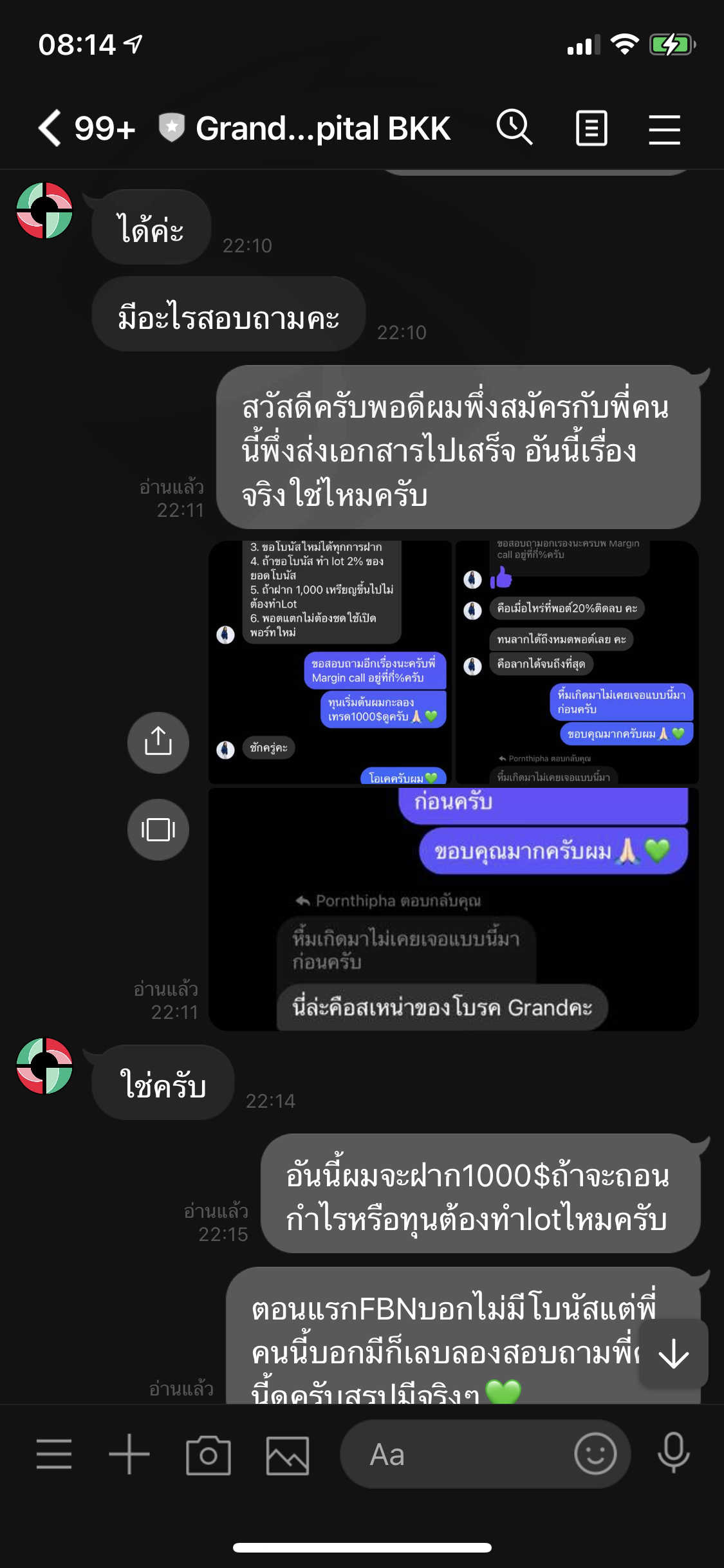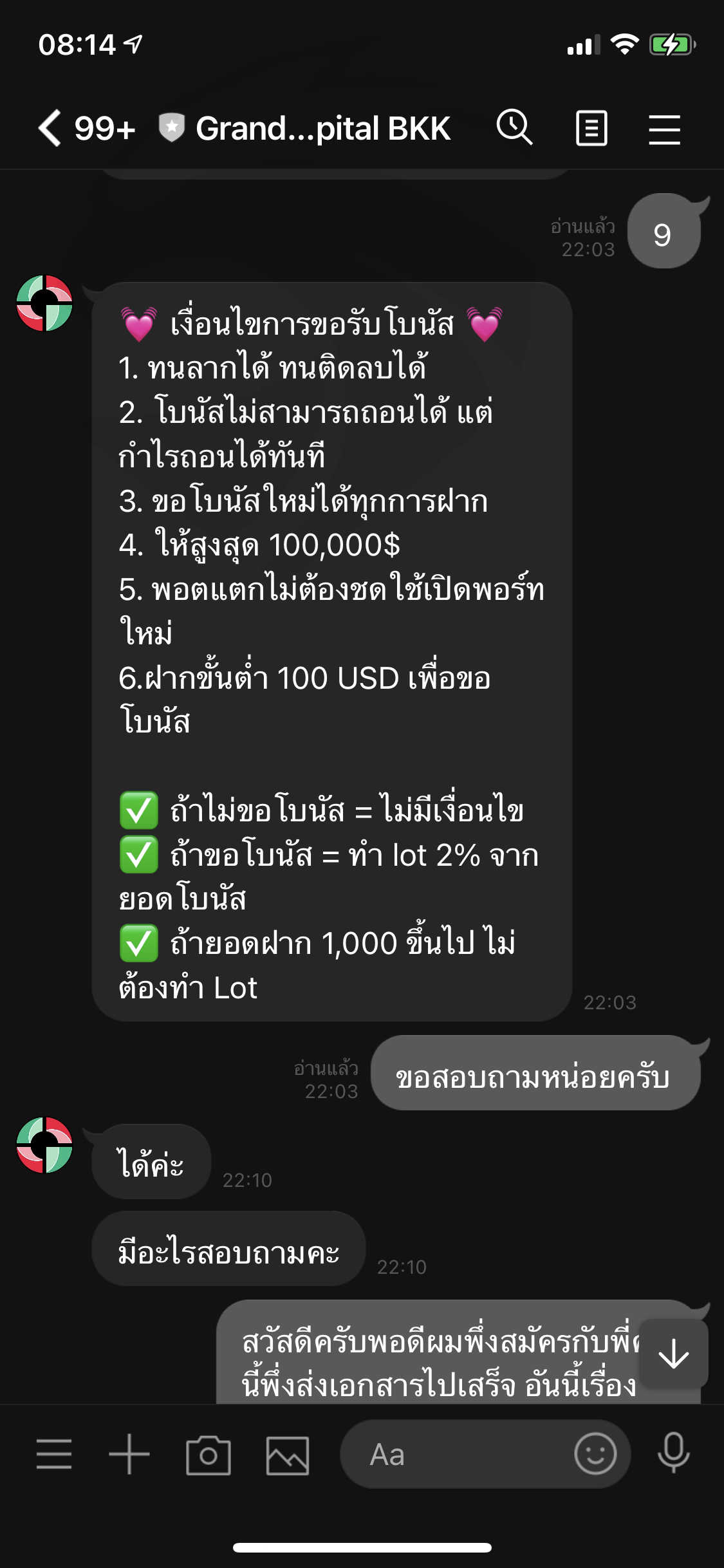 ฉันได้ทำการถอนเงินจากนั้นทางโบรคติดต่อฉันมาว่าฉันทำผิดกฎซึ่งคนที่นำโปรโมชั่นมาเสนอแก้ฉันคือIBและแอดมินGrandcapitalBKKและบอกเงื่อนไขฉันมาเพียงแค่6ข้อพร้อมกับข้อความว่าถ้าฝาก1000$ขึ้นไปไม่ต้องทำLotและไม่ได้บอกกฏอะไรฉันนอกเหนือไปมากกว่านี้เลย ซึ่งฉันก็ทำตามทุกอย่างแต่พอมาวันนี้ได้ทำการถอนเงินแต่ถูกทางโบรคปฏิเสธ