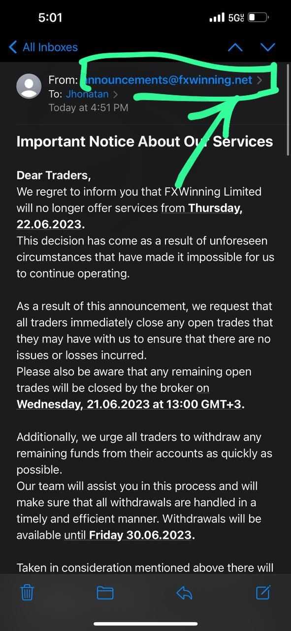 尊敬的交易者们,我们很遗憾地通知您, FxWinning Limited从 2023 年 6 月 22 日星期四起将不再提供服务。由于意外情况所导致我们无法继续运营并做出此决定。鉴于此公告,我们要求所有交易者立即关闭他们可能与我们进行的任何未平仓交易,以确保没有问题或损失。另请注意,交易商将于 2023 年 6 月 21 日星期三13:00 GMT+3 关闭所有剩余的未平仓交易。此外,我们敦促所有商家尽快从他们的账户中提取任何剩余资金。我们的团队将在此过程中协助您,并确保及时有效地处理所有提款。提款将持续到 2023 年 6 月 30 日星期五。考虑到上述情况,从 2023 年 6 月 21 日星期三开始,将无法处理任何新存款。对于给您带来的任何不便,我们深表歉意,并感谢您在此困难时期的合作与理解。如果您有任何疑问或需要进一步的帮助,请随时联系我们的支持团队。