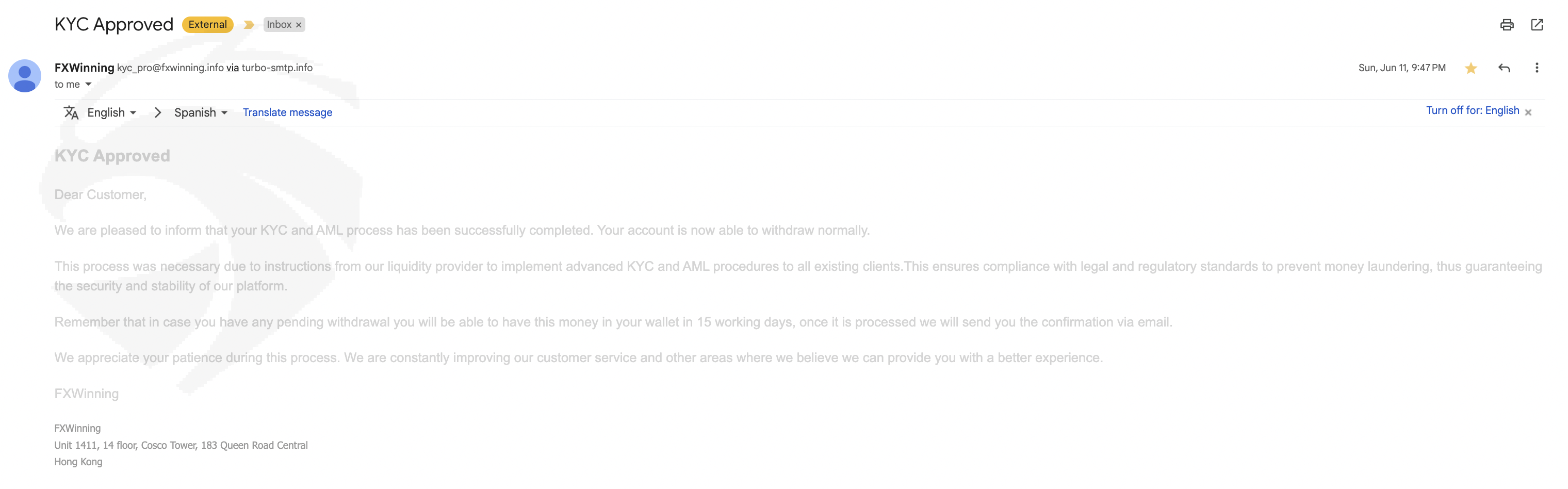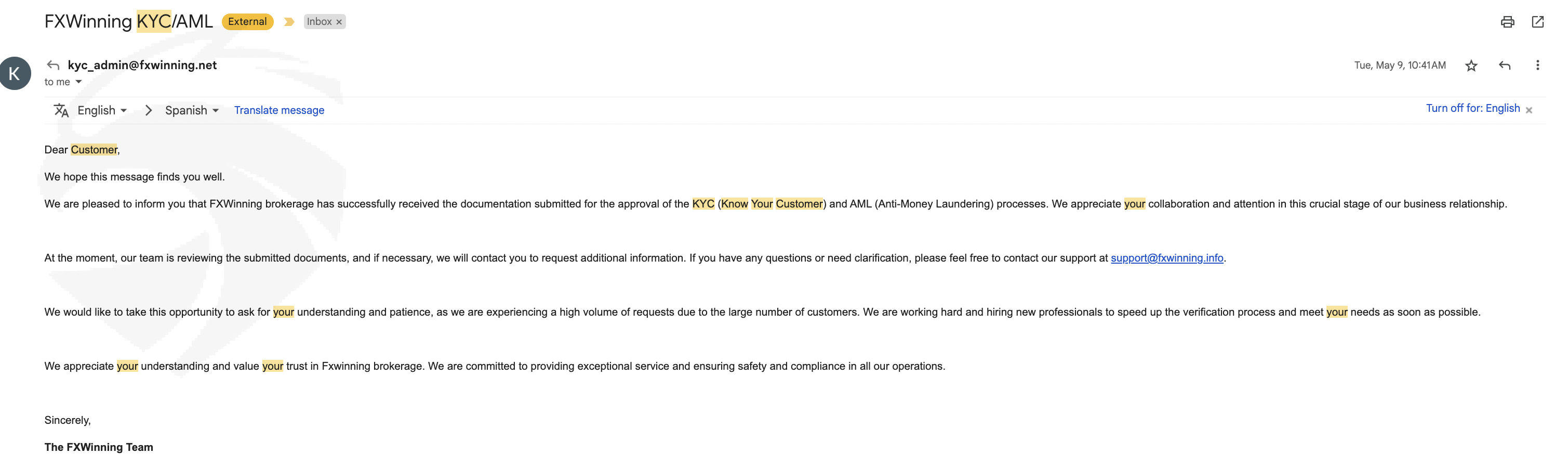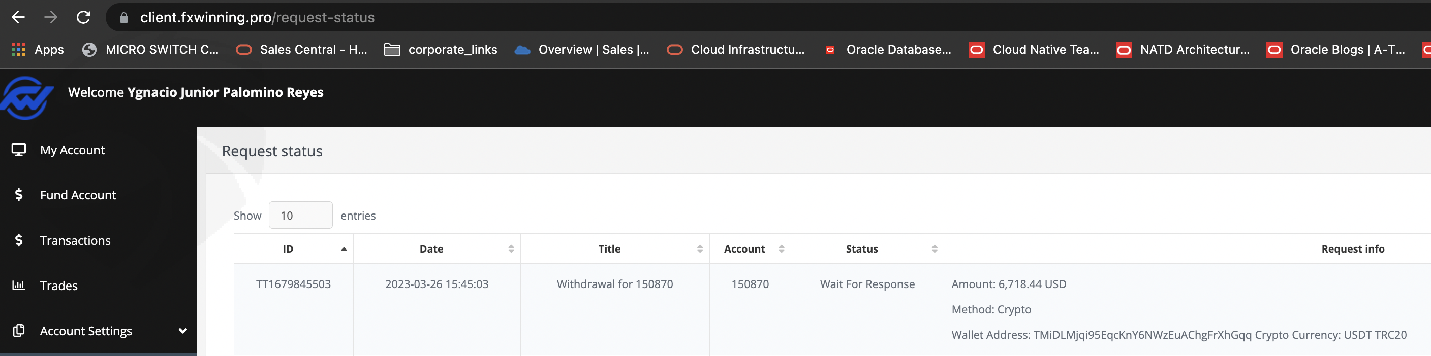 我在三月份请求提取资金,但是现在已经是七月份了,经纪商无法支付在其平台上投资的资金。他们要求填写 kyc 表格,该表格在 15 个工作日之前获得批准(他们保证会支付这笔钱),但是,直到今天,我还没有收到他们的任何付款或回复。附加信息: FxWinning目前,该公司因未从投资者那里返还数百万美元而在美国面临法律索赔。