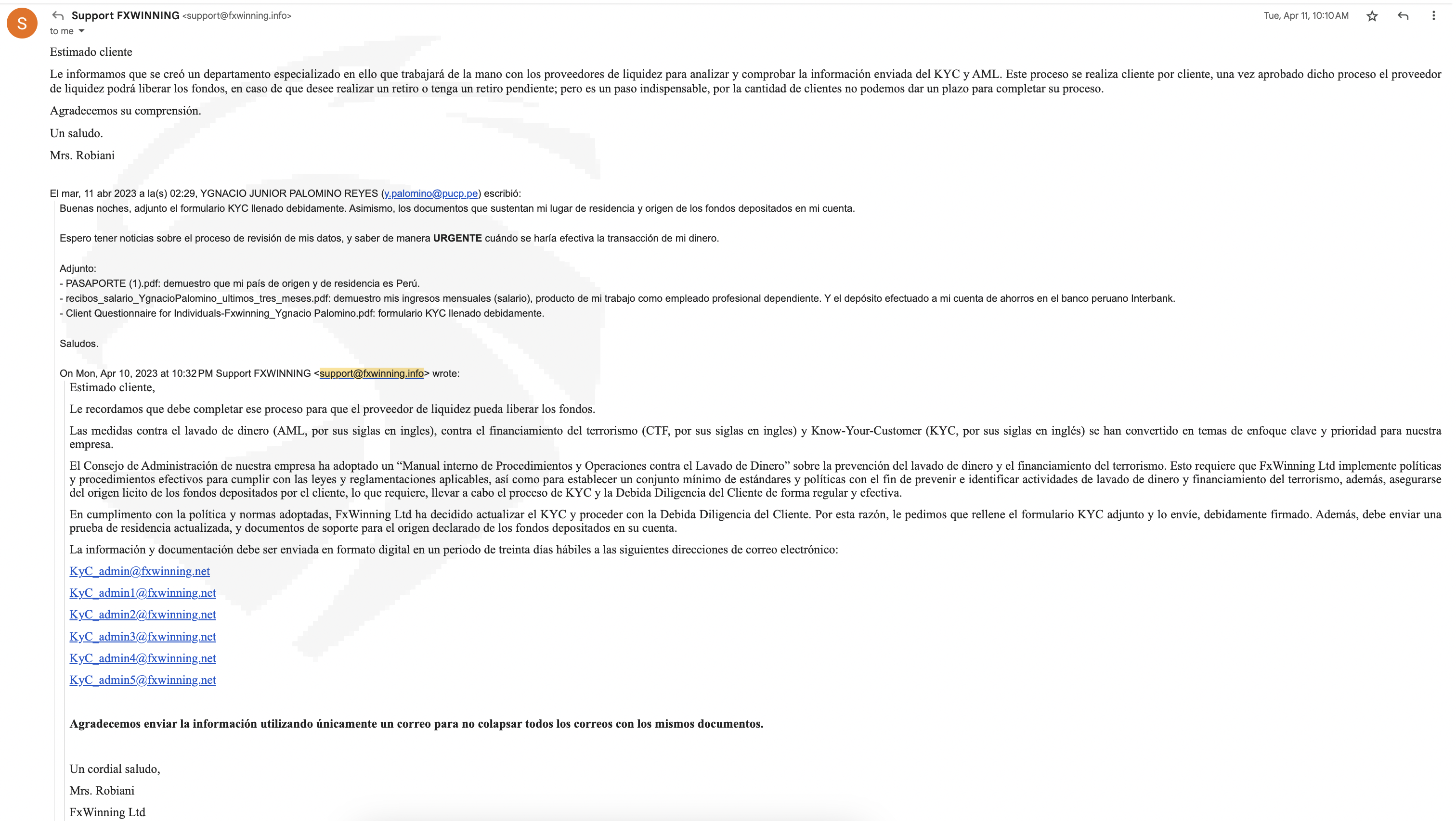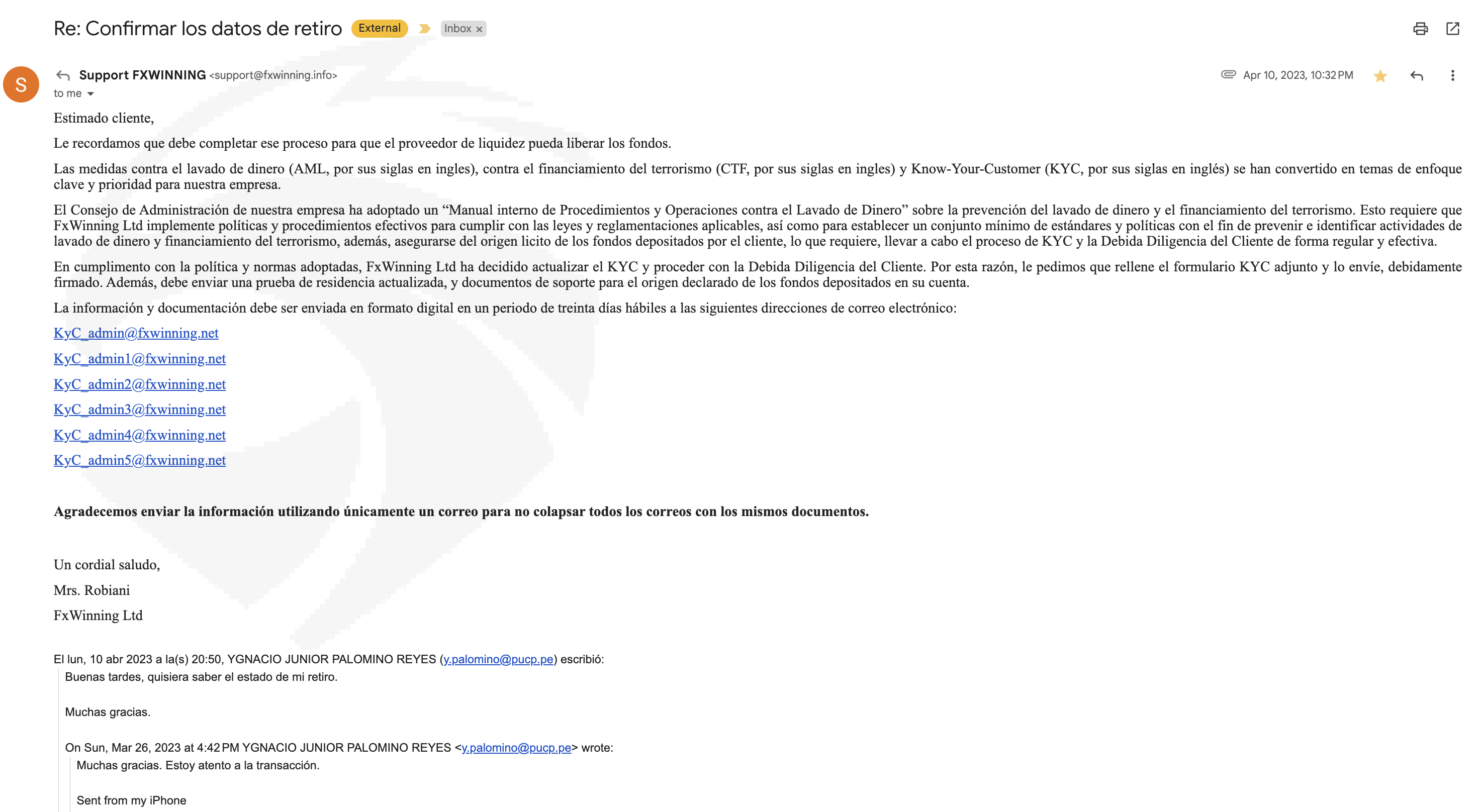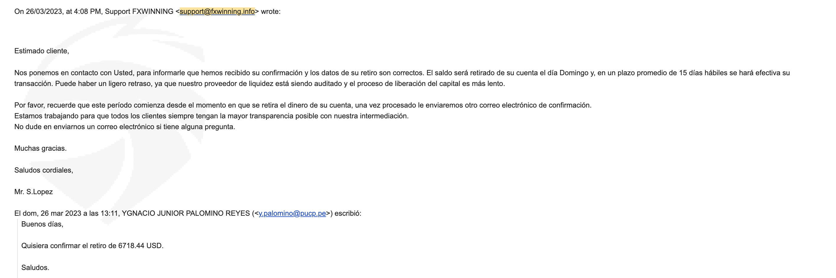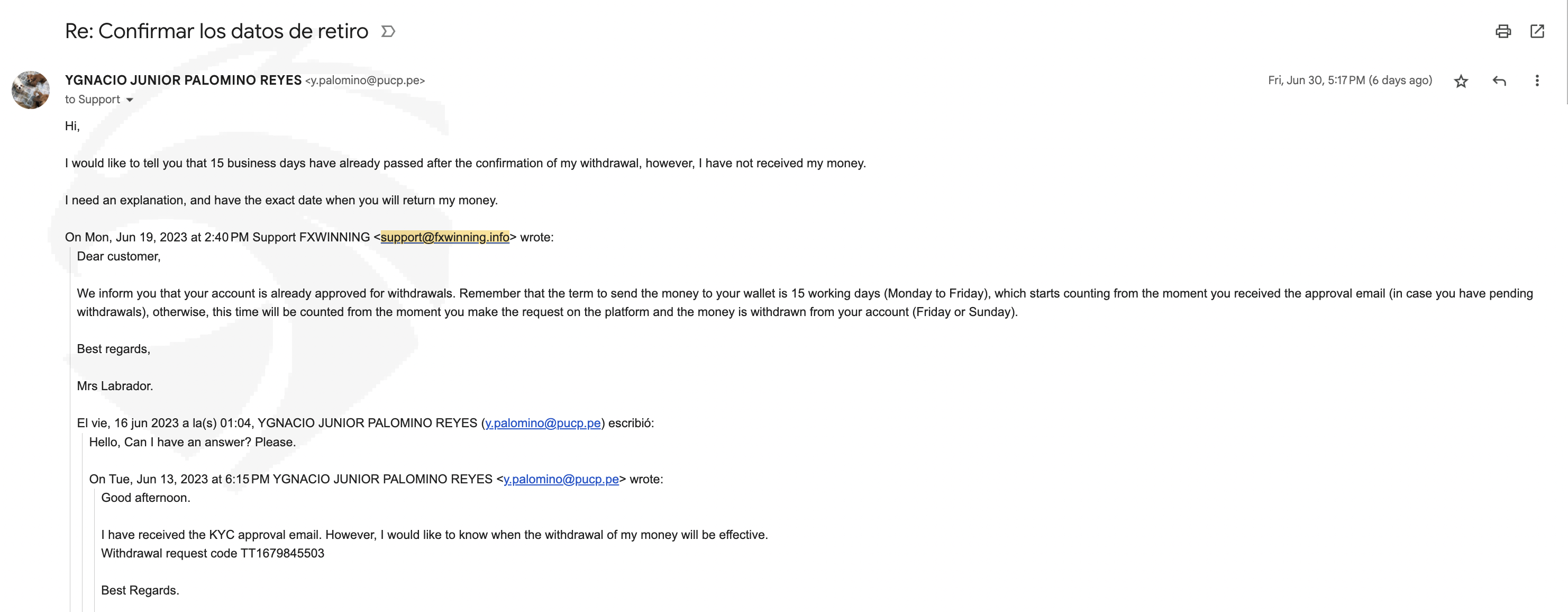 Solicité el retiro de mi capital en el mes de Marzo, sin embargo, ya estamos Julio, y el broker es incapaz de pagar el capital invertido en su plataforma. Ellos solicitaron el llenado del formulario KYC, este fue aprobado hace más de 15 días hábiles (plazo que ellos aseguraron en que desembolsarían el dinero), sin embargo, hasta el día de hoy, no he recibido ningún pago, ni respuesta por parte de ellos. Información adicional: FxWinning actualmente afronta un demanda legal en EEUU por no devolver sumas millonarias de sus inversores.