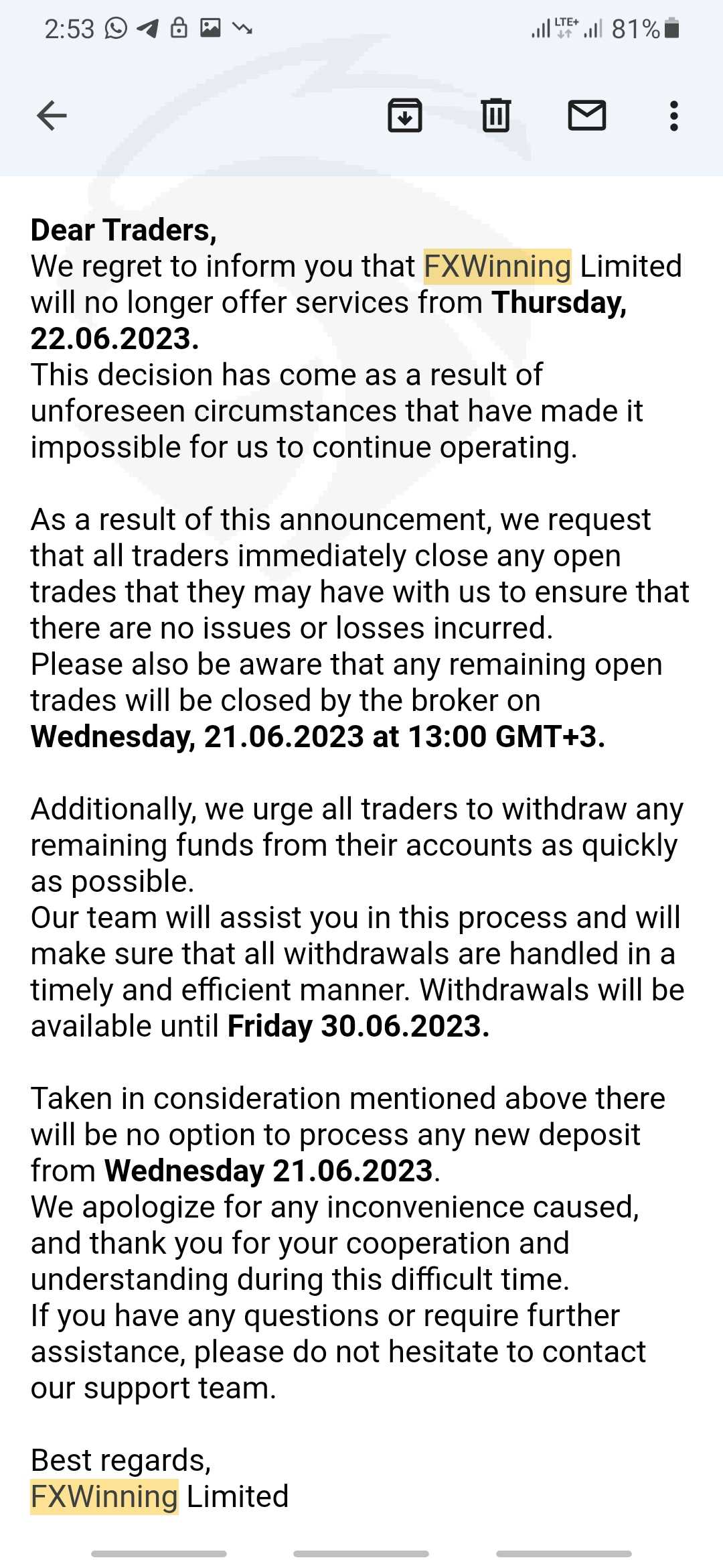 Dos retiros pendiente mi cuenta esta todo en en orden me notificaronn que mi cuenta esta aprobada de KYC y 15 días de hábiles me llegara el retiro de 300 pero nunca llego, el primer retiro fue solicitado 2023-04-20 ya estamos en julio . Después en 20 de junio 2023 me llego un correo donde indica que Fxwining apartir del 22 del mis mes y año ya no ofrecerá servicio y nos instaron a retirar todo el capital, de la misma fecha anterior solicite el retiro total de la cuenta de 1789.42 y no me han dado nada de respuesta