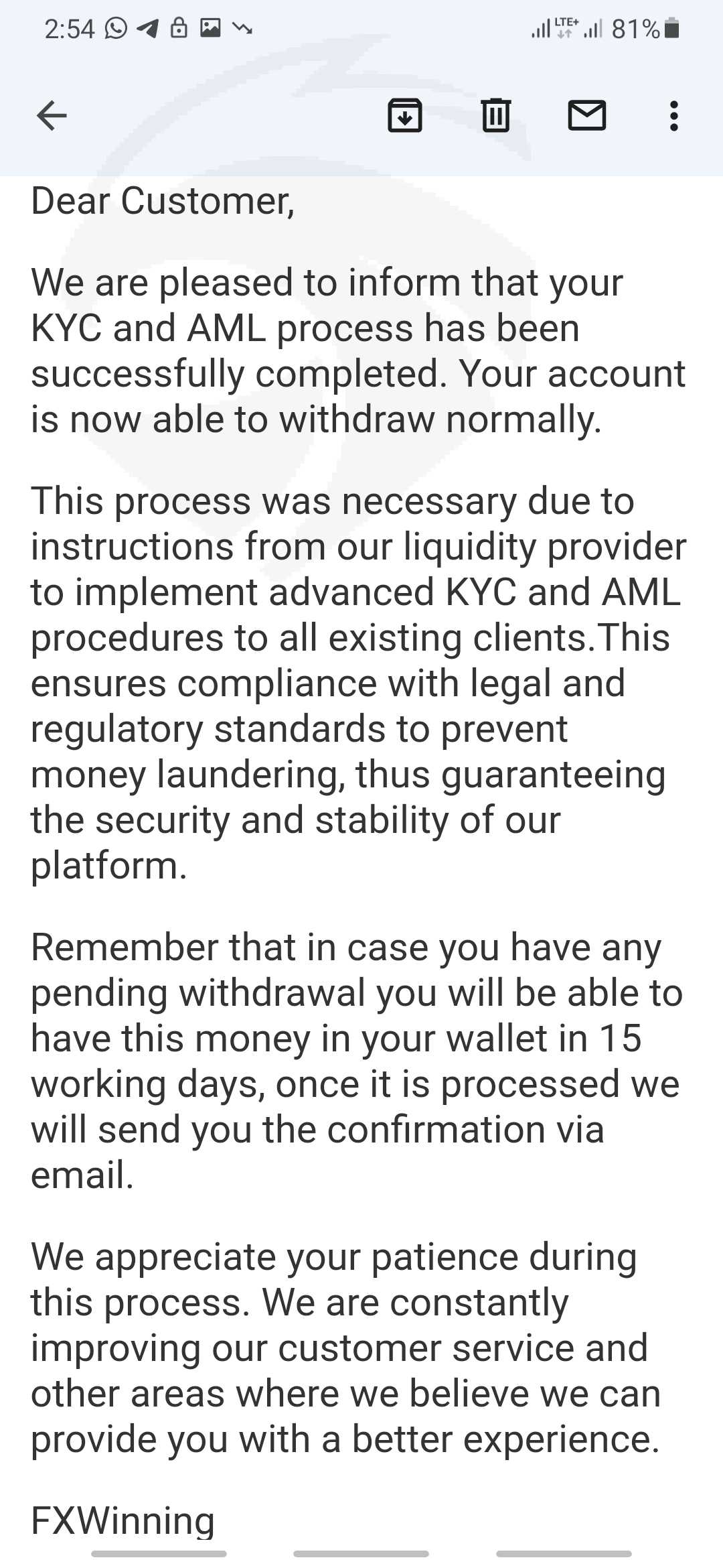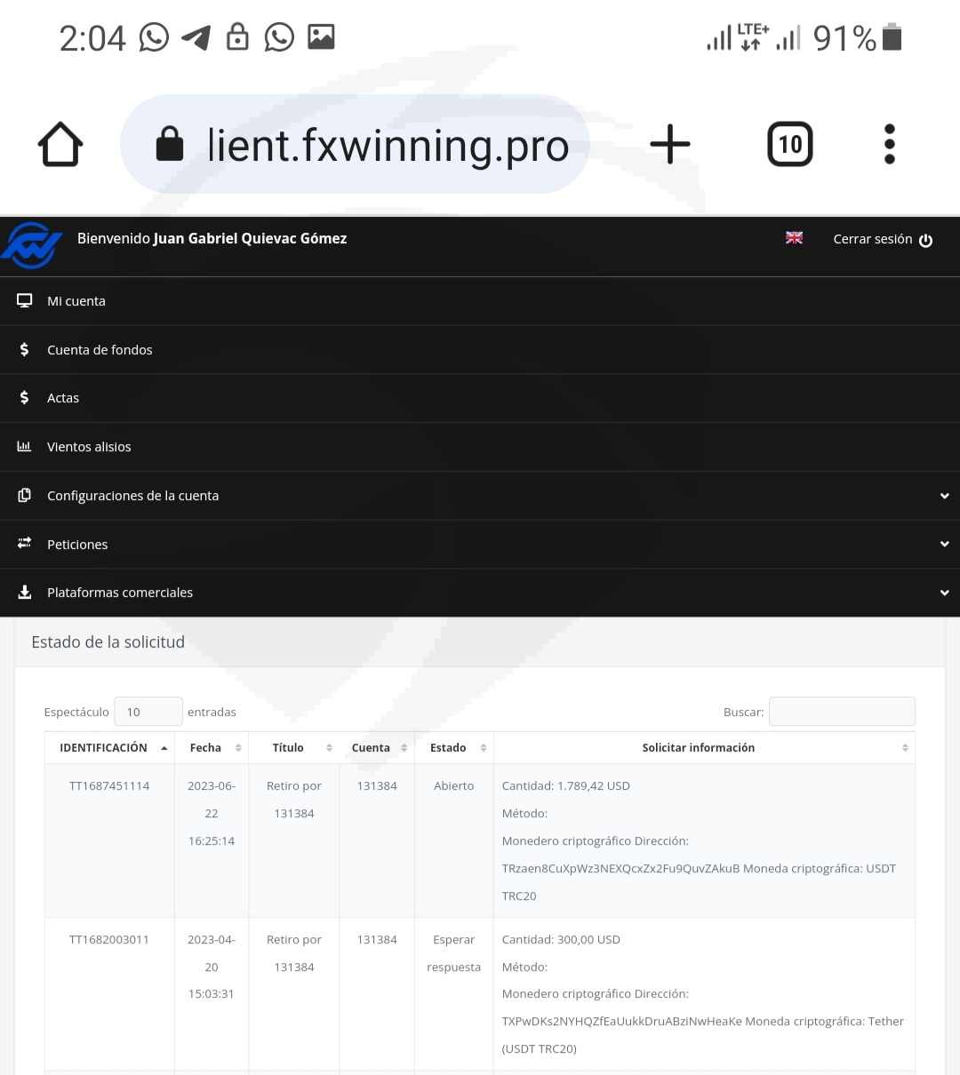 两次提款待处理,我的帐户一切正常,他们通知我我的帐户已通过 KYC 批准,并且 300 提款将在 15 个工作日内到达,但从未到达,第一次提款是在 2023 年 4 月 20 日提出的,我们已经在 7 月了。后来,在2023年6月20日,我收到一封电子邮件,表明从我所在月份和年份的22号起,Fxwining将不再提供服务,他们敦促我们提取所有资金,从同一天起,我要求提取账户1789.42的全部资金,他们没有给我任何回复