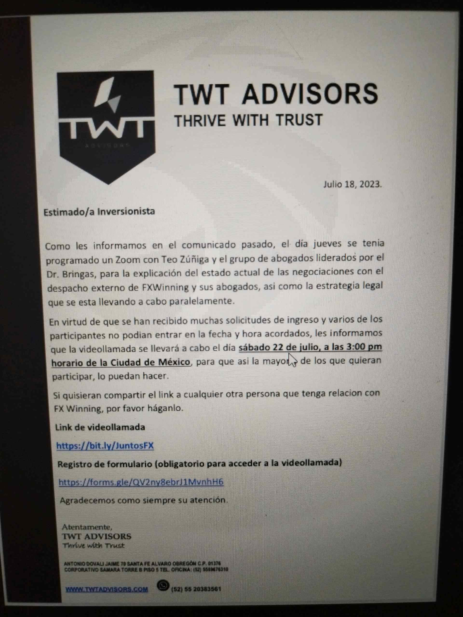 Dejo el enlace para que pueda entrar a ver lo que nos dan más largas con los pagos según ellos son clientes dice ya no son dueños de fxwining https://t.me/+zeBTCsfzX3I2YTdh espero cosas coherentes porque ma verdad no les creo nada teo Zúñiga lo conozco de iml hace 7 años y siempre dijo en sus redes de que fxwining era de él y hasta decía que el era el super trader qué manejaba el fondo hasta que se descubrió que siemore fue turbo
