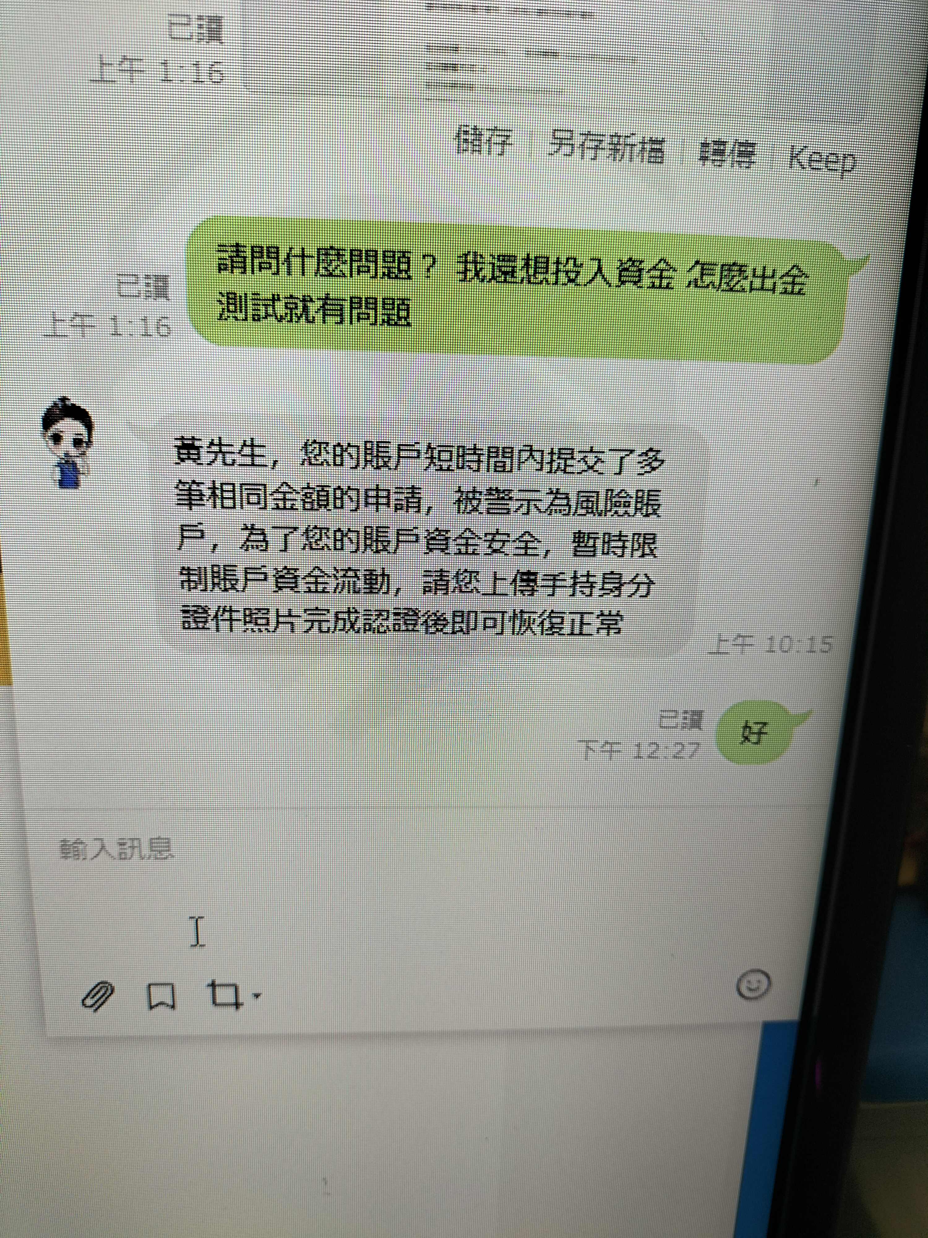 從探探 認識女網友 在聊天中知道有再做外匯 好奇 跟著操作 10萬元 有賺到小錢後 教我出金5000多 後來又存入20萬 操作 ,直到幣託客服聯繫說 提供平台資料 不要再放錢進去(本來還要繼續丟錢) ,我就再嘗試出金 給我理由 被警示為風險賬戶,為了您的賬戶資金安全 不出金