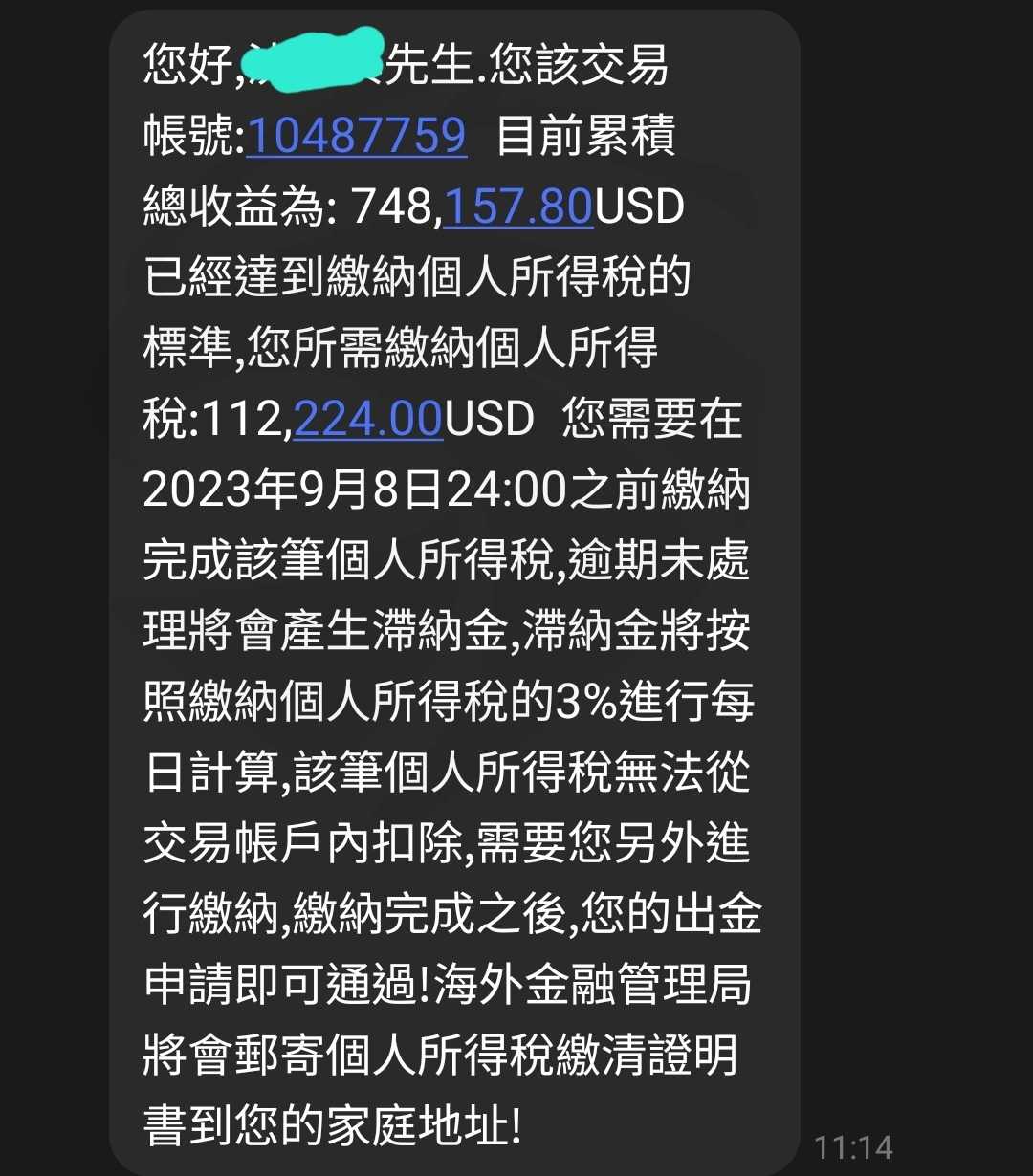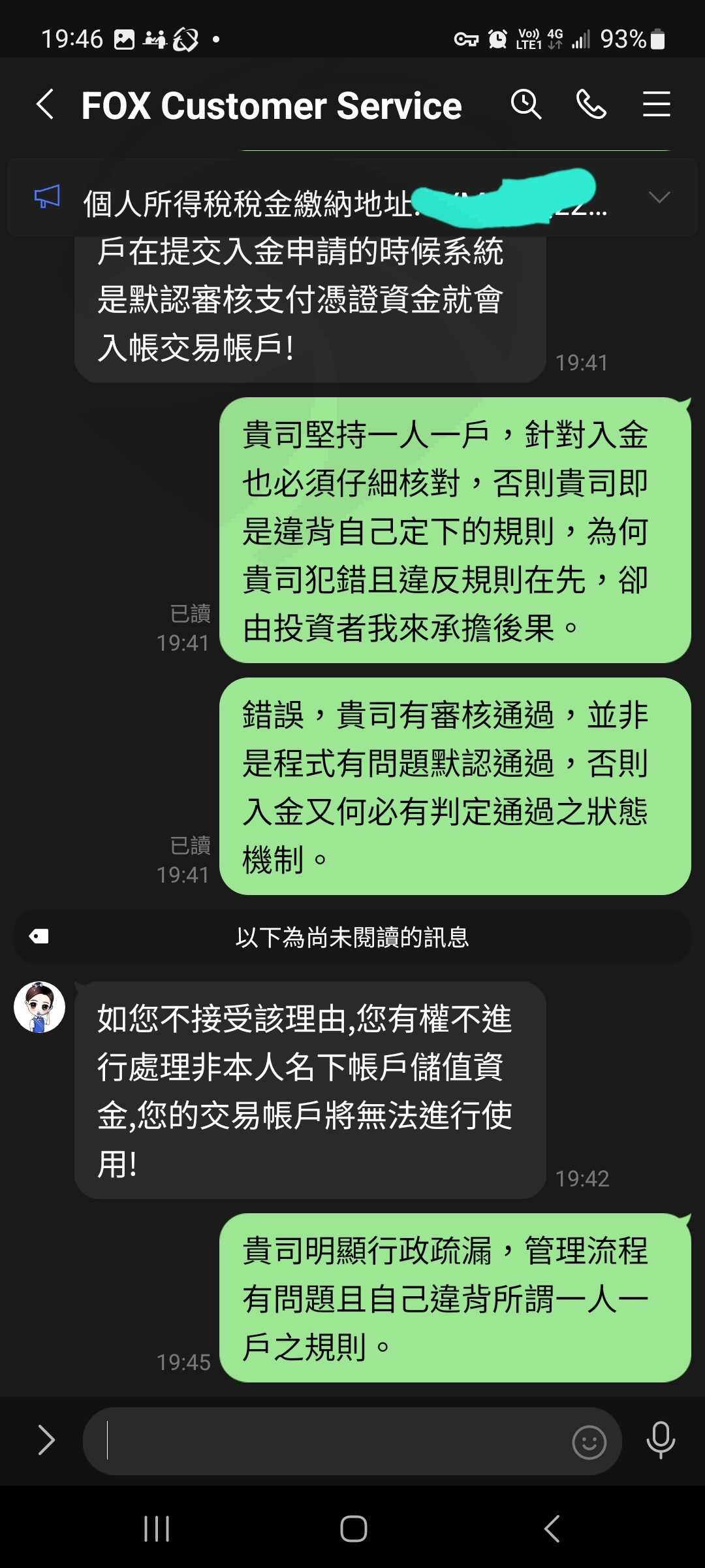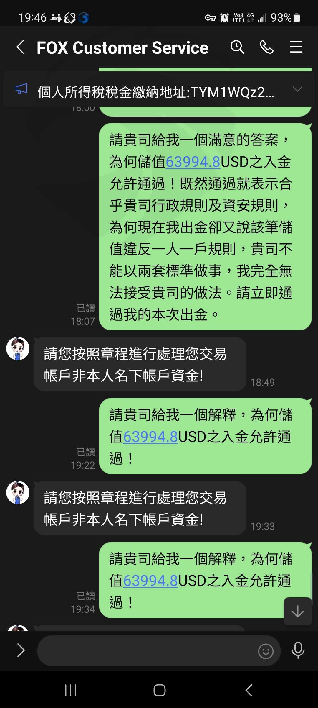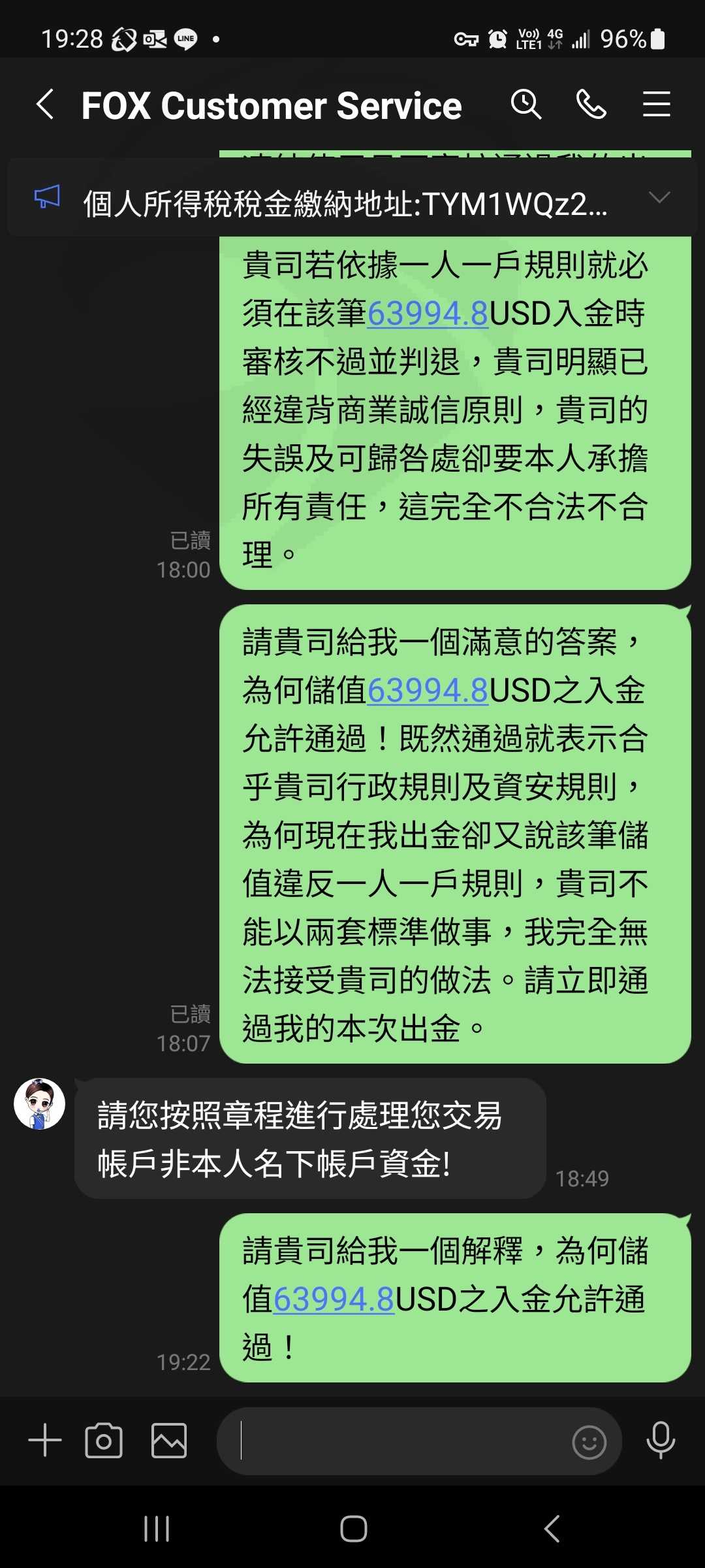 本人正常入金儲值到Fox Global後,開始進行交易並於獲利後申請出金,但該平台要我先繳個人所得稅金後才能通過出金審核,我繳了個人所得稅後不僅無法出金,該黑平台聲稱我的帳戶入金出現一筆非本人名下(錢包約定之地址)儲值,違反該平台一人一戶規則並直接凍結我的帳戶及出金流程,且要我重新對該金額儲值後才能順利通過出金。