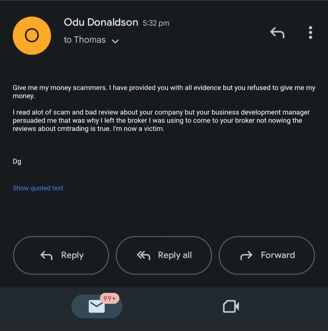 我在 cmtrading 交易,出金很少,但当我入金大笔资金时,cmtrading 拒绝处理我的出金,告诉我他们误将资金发送到我的账户,而我没有看到,因为我的地址变了。他们还在未经授权的情况下关闭了我的交易账户,我对此提出了投诉。在 Cmtrading 的 Caesar 说服我使用他们的平台之前,我曾与另一家经纪商进行交易。他们拒绝给我钱。cmtrading 很糟糕,他们的牌照都被吊销了。他们私自用我的账号进行交易。cmtrading还我钱。