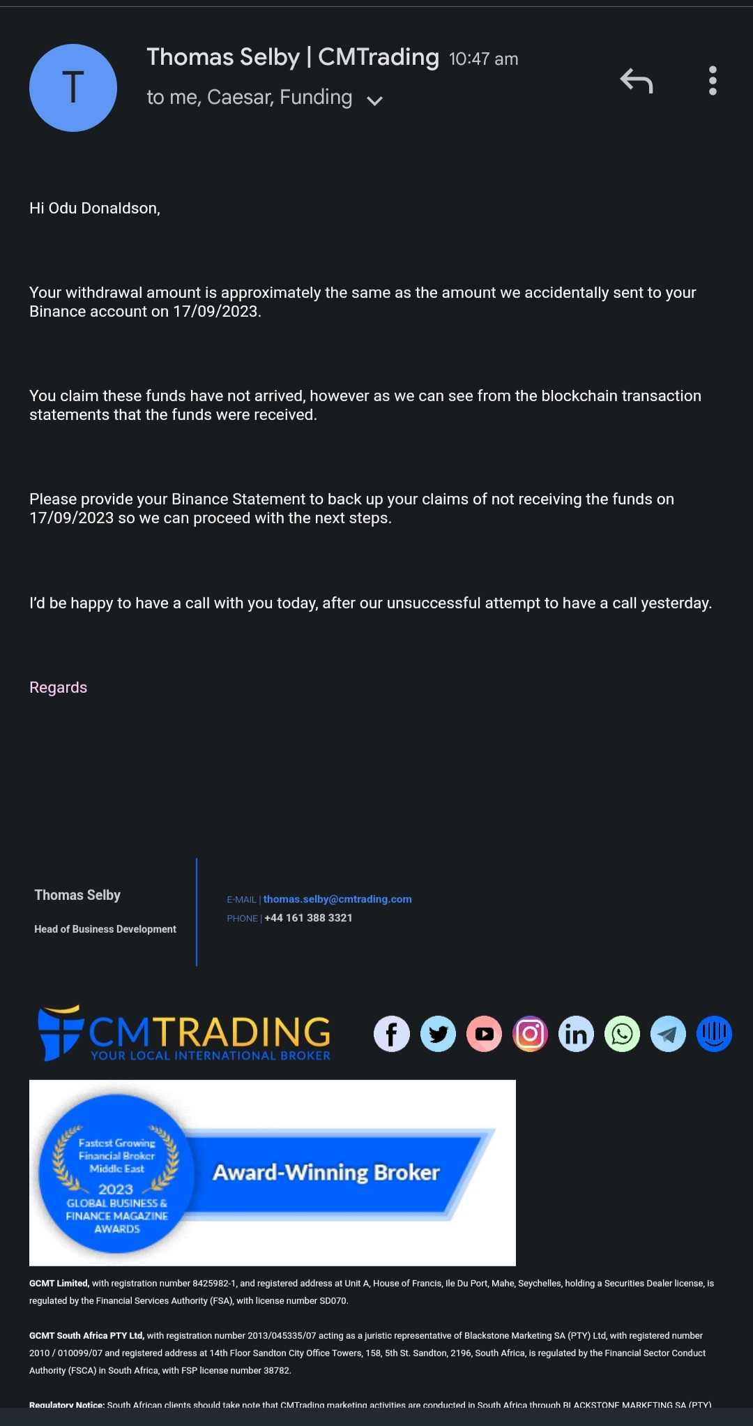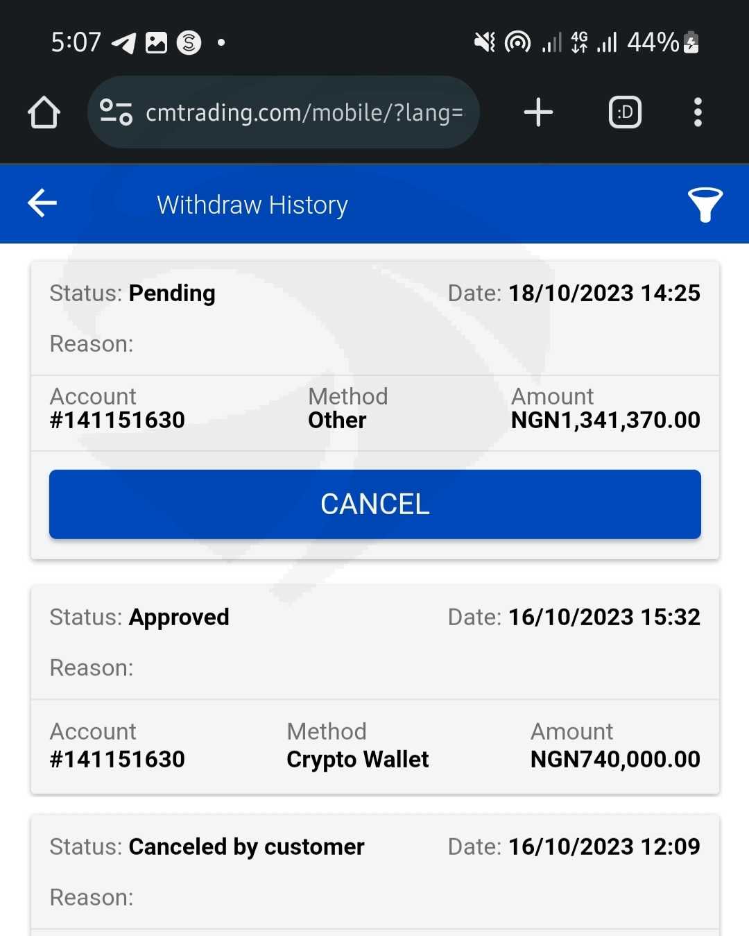 I traded with cmtrading and withdrew little moneys but when I deposited huge fund cmtrading refused to process my withdrawal accessing me that they mistaken send fund to my account which I didn't see because my address changes. norther have refused to pay me my money because of the false account they refused to give me my money.