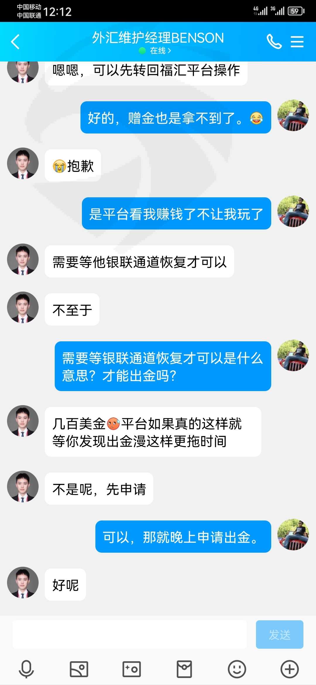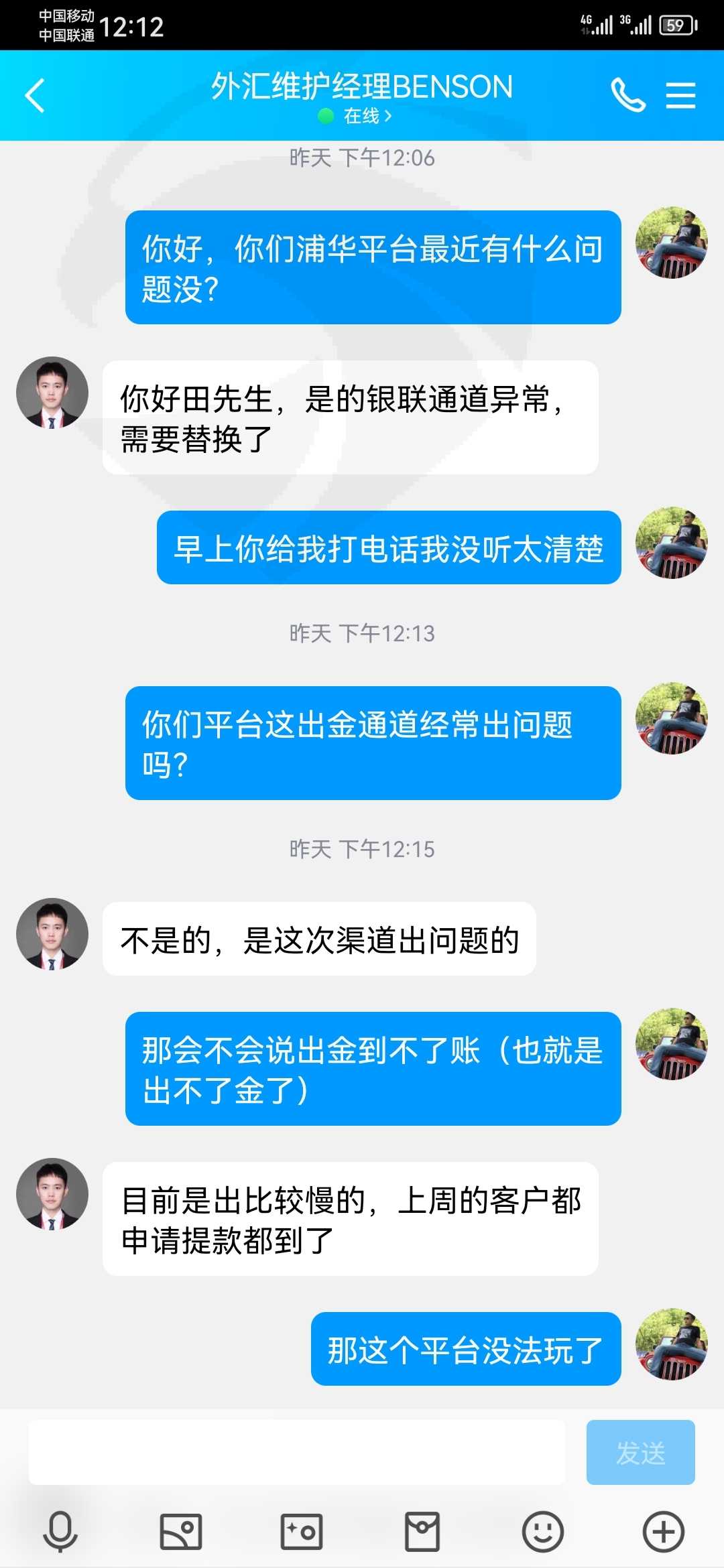 2023年10月初一个推销员说诱骗我来浦华开户,10月18日我入金操作,等到10月29日,这个推销给我打电话说平台出金通道有问题,出金会慢,大概需要一个礼拜才能到账。于是我在10月30日上午平了账户里所有单子,开始出金,结果中午这个推销又给我打电话说出金通道被查封了,出不了金了。全程电话我都有录音。