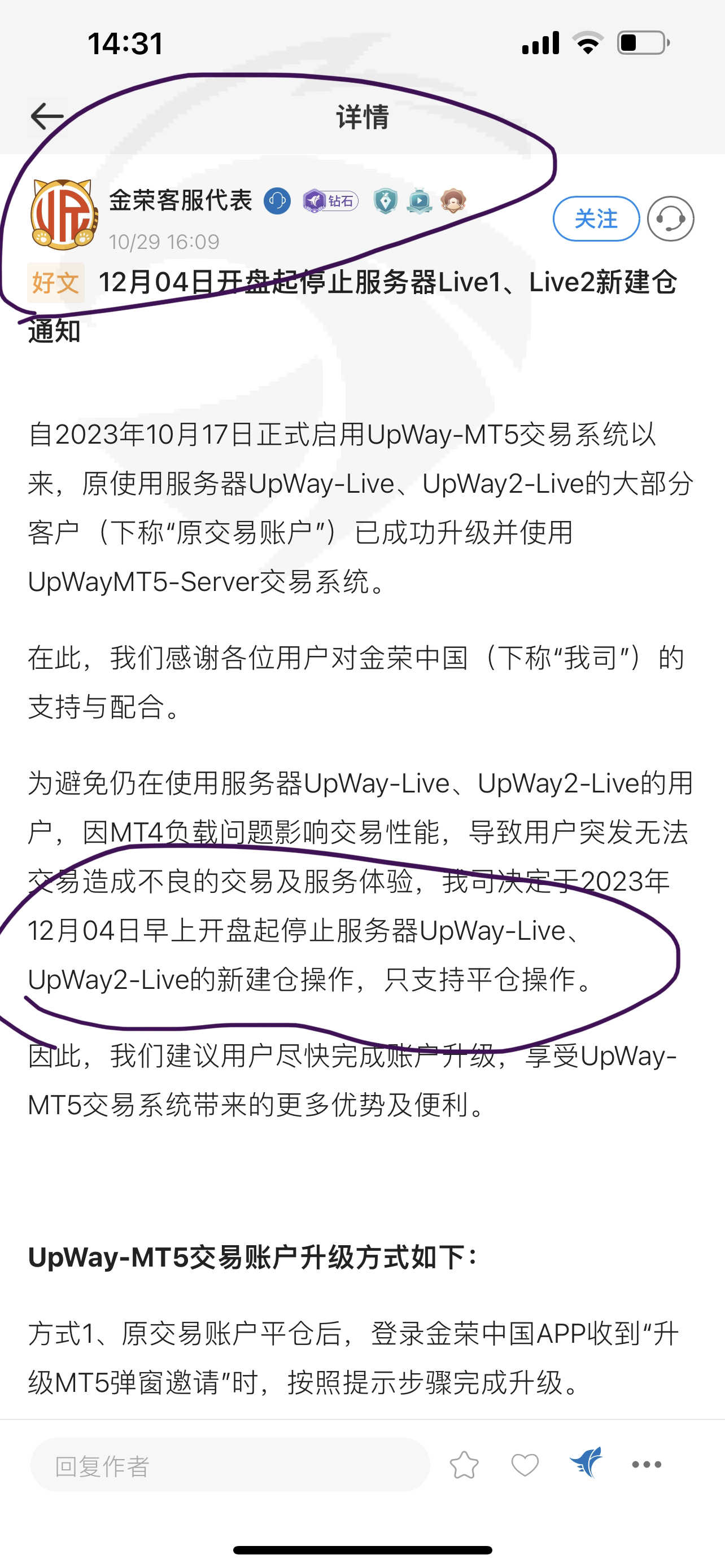 今年10月 金荣中国以需要升级服务器为由,要求旗下20,30开头的账户持有者升级账户,否则12月4日起不能再进行新建仓交易。但是在升级前要先平掉账户里所有的单子。否则12月4日后该账户只可出金入金不能够新建仓。就意味着对于账户有套单得客户,要么强行平仓升级,要么不能开新单不断入金扛仓直到账户的单子自己止盈。金荣客服说给了两个月缓冲期,实际上正式通知为10.29日,还仅仅在金荣圈平台发布,并没有挨个打电话通知客户。美其名曰缓冲期,事实是行情不会因为你的缓冲期而变化。金荣中国完全不顾客户利益,一刀切的手段,已经属于侵害了客户权益。此平台非常不靠谱!而且该平台多次遇到出金卡被冻结的情况!