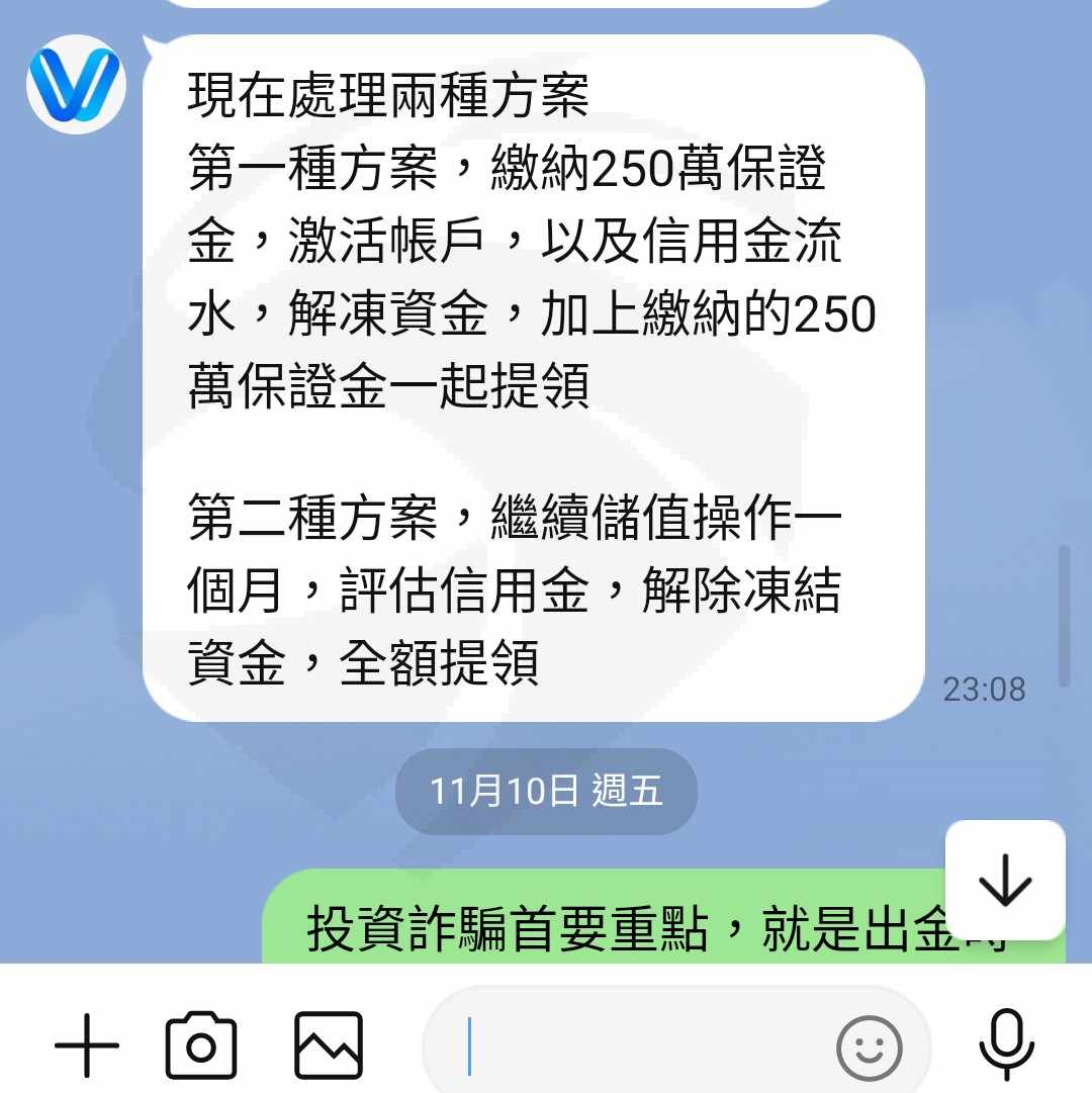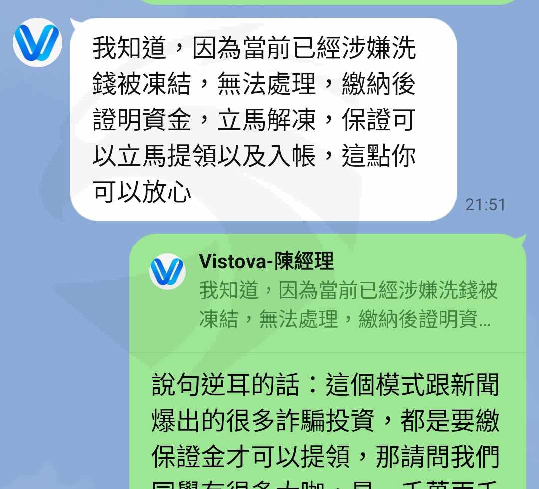 11月初加入以郭振榮老師領軍名為寶鑫投顧菁英團隊的匡世濟俗複利計畫,Vistova為交易商,以陳經理為客服,我個人投入資金台幣510萬,操作原油及黃金差價合約,帳面上每次操作皆有獲利,且老師口口聲聲標榜可隨時提領天天提領,愛提領多少皆隨人自由,本人前後共提領兩次共170萬,但就在第三次提領時,被告知資金遭凍結無法出金,必須繳納投入成本資金500萬的1/2即250萬,方可出金,個人驚覺遭受詐騙,堅決不再付款,只希望能將剩餘本金340萬提領出來,對方拒絕同意,執意要我繳入保證金250萬,說只要繳入保證金就就可成本連同保證金一起提領出來...一堆理由藉口阻止出金,詐騙行為另人不齒!