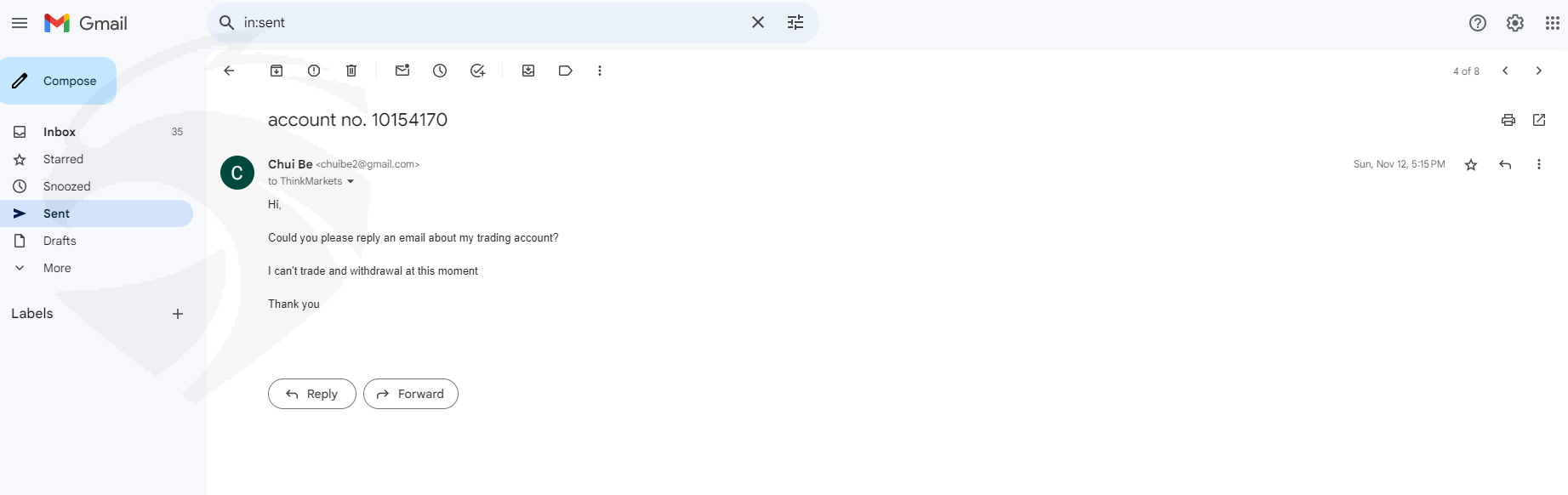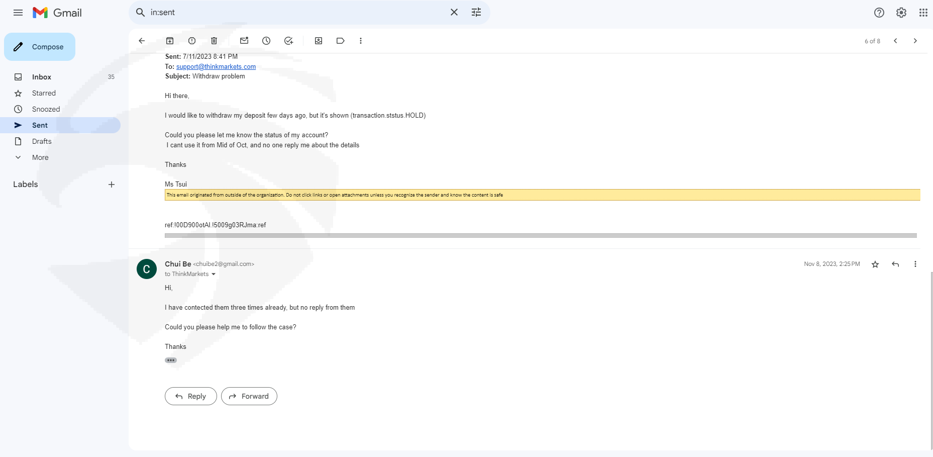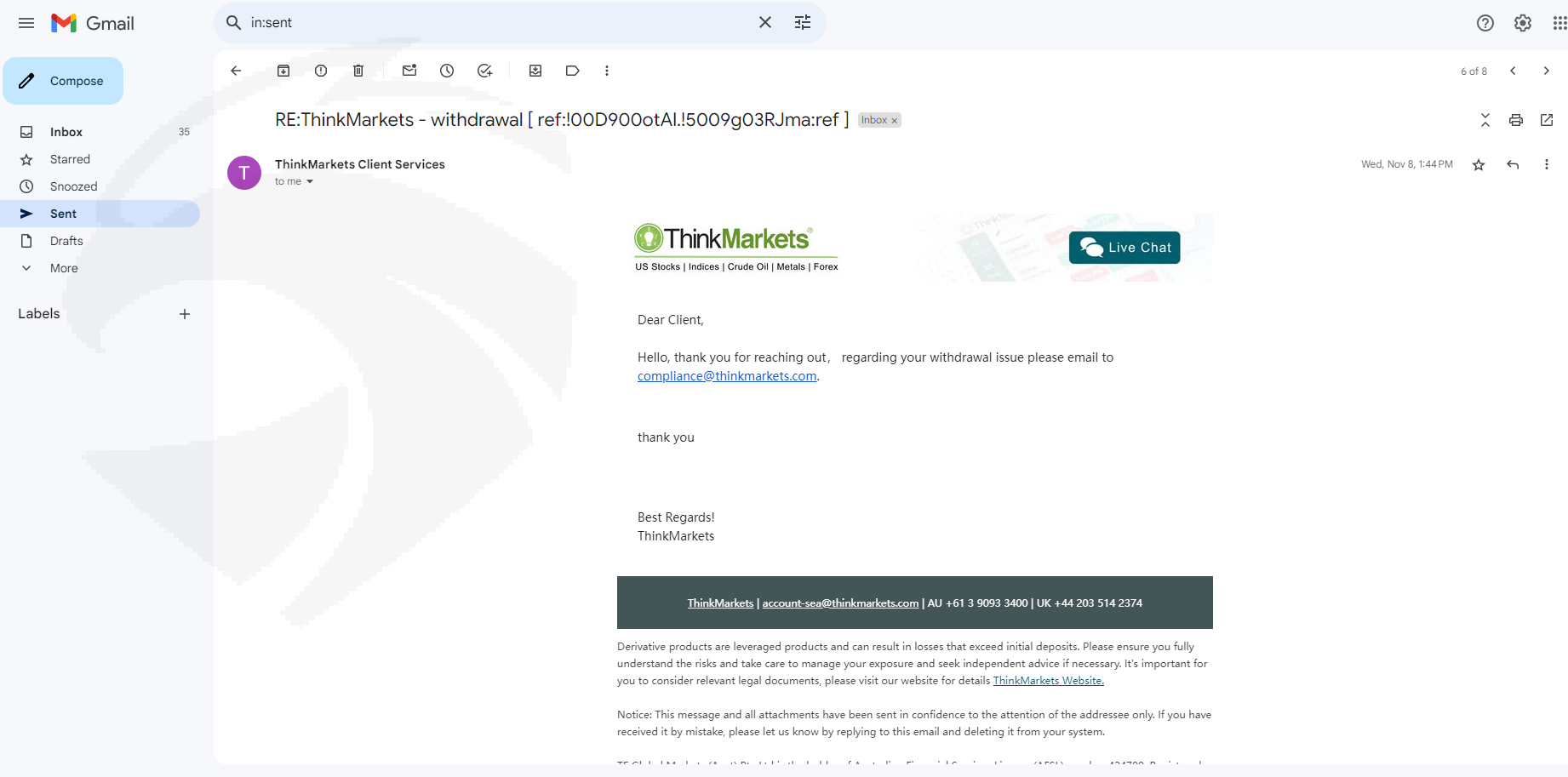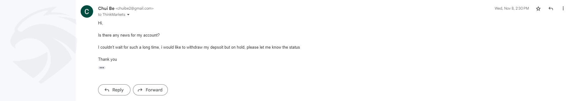 ThinkMarkets惡意不出金,email沒有回覆找過客服/不同部門,但也沒有得到有關出金安排的回覆, 只希望thinkmarkets可以正常出金