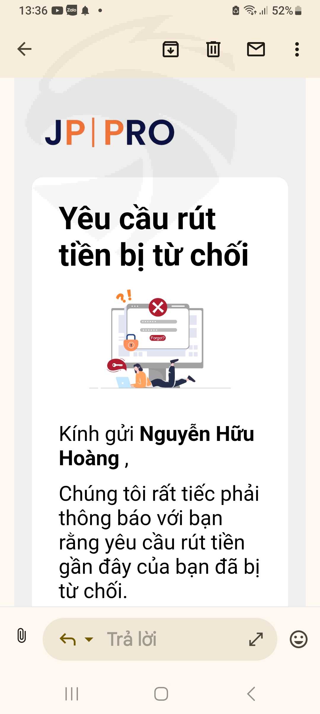 Nhờ các bạn giúp đỡ, tôi đã chuyển 50% tiền phí Bot và họ hứa cho rút, nhưng khi tôi chuyển xong họ quay 180' nói lý do bị trễ 2 ngày đóng cổng không cho tôi rút, tôi đã đặt 4 lệnh rút nhưng điều bị từ chối, số tiền tôi đóng phí là 13.300$•Toi tha thiết nhờ sự can thiệp giúp đỡ của quý vị giúp đỡ tôi để được rút tiền từ tk JP Pro. Trân trọng và biết ơn