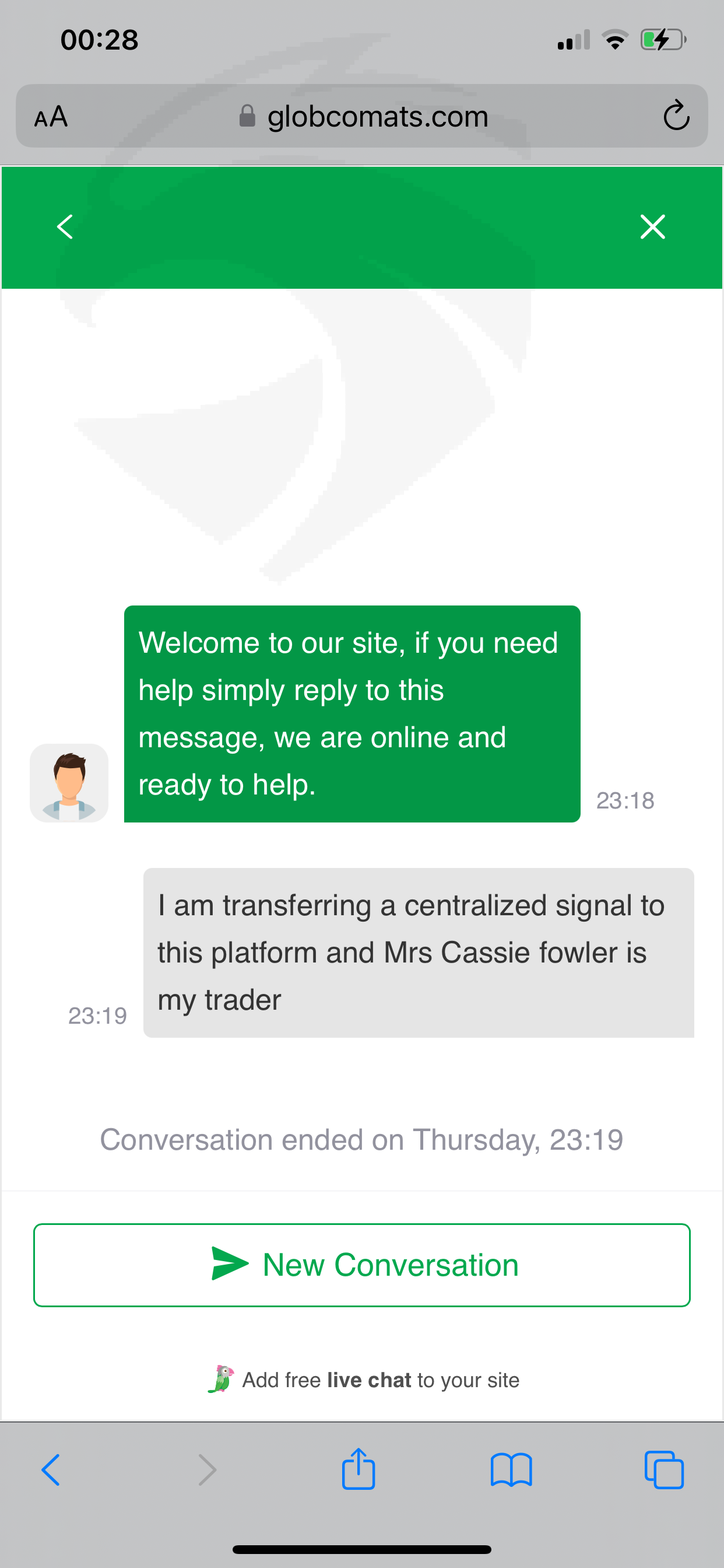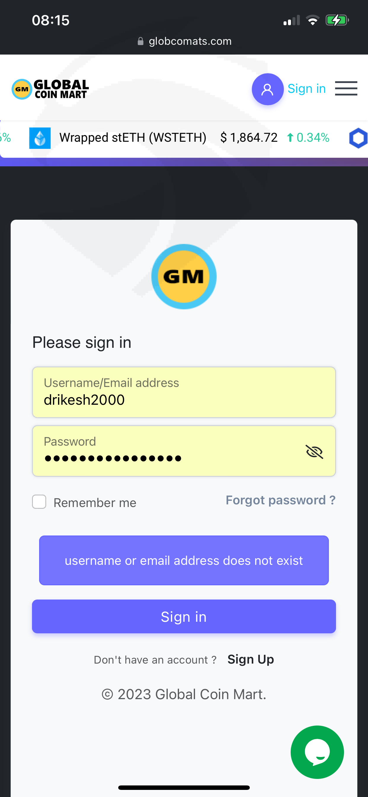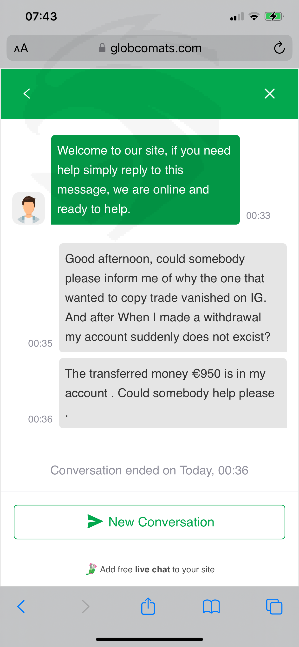 我在网站 www.globcomats.com 上开设了 Global Coin Mart 账户。我的账户已通过验证,资金(950 欧元)已转入我的账户。在注意到我打算跟单的交易员在 IG 上消失后,我试图取款。一天后,我的账户没了。