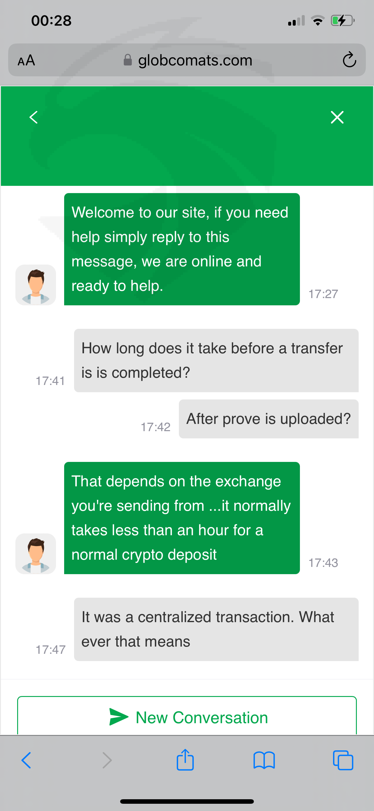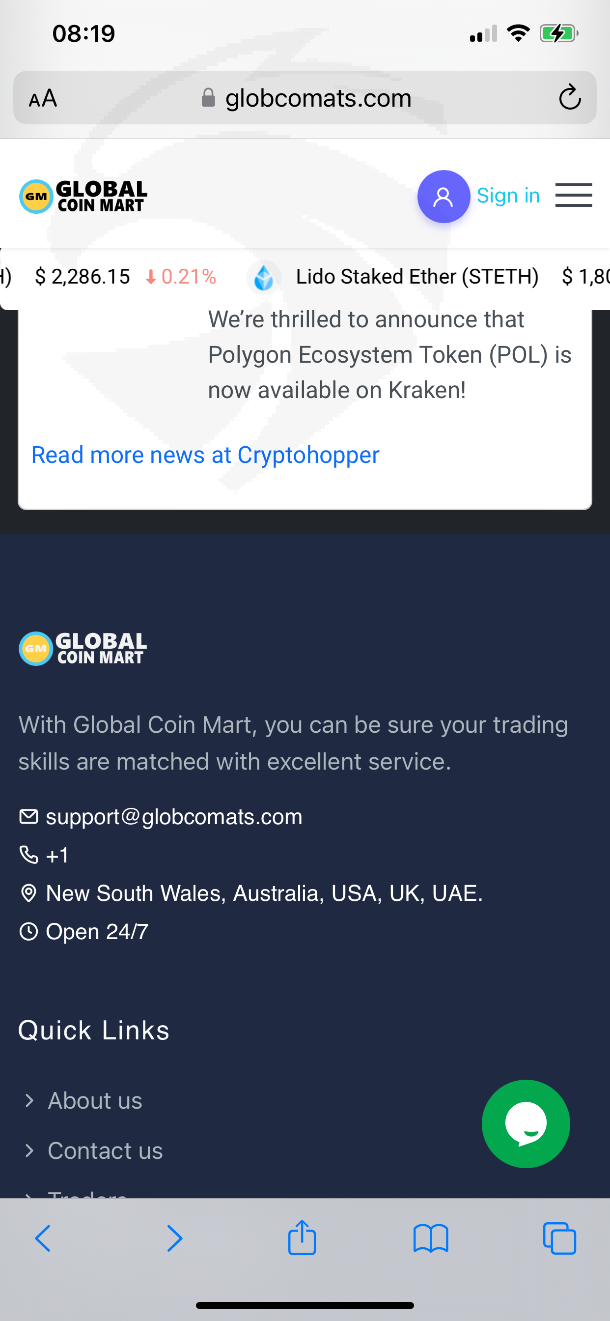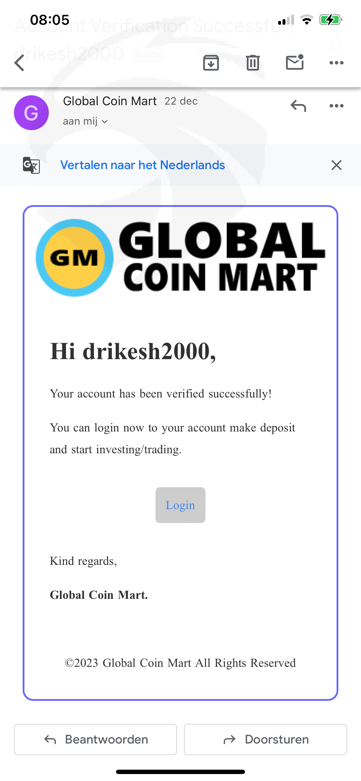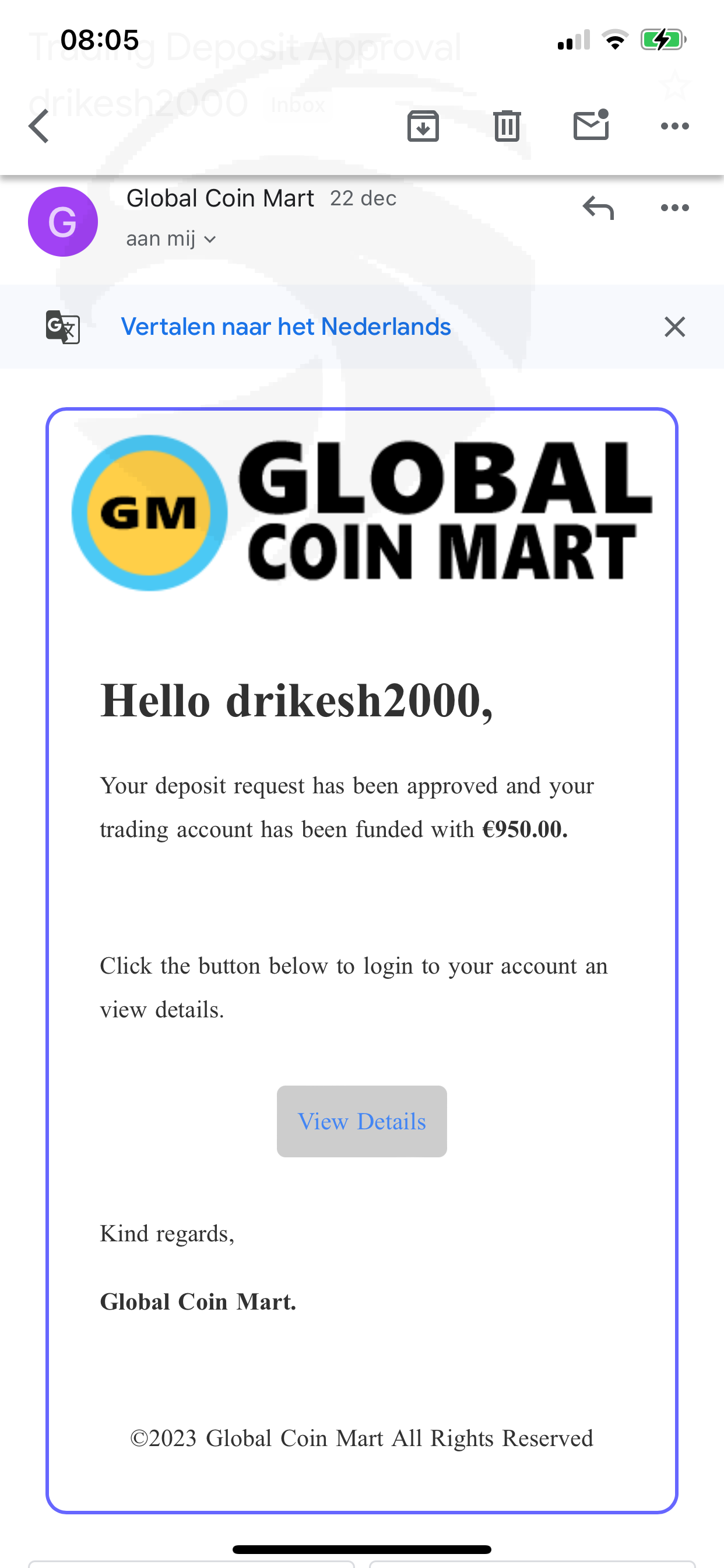 我在网站 www.globcomats.com 上开设了 Global Coin Mart 账户。我的账户已通过验证,资金(950 欧元)已转入我的账户。在注意到我打算跟单的交易员在 IG 上消失后,我试图取款。一天后,我的账户没了。