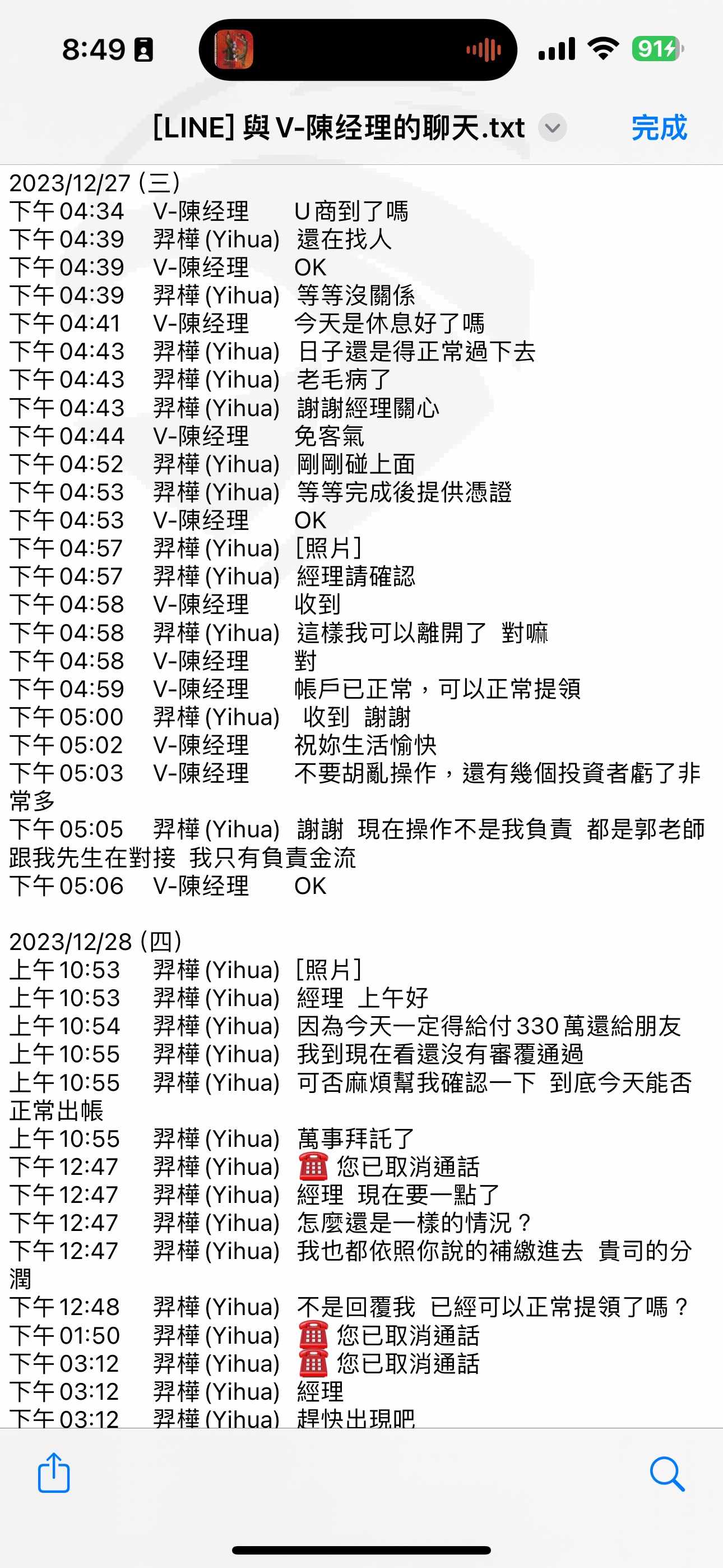 11/01參與寶鑫投顧郭老師的計畫,前後總共入金2300多萬,12/25欲申請出金330萬,遭Vistova陳經理說需補繳手續費近47萬,12/28存入指定錢包後仍無法出金,並失去聯絡。12/29正式向警局備案通報金融詐騙。
