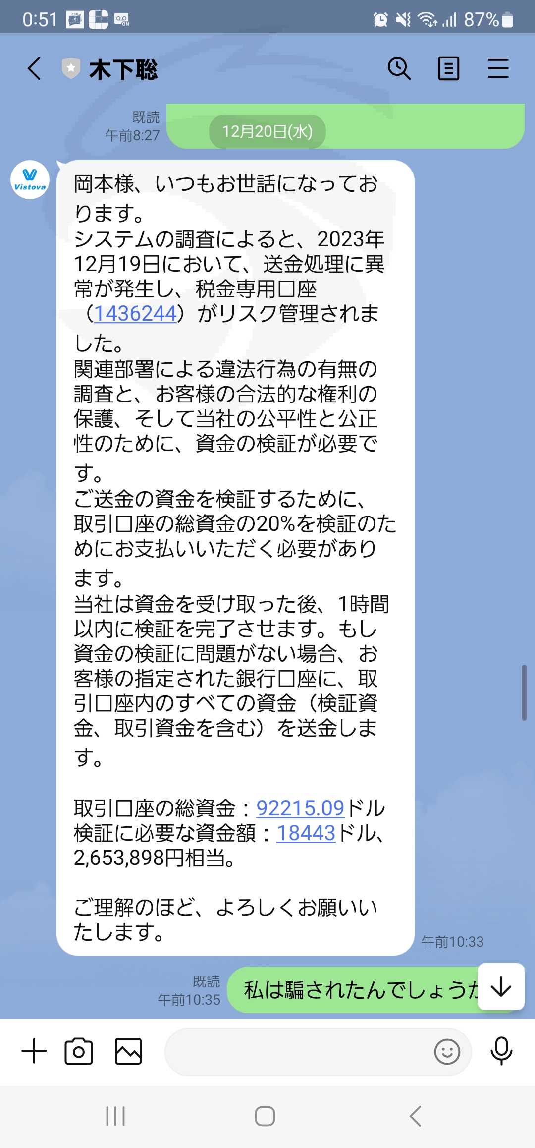 当我申请提款时,我被扣了税,2023年12月19日,汇款过程中出现错误,我的税务账户(1436244)被置于风险管理之下。资金核查是相关部门调查确定是否存在违法行为、保护您的合法权益以及本公司公平公正所必需的。为了验证您的转账资金,您需要支付交易账户总资金的20%进行验证。我们在收到资金后1小时内完成验证。如果资金验证没有问题,我们会将您交易账户中的所有资金(包括验证资金和交易资金)转入您指定的银行账户。交易账户总资金:92,215.09美元 验证所需资金金额:18,443美元,折合2,653,898日元。我收到一条消息说。请立即提款