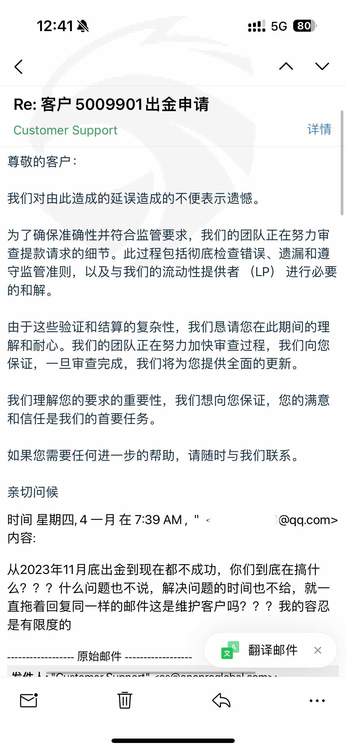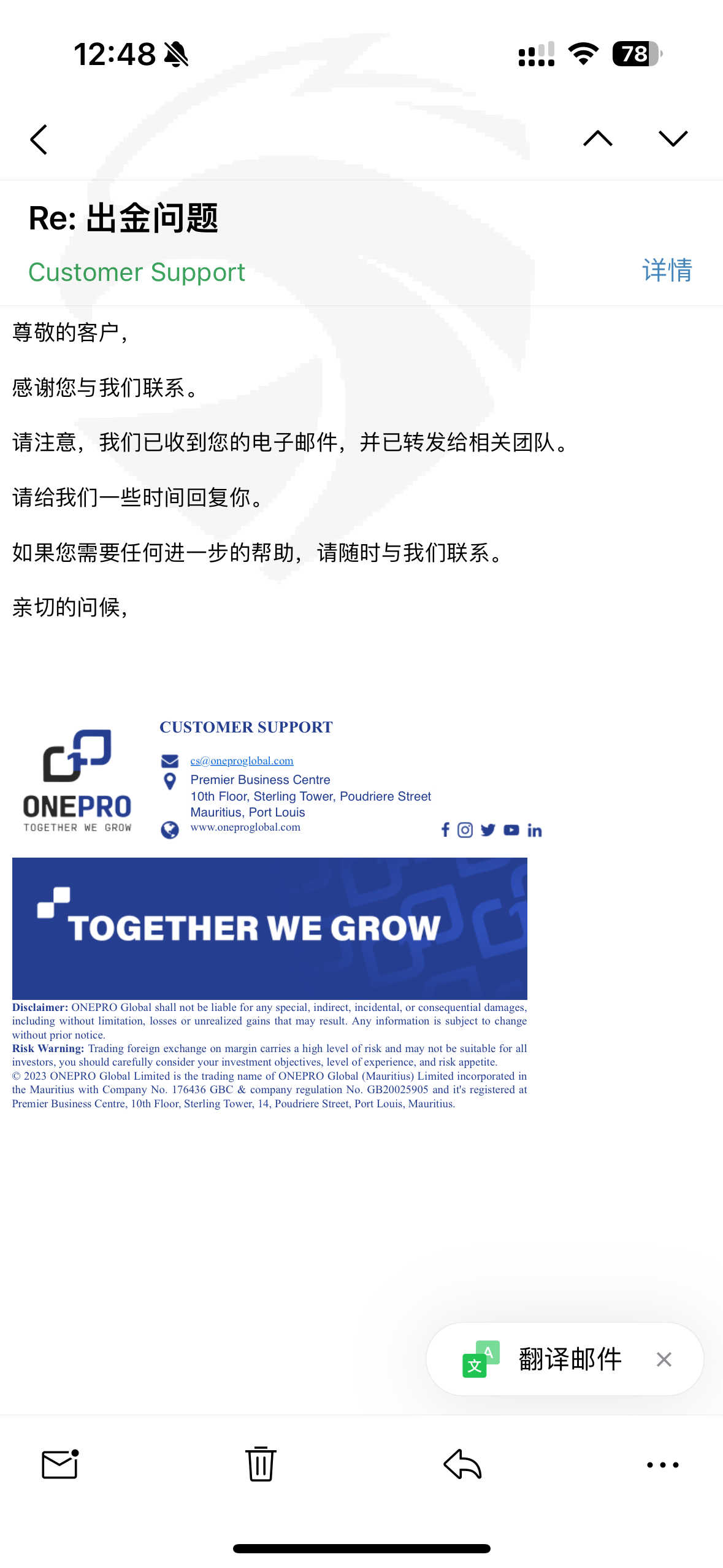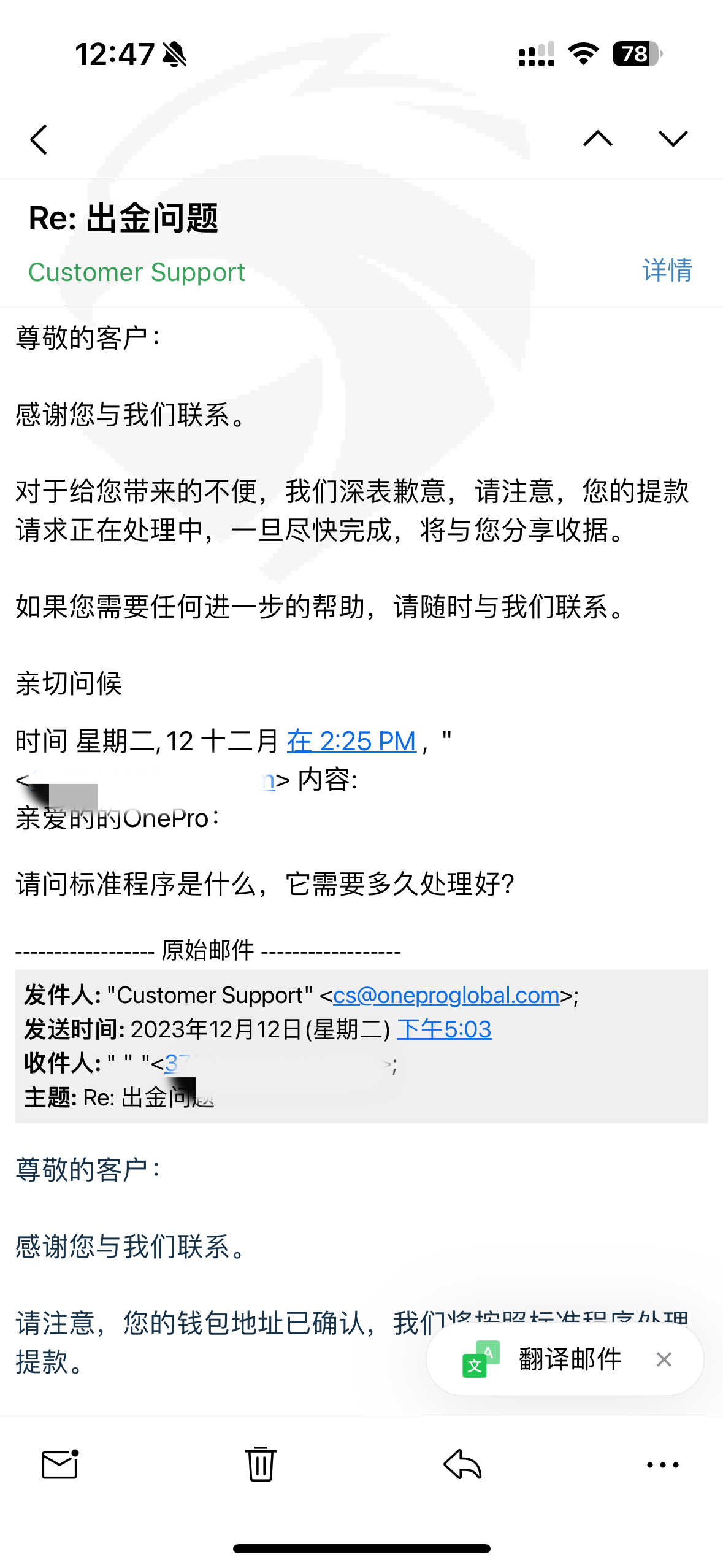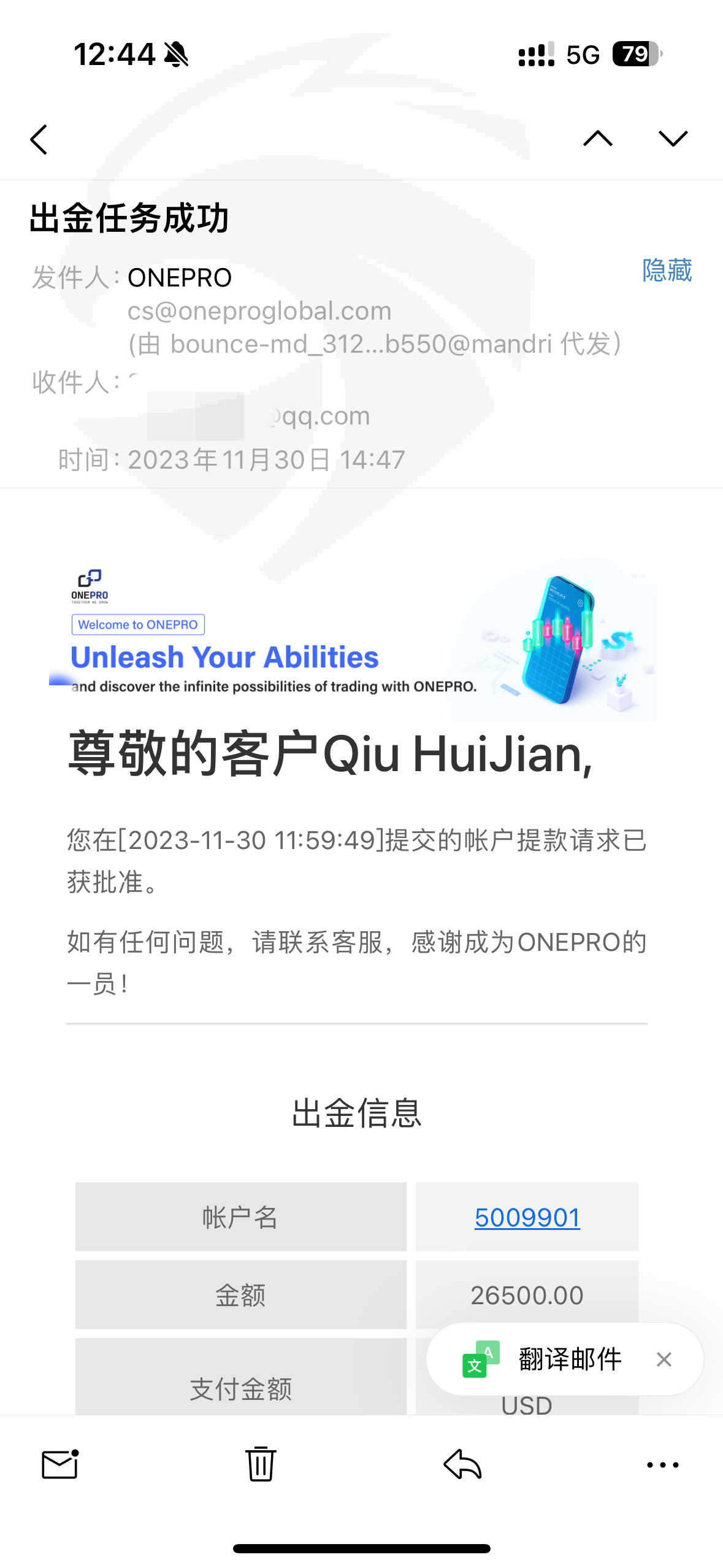 在2023年11月30日在onepro盈利申请出金至今仍未成功。平台一直无论是发邮件回复都是重复的“审核我的订单”这样的字眼就是避而不答。(我的交易订单没有问题,没有短于3分钟,也没有快进快出,也没有借助别的软件做单,纯手工做。)