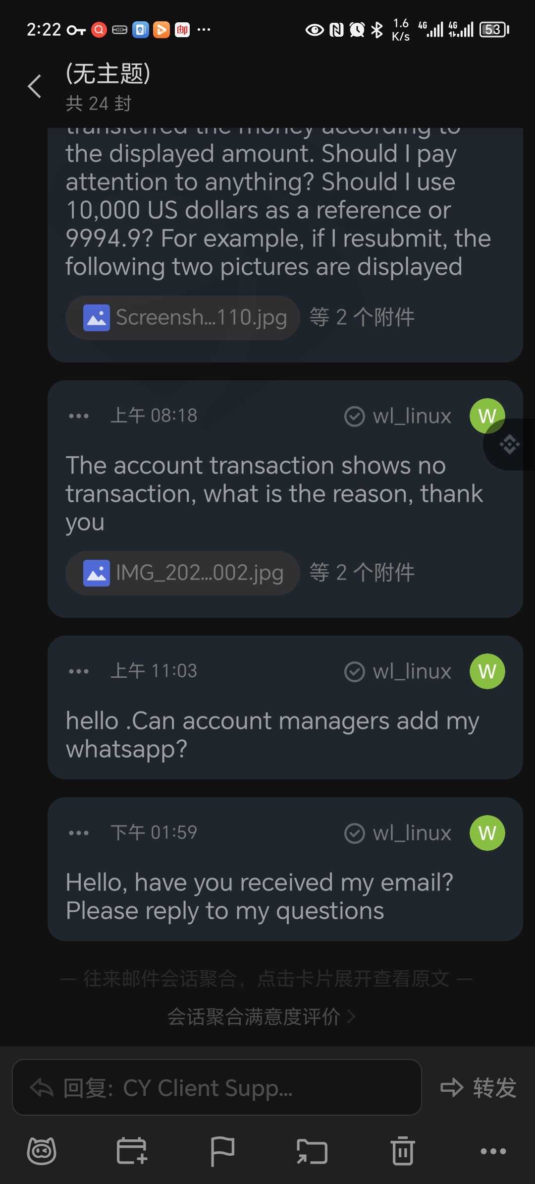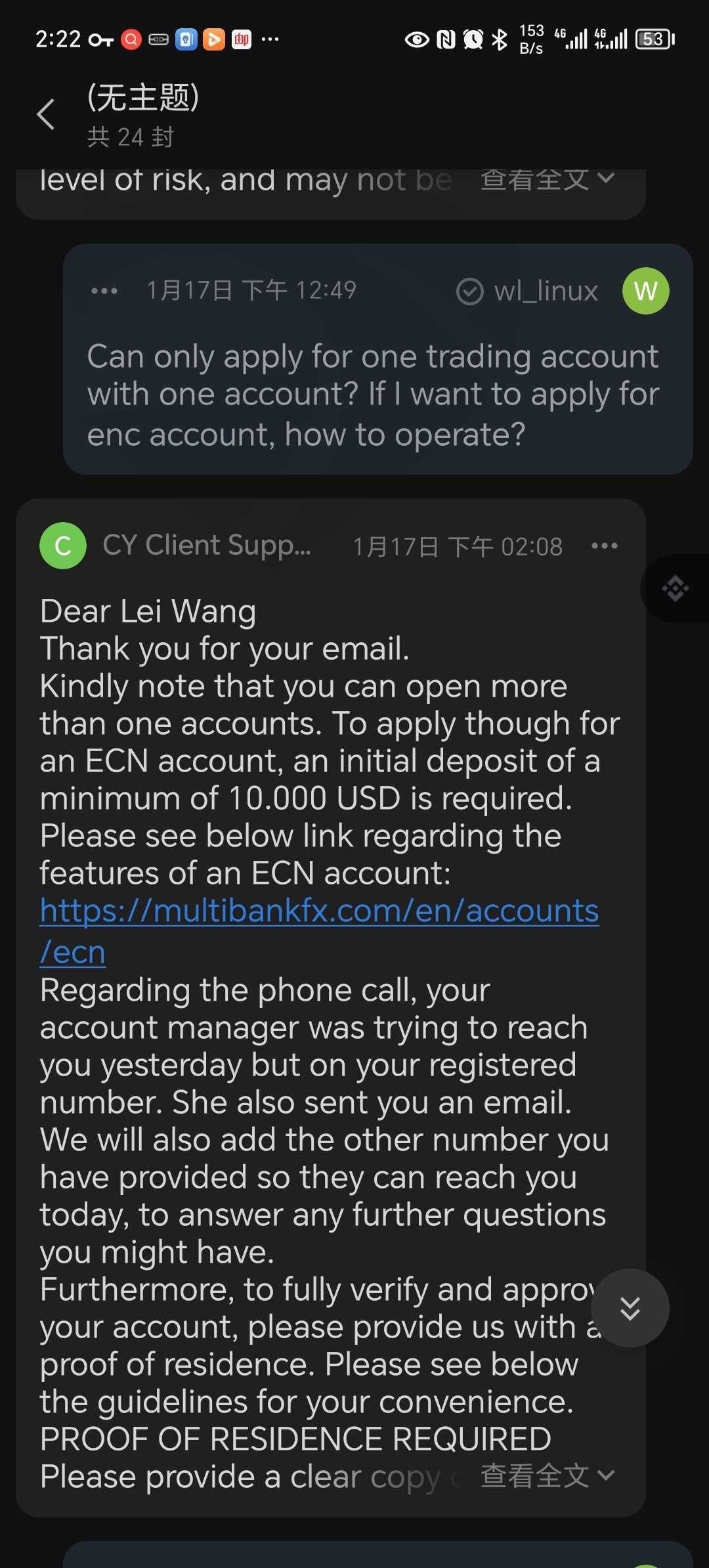 按客服要求入金10000美金,开通ecn账户,在我入金后并得到账号开始交易的时候,系统显示禁止交易,向客服邮箱发送多个邮件都无法得到有效回复。