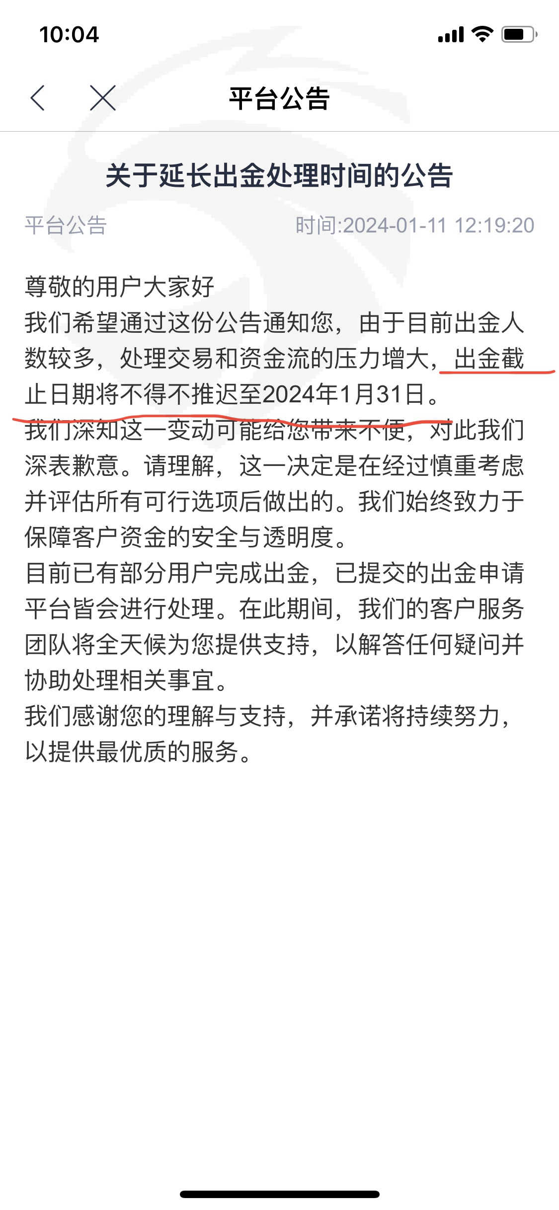 从1月3号后出金一分钱没到账,平台说1月14号前统一出金,现在又改1月31号,一天拖过一天,找客服就只让等,又不给处理,现在连app都打不开了,黑平台已卷款跑路