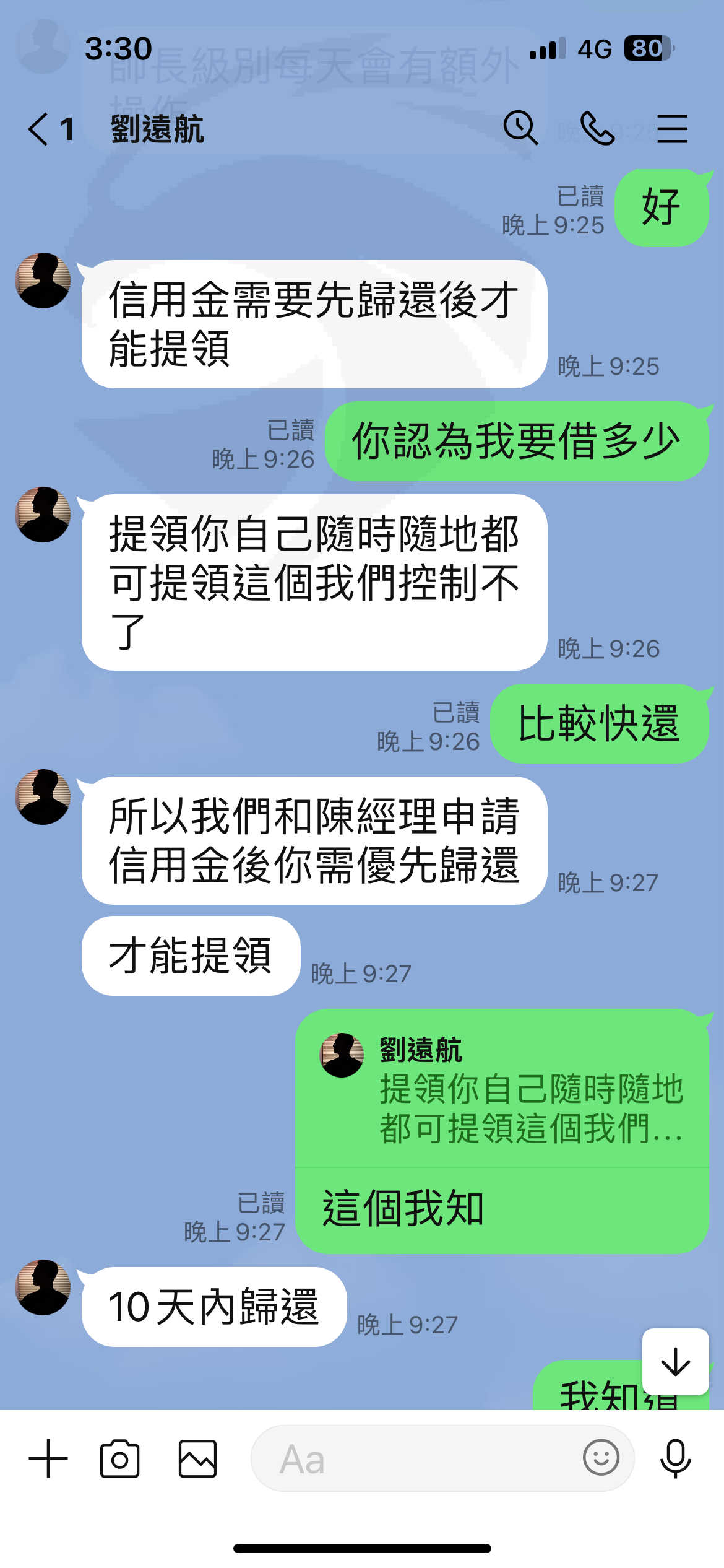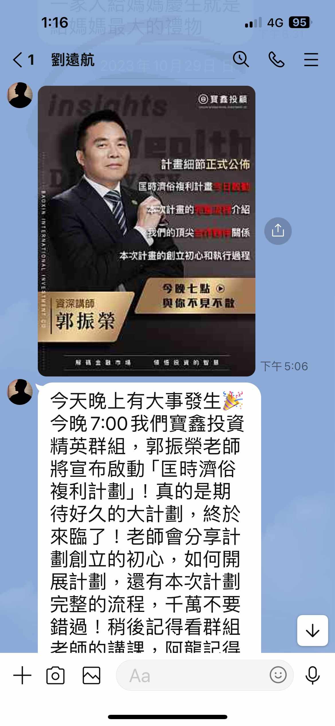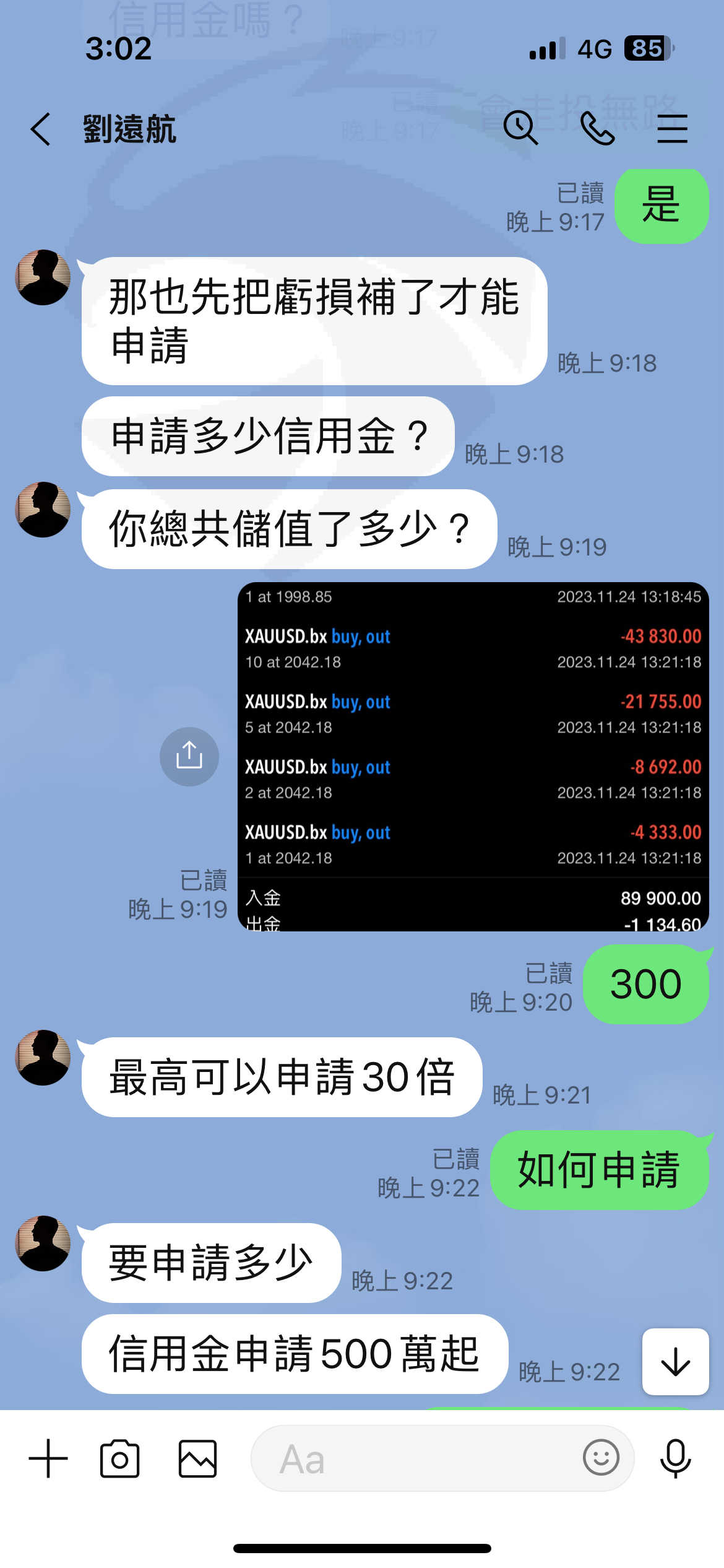 於2023年9月初在FB -頁式廣告加入寳[d841][dcfe]投顧由劉遠航帶領下而操作台股每日晚上由老師郭振榮在line群組中名稱寳鑫投顧精英小隊分析台股,9月底因台股不易操作10月中旬推出差價合約用台幣更換USDT幣於10/25左右由劉遠航鼓吹之下保證獲利但須抽高分成並說在股市虧的會在補償,帶領在Vistova開戶申請帳號 而操MT5 每次入金需找V-陳致遠由他找U商並給錢包地址更換USDT幣. 出金設定金融卡自行提領,起初投資現金30萬台幣在劉遠航帶領每天2次操作操作並控制在三分之一水位而有獲利並出金3次過共36000元而相信,在平台上上下震盪4000點而爆倉一共3次資產為負數有補足一共投入340萬台幣最後於11/27跟寳鑫投控劉遠航連絡可借500萬信用金起,跟V-陳致遠要了錢包地址並入金.想早點獲利並還錢歸還日為12/6。起初只說不能出金提領他們無法控制,並沒有說會把帳戶改為信用戶,於11/28再度於V-陳致遠確認帳戶為信用戶控管,無法提領當下有跟劉遠航提出抗議並恊商先將20天於12/5分成繳清約300萬後,信用金的部份由他處理等提領後再歸還由他提供錢包地址再匯入,我跟劉遠航說明要繳納分成和歸還信用金須提領出來劉遠航說如不還不信用金及分成一切交由平台法務處理12/6 V陳致遠說信用金不還一切交由法務處理及相關法律問題我說好一切等法務處理 我有問到是法務出面就能解決所有出金問題 他說是的對