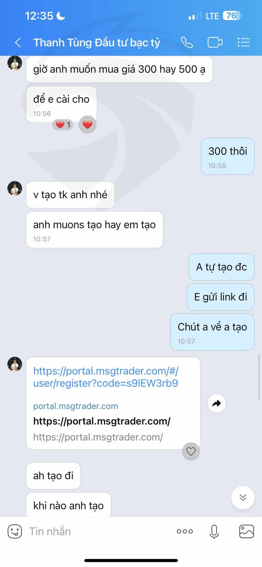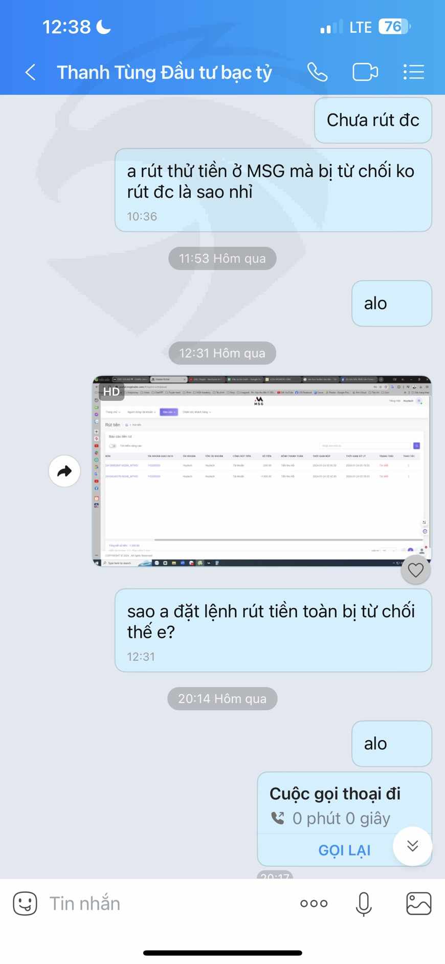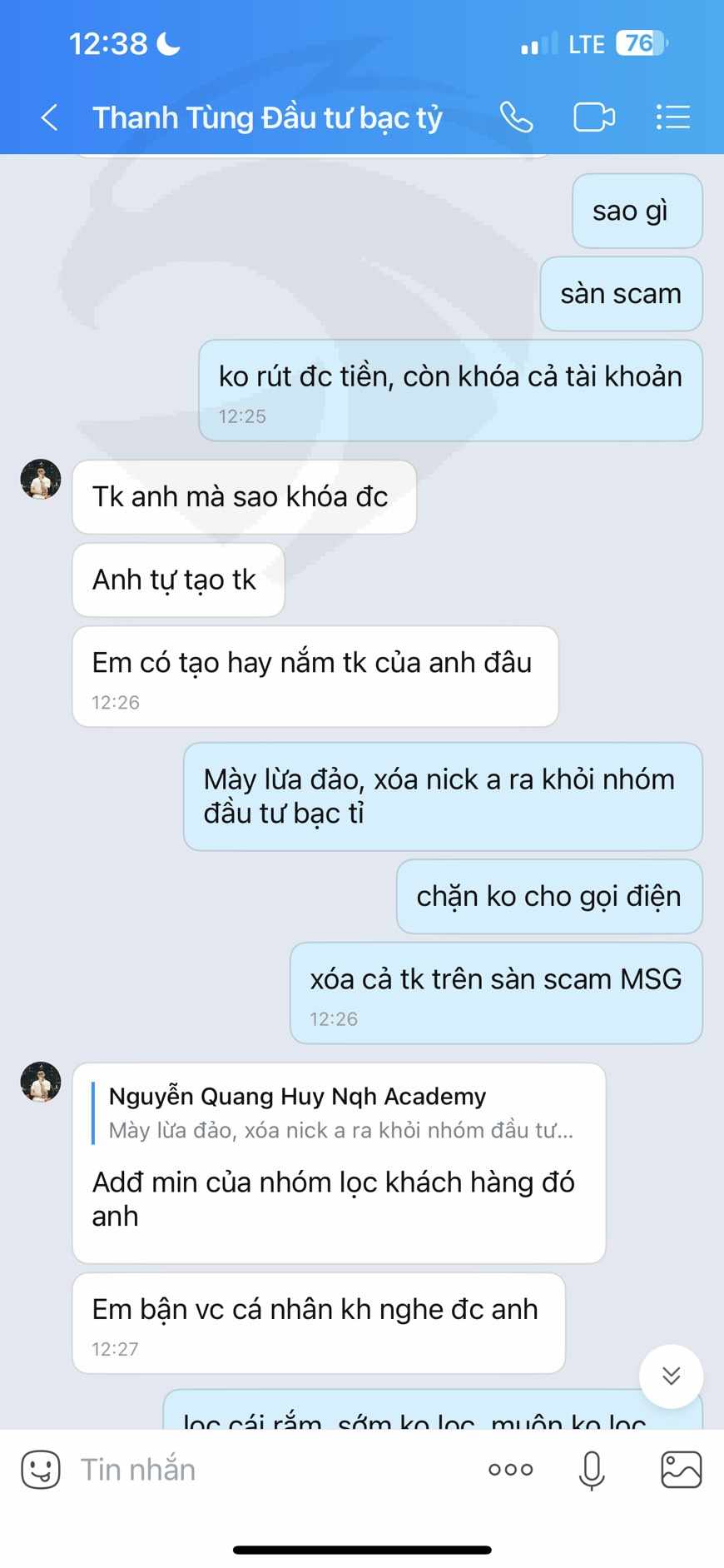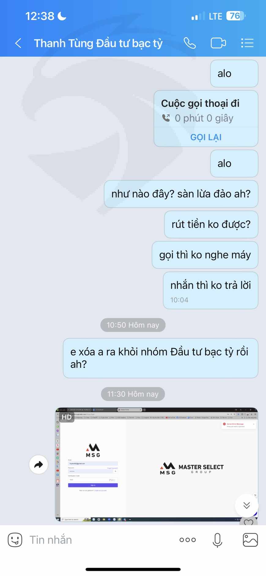 Cảnh báo sàn scam: MSG (Master Select Group) website: https://msgtrader.comKhông rút được tiền, IB lừa đảo, sàn xóa tài khoản của người chơi.Tôi tên Nguyễn Quang Huy, có được 1 bạn là thanh Tùng (admin của nhóm zalo: Đầu tư bạc tỉ) liên hệ và tư vấn mua tool Take propips trading managerment solutions với giá 300$ với điều kiện nạp tiền vào sàn MSG (https://msgtrader.com/) để trade. Khi đó tôi check sàn MSG trên WikiFX thấy điểm số vẫn trên 7 điểm nên tin tưởng. Hơn nữa số tài khoản nạp tiền để mua tool là tk công ty nên tin tưởng.CÔNG TY CỔ PHẦN ĐẦU TƯ - ĐÀO TẠO QUỐC TẾ VTRADERhttps://infodoanhnghiep.com/thong-tin/CONG-TY-CO-PHAN-DAU-TU-DAO-TAO-QUOC-TE-VTRADER-86210.htmlSau đó tôi nạp 1000$ vào sàn MSG và giao dịch vào ngày 9/1/2024. Đến ngày 23/1/2024, tài khoản của tôi đã có lợi nhuận là hơn 400$. Khi đó tôi làm lệnh rút tiền nhưng thấy thông báo từ chối. Tôi làm lại lệnh rút tiền khác 200$ cũng thấy từ chối.Tôi đã liên hệ với người giới thiệu những không liên lạc được, còn bị xóa ra khỏi nhóm zalo "Đầu tư bạc tỉ"Tôi chat với support của sàn MSG thì được thông báo là cổng thanh toán đang bảo trì, kiên nhẫn chờ đợi. Tôi đã chờ đến hôm sau để rút tiền lại thì tiếp tục bị từ chối. Chat với support thì được thông báo là liên hệ với người giới thiệu. Nhưng tôi không thể liên hệ với người giới thiệu, bị chặn 1 chiều gọi.Đến 12h ngày 25/1/2024 thì tôi liên hệ được với người giới thiệu, lúc này tôi yêu cầu hỗ trợ thì họ không hỗ trợ, trả lời chung chung kêu bận công việc không nghe điện thoại được (thực tế là chặn chiều gọi của tôi). Hiện tôi đã chính thức xác nhận đây là sàn lừa đảo, scam. Nạp vào không rút ra được, xóa tài khoản của khách hàng, trả lời hỗ trợ vòng vo, bên sàn thì báo liên hệ với người giới thiệu, người giới thiệu thì nói liên hệ với sàn. Ace lưu ý tránh tuyệt đối không nên tham gia vào sàn MSG (Master Select Group) website: https://msgtrader.com ra nhé.Sau vài tiếng thì support nói do đại lý đã thay đổi email đăng nhập của tôi. Support nói đã thay đổi lại email cho tôi và tôi có thể dăng nhập lại. Nhưng khi tôi đăng nhập lại thì thấy tiền đã bị rút hoàn toàn khỏi tài khoản, trong lịch sử rút tiền thì lại không hề ghi nhận việc rút tiền. Support báo chờ để họ kiểm tra, nhưng chờ hoài không thấy. Tôi có đầy đủ bằng chứng để có thể cung cấp và đối chứng là sàn scam,