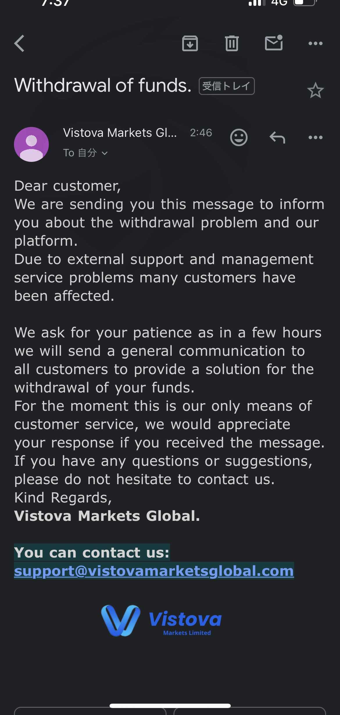 到现在为止我还没能把钱取出来,我已经交了税但是钱还没有到。我们收到了来自 Vistova 执行团队的新消息,称他们将向所有客户发出一般性通知,以提供提款解决方案。由于出现问题,他们只会通过电子邮件回复。这是一场噩梦