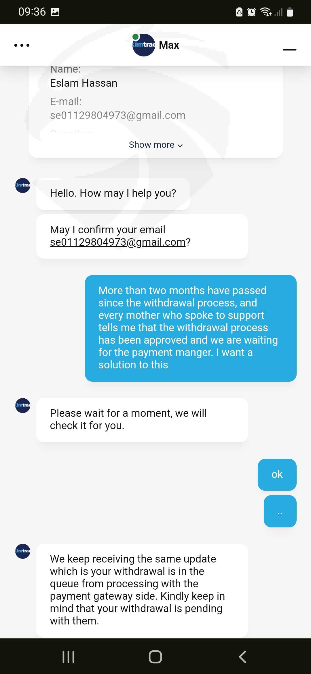 我从2月23日开始提款,现在已经过去两个多月了,还没有任何消息。每次我联系客服,他们都告诉我提款流程已获批准,我们正在等待对于支付提供商来说。我希望能够解决这个问题,因为这个经纪人是一个骗子,一个骗子。